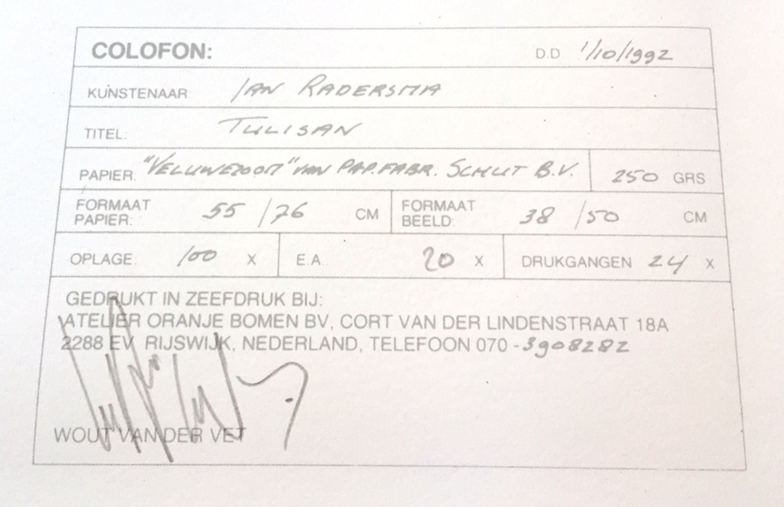 • Zeefdruk is door meesterzeefdrukker Wout van der Vet met de hand gedrukt op geschept papier en genummerd en gesigneerd met potlood door de kunstenaar.
