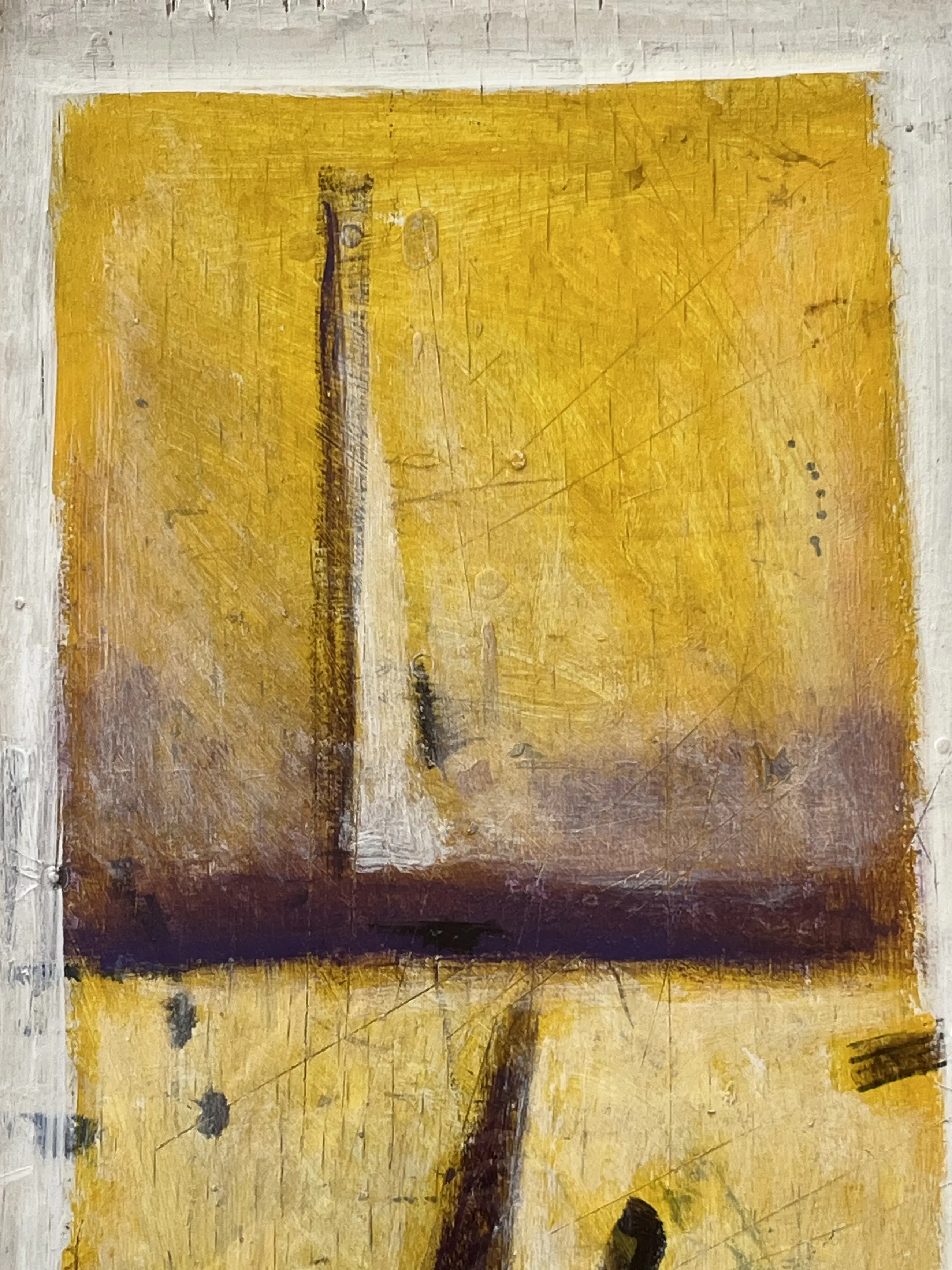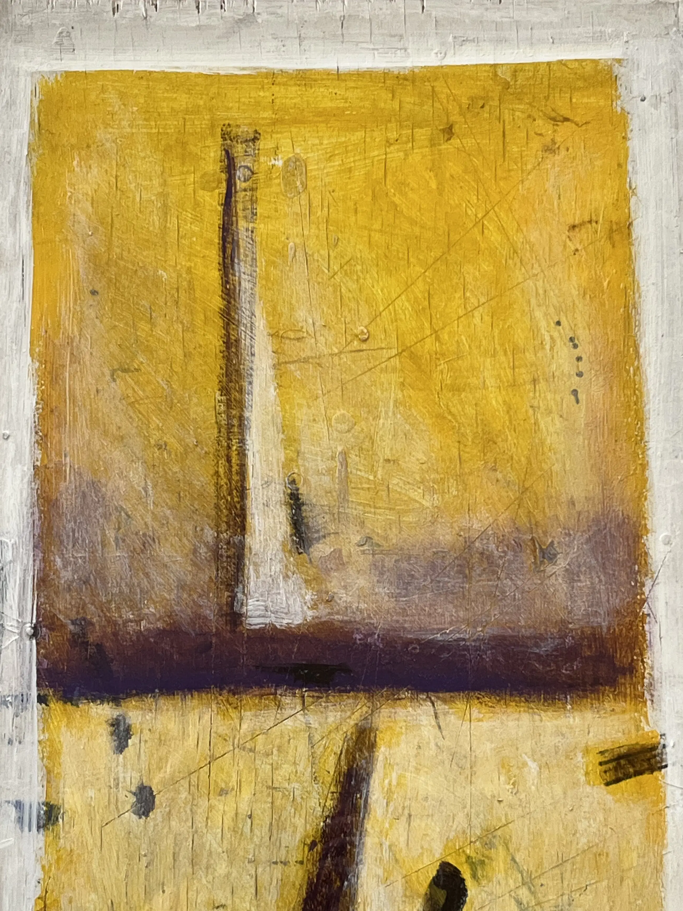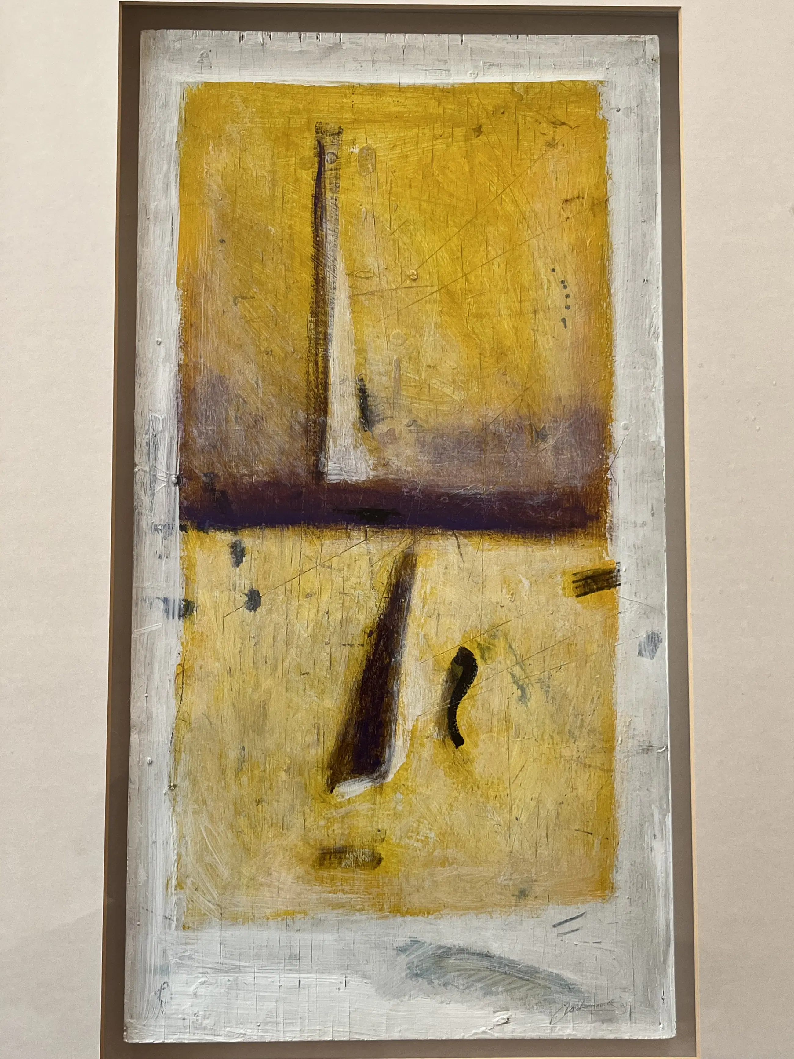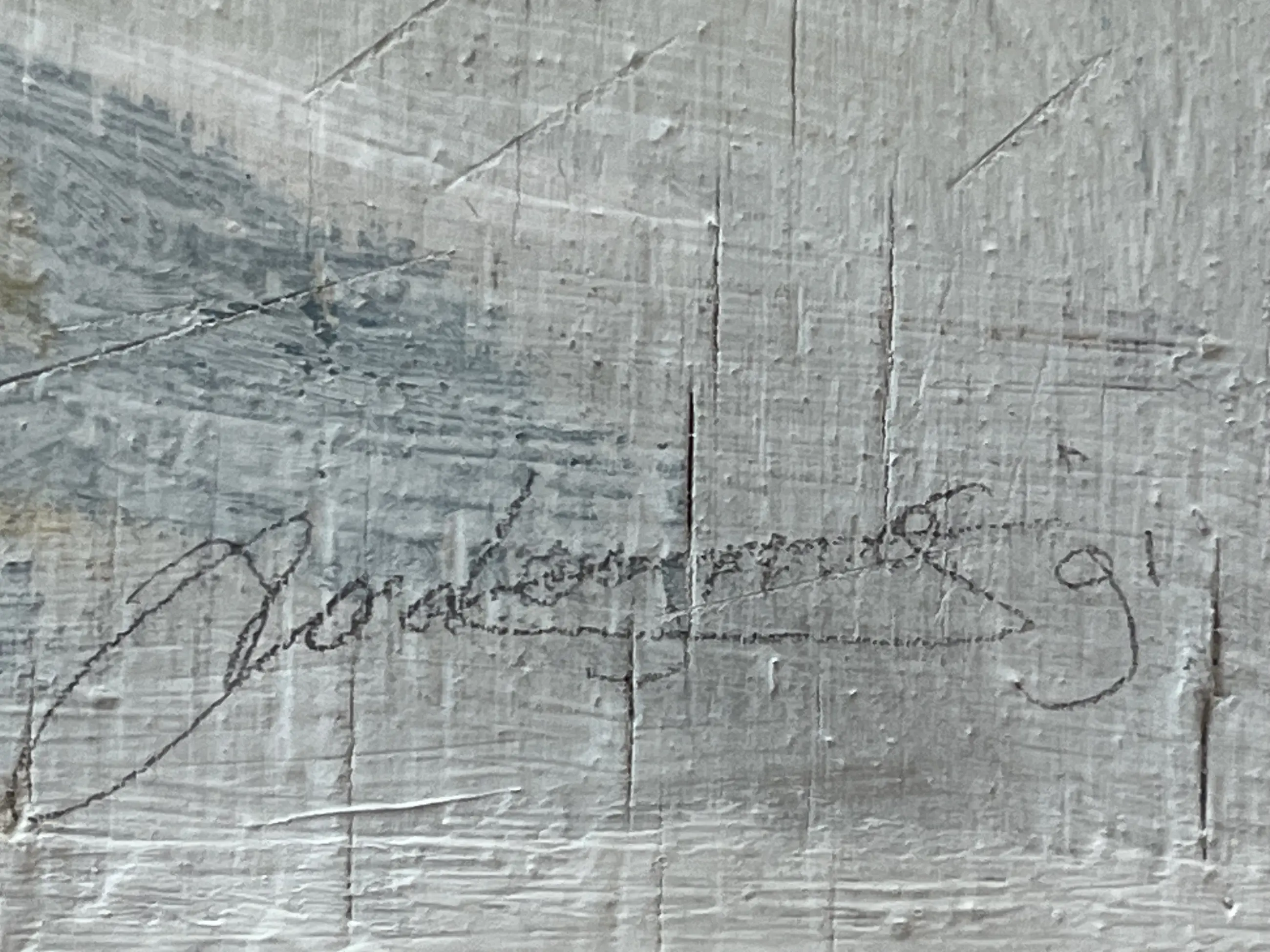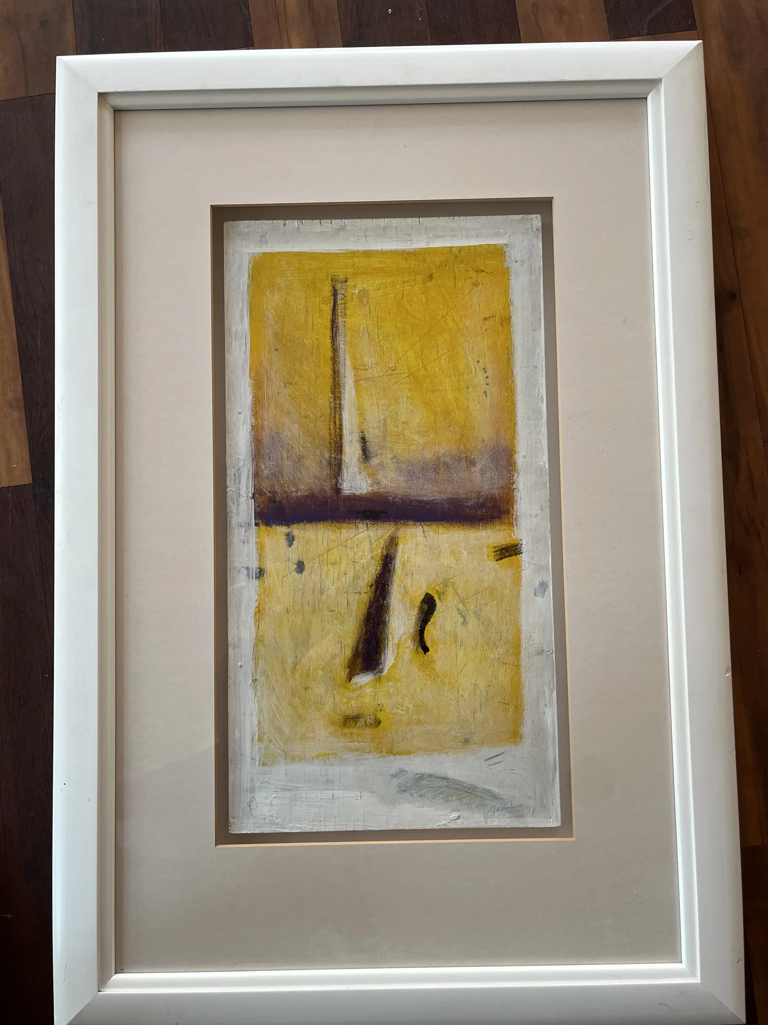 Olie op paneel uit 1991. Verdiept gelijst in witte hout/kunststof lijst. Werk is behoorlijk zwaar. Afmeting werk 64,5 x 34,5 cm. Inclusief lijst 104 x 71 cm.