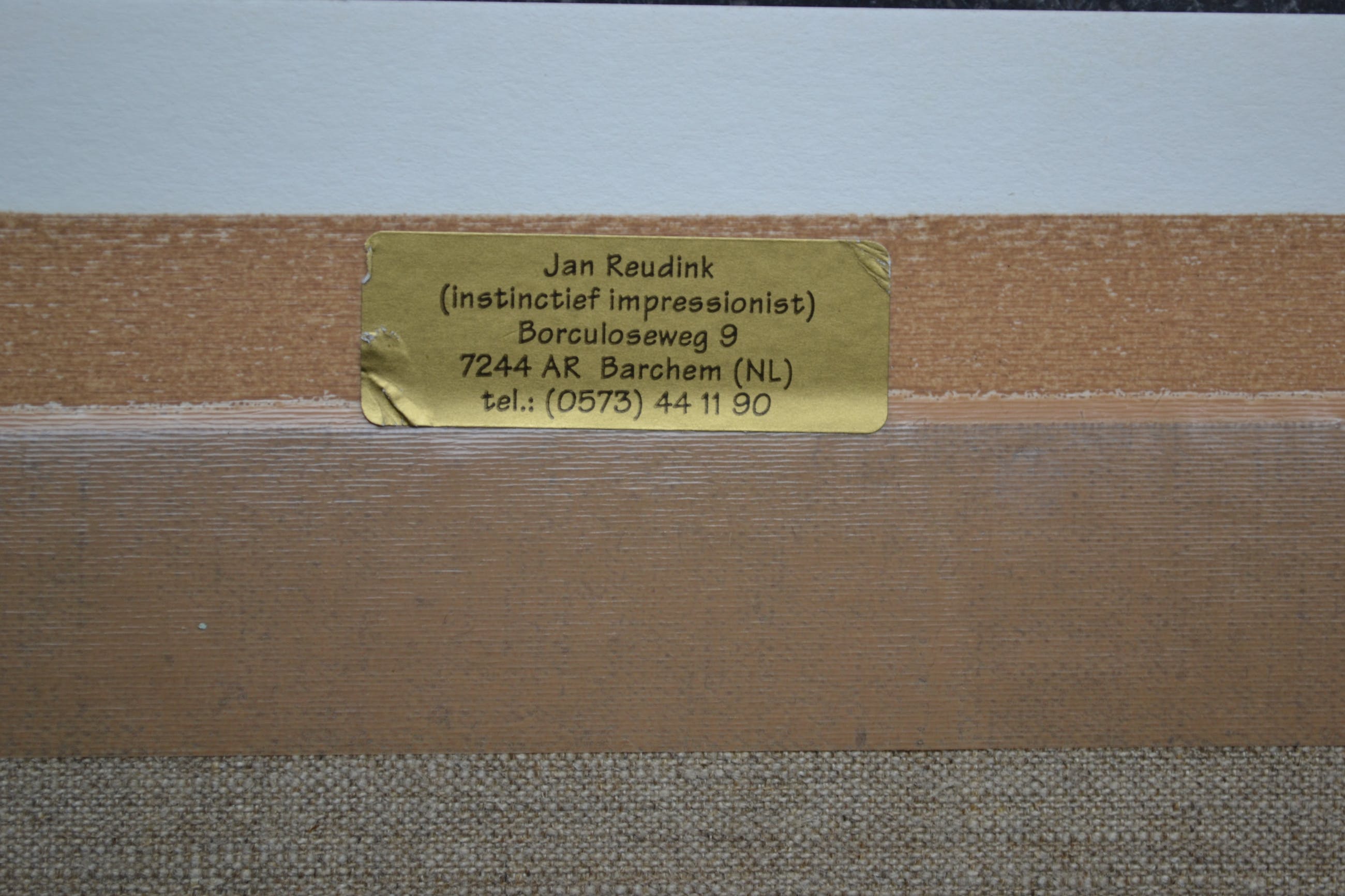 Reudink (1939) is geboren in Lochem (NL) en woont en werkt in Sachsenburg in Oberkärnten (A) en in Ruurlo (NL). Landschap-schilderen en onophoudelijk schetsen vormden hem om uiteindelijk uit te komen bij abstracte werken met een diepe innerlijke emotionele belevenis. Soms moeilijk te lezen, maar verstaat men de plot, dan is het werk onlosmakelijk met de aanschouwer verbonden. Jan Reudink wil zijn gevoelsleven in zijn werk tot uitdrukking brengen en dat lukt hem. Daarbij geeft hij zich bloot.