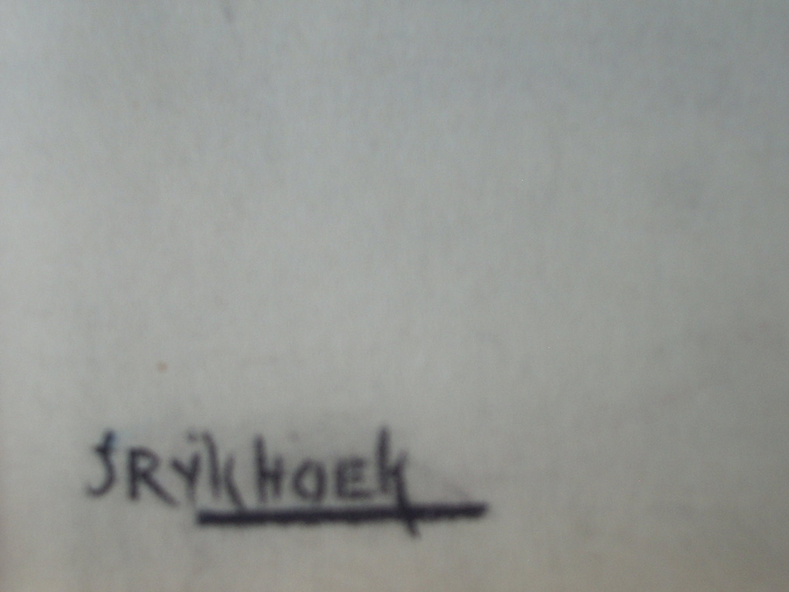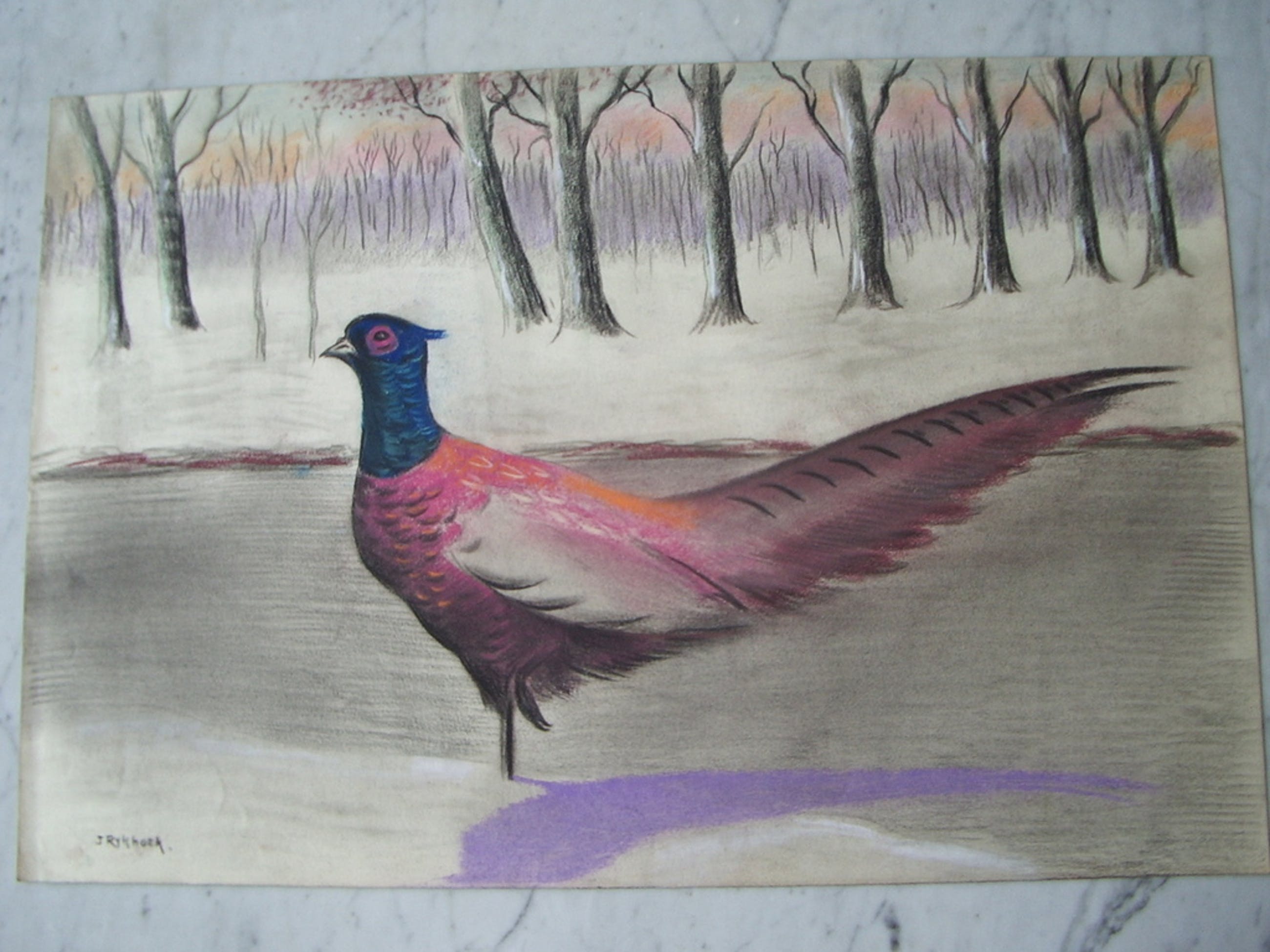 De Rotterdamse kunstenaar Jan Rijkhoek werd vooral bekend door zijn vogel-afbeeldingen met Conté-potlood / pastel op papier, waarvan dit werk ( 32 x 48 ) een goed voorbeeld is. Naar schattting is dit werk van rond 1940, terwijl de werkzame jaren van Rijkhoek liggen in de periode 1940 - 1970. Het werk is l.o. gesigneerd.