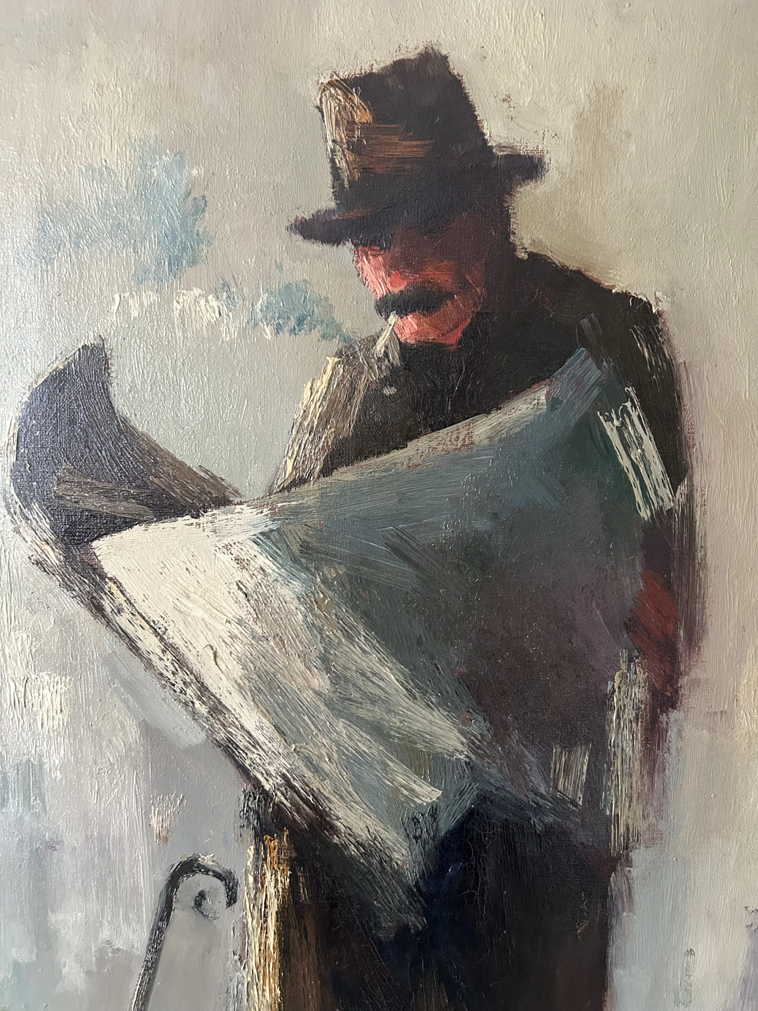 Een mooie olieverf op doek. Een heer die de krant leest.
