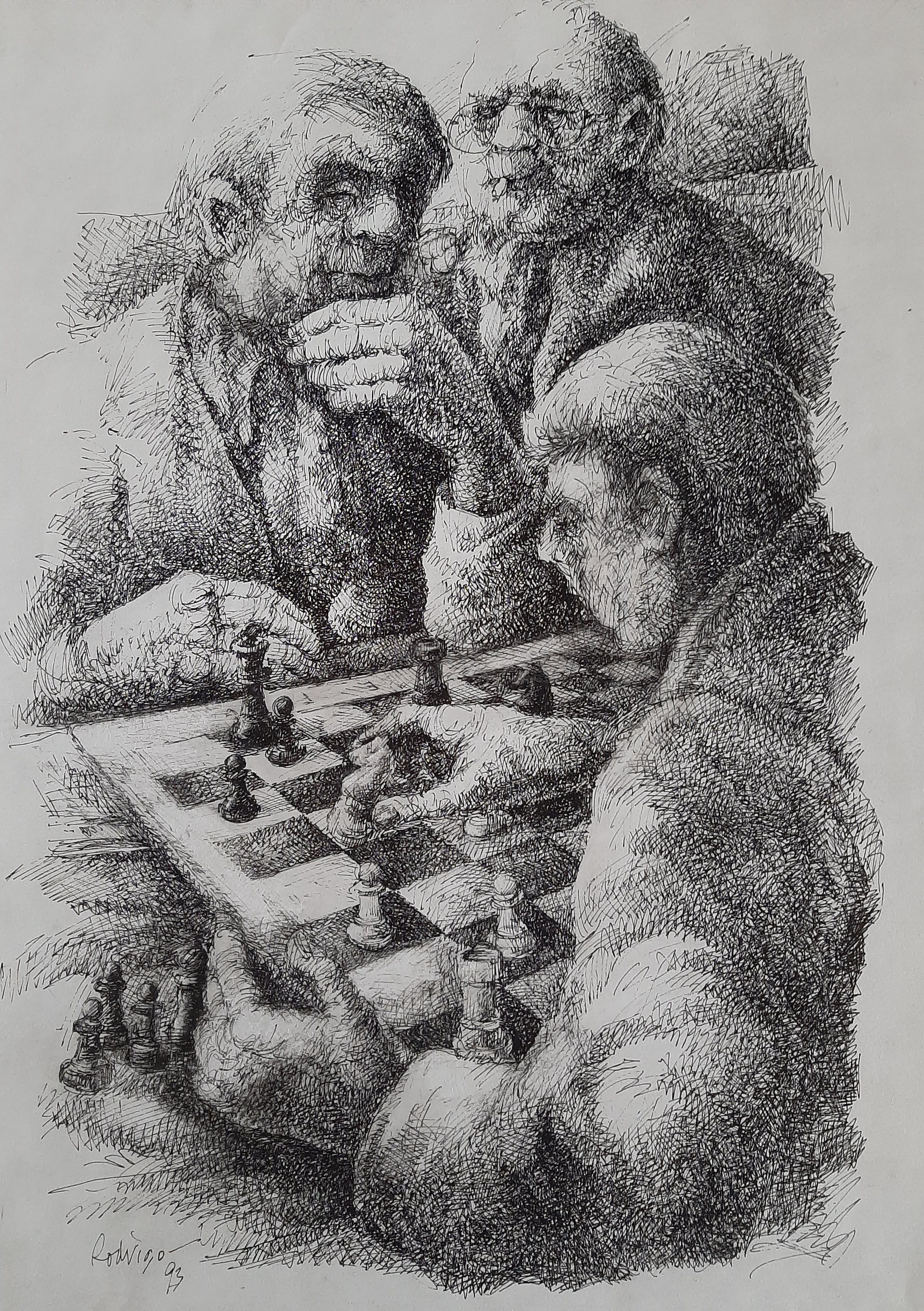 Prachtige tekening van de Utrechtse kunstenaar Jan Rodrigo, gesigneerd en gedateerd 1993. Deze tekening staat ook afgebeeld op pagina 85 in het boek dat in 2012 is verschenen over de schilder. Dit boek wordt bij de tekening geleverd.