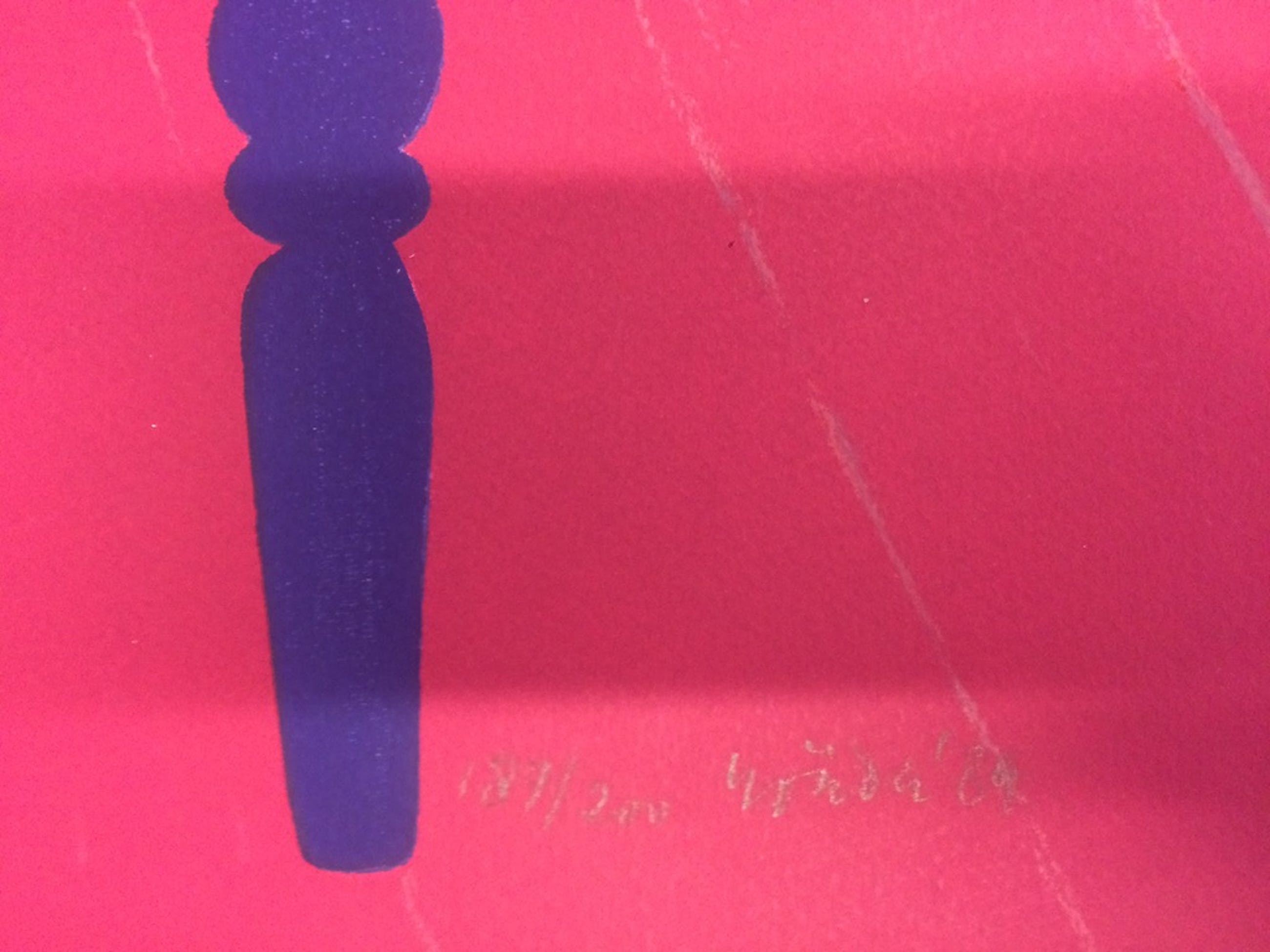 Leuke zeefdruk van Jan Roede. Het werk kan worden opgehaald met lijst en kan zo aan de muur. De witte Barthlijst meet 80 x 100 cm en om het werk zit een zuurvij passe partout. De prentmaat is ca. 58 x 78 cm. Het werk kan bij voorkeur worden opgehaald bij galerie Rotor in Arkel of via Swifft koeriers tegen een meerpijs worden afgeleverd. Genummerd 178/200 en gesigneerd.