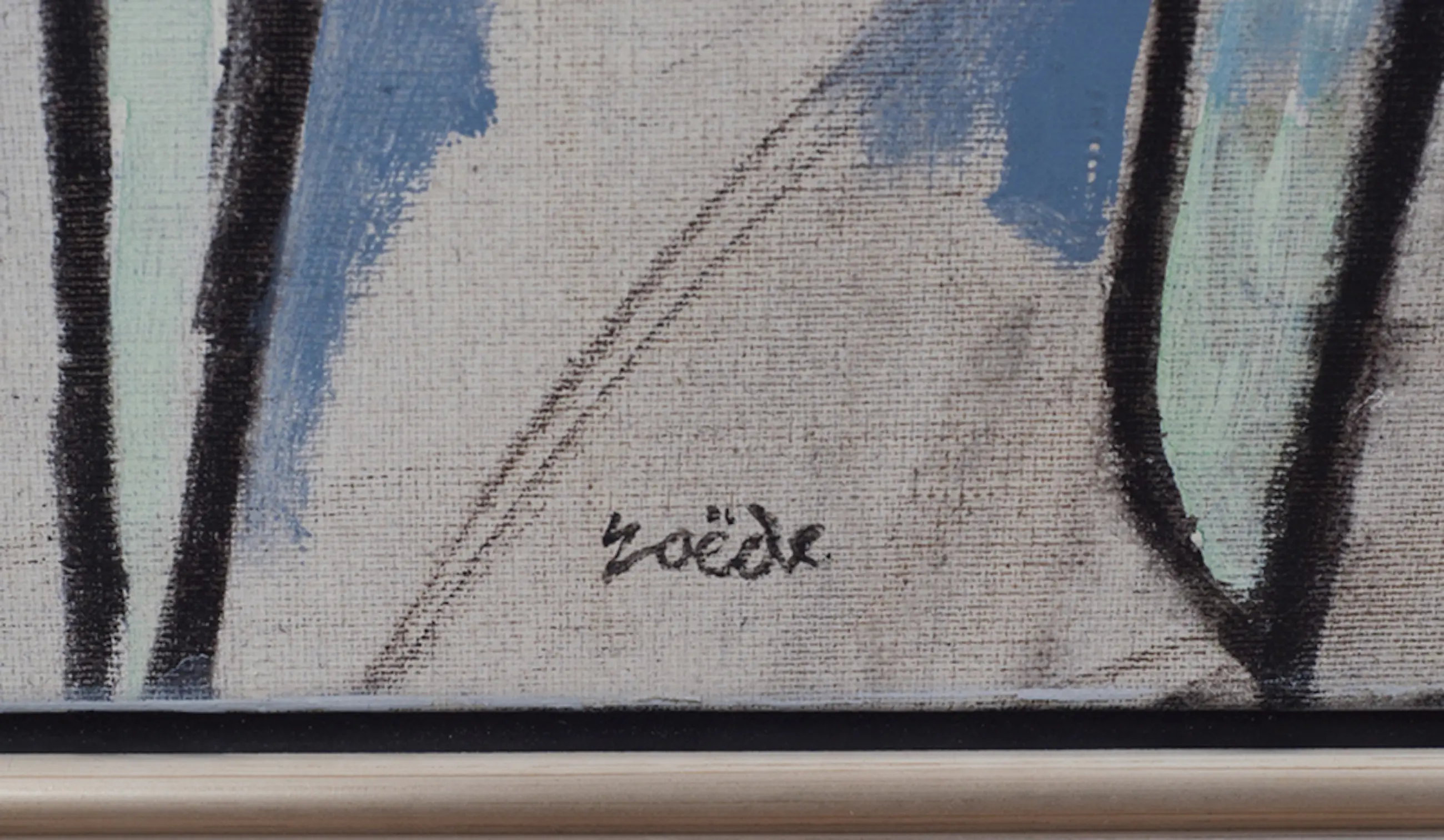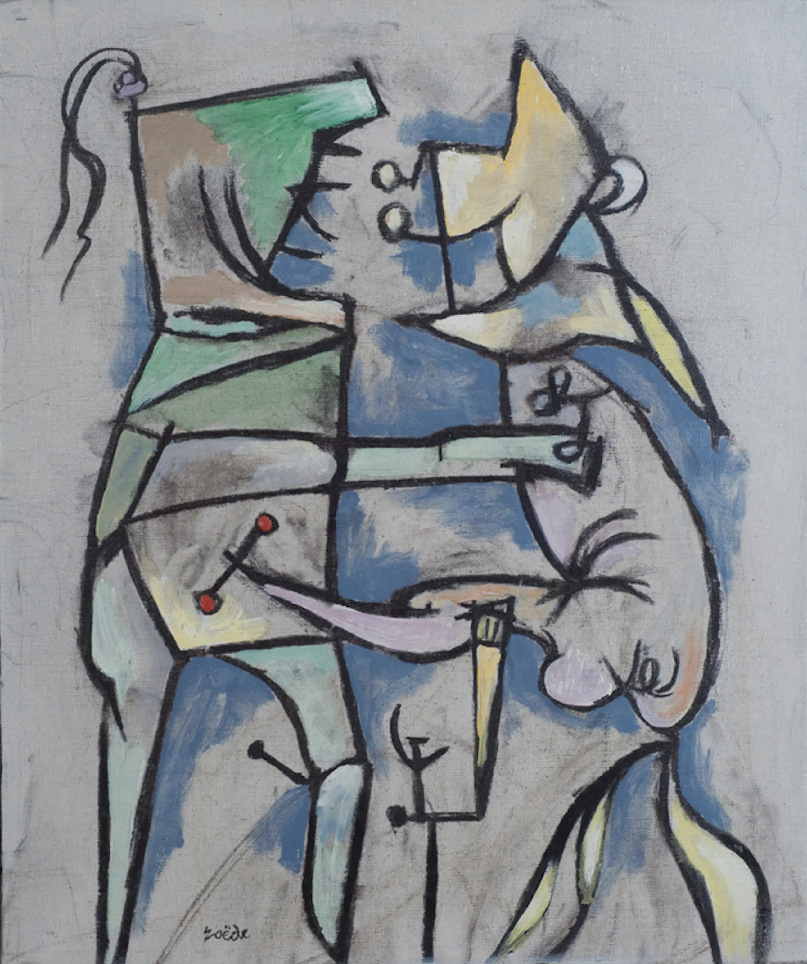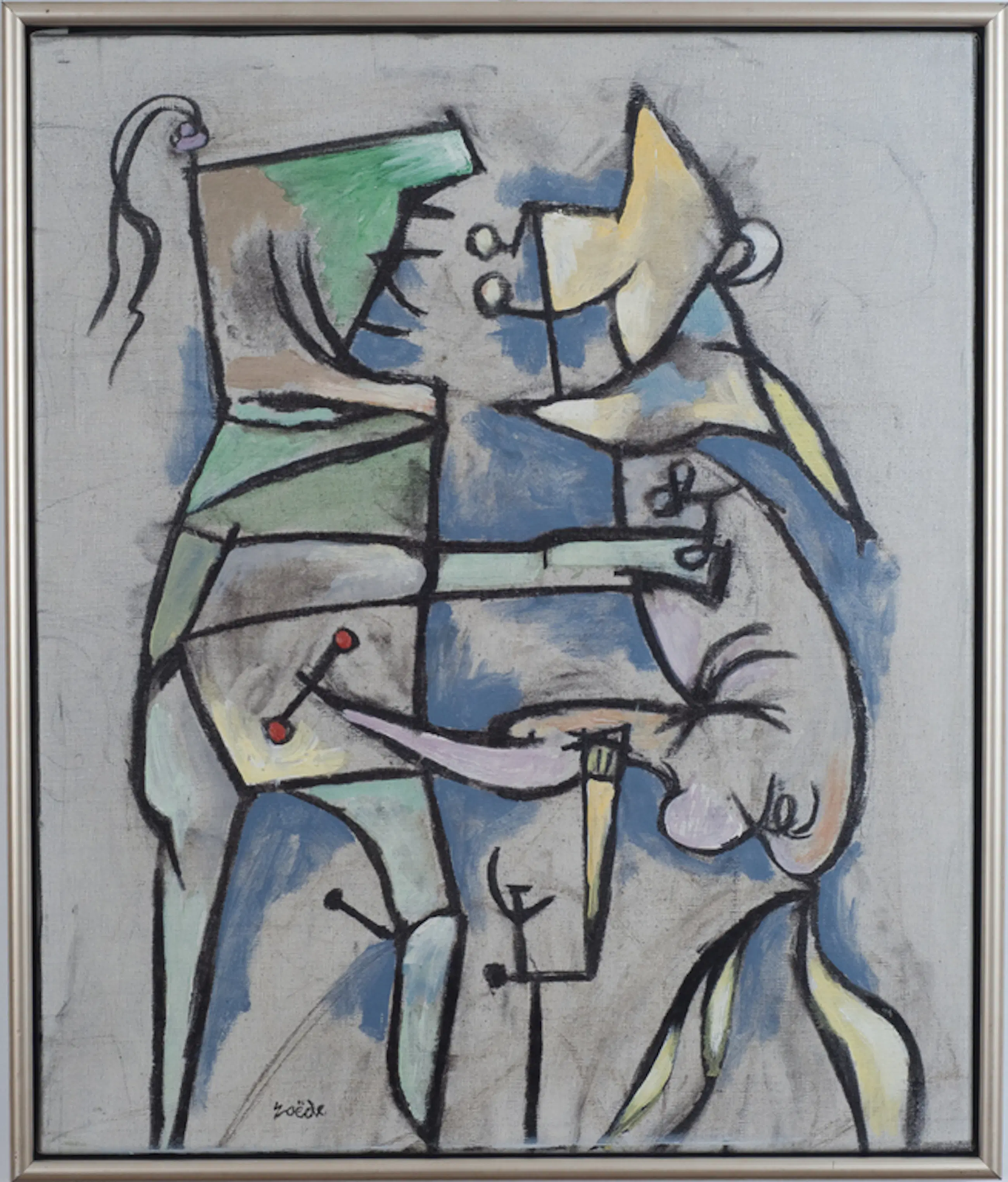 Prachtig figuratief surrealistisch schilderij van deze bekende schilder. Aan dit schilderij is goed te zien dat hij o.a. werd beïnvloed door Miro. Jan Roëde (1914 - 2007) zocht naar vormen die niet van buiten kwamen, maar uit hemzelf. Zo ontwikkelde hij een heel eigen stijl. Speels en altijd met een glimlach schilderde hij mens- en dierfiguren in niet-naturalistische kleurcomposities. Het werk van Roëde is kleurrijk, lichtvoetig, poëtisch, wars van ernst en zwaarte. In 1968 wijdde het Haags Gemeentemuseum een eerste overzichtstentoonstelling aan zijn werk. Andere belangrijke tentoonstellingen volgden o.a. 1988 (Haags Gemeente-museum) en 1999 (Cobramuseum Amstelveen). Hij werd geboren in Groningen, maar woonde vanaf zijn 4e zijn hele leven in Den Haag. Roëde wordt daarom gerekend tot de 2e Haagse school. Diverse belangrijke musea hebben werk van zijn hand. O.a. Het Haags Gemeentemuseum en het Stedelijk Museum Schiedam.