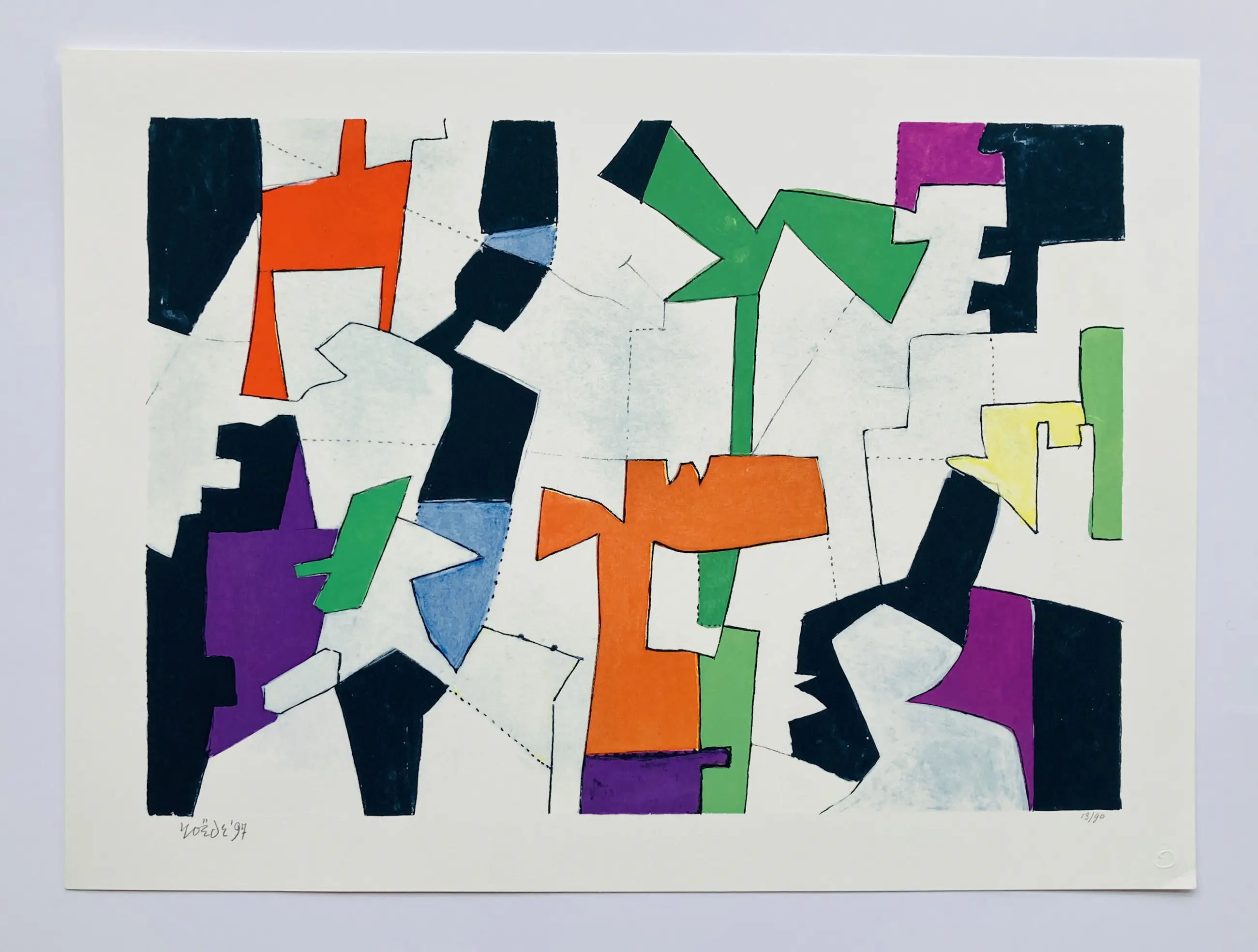 Een kleurrijke zeefdruk van de Nederlandse kunstenaar Jan Roëde (1914 - 2007). Het werk verkeert in uitstekende conditie en is handgesigneerd door de kunstenaar.