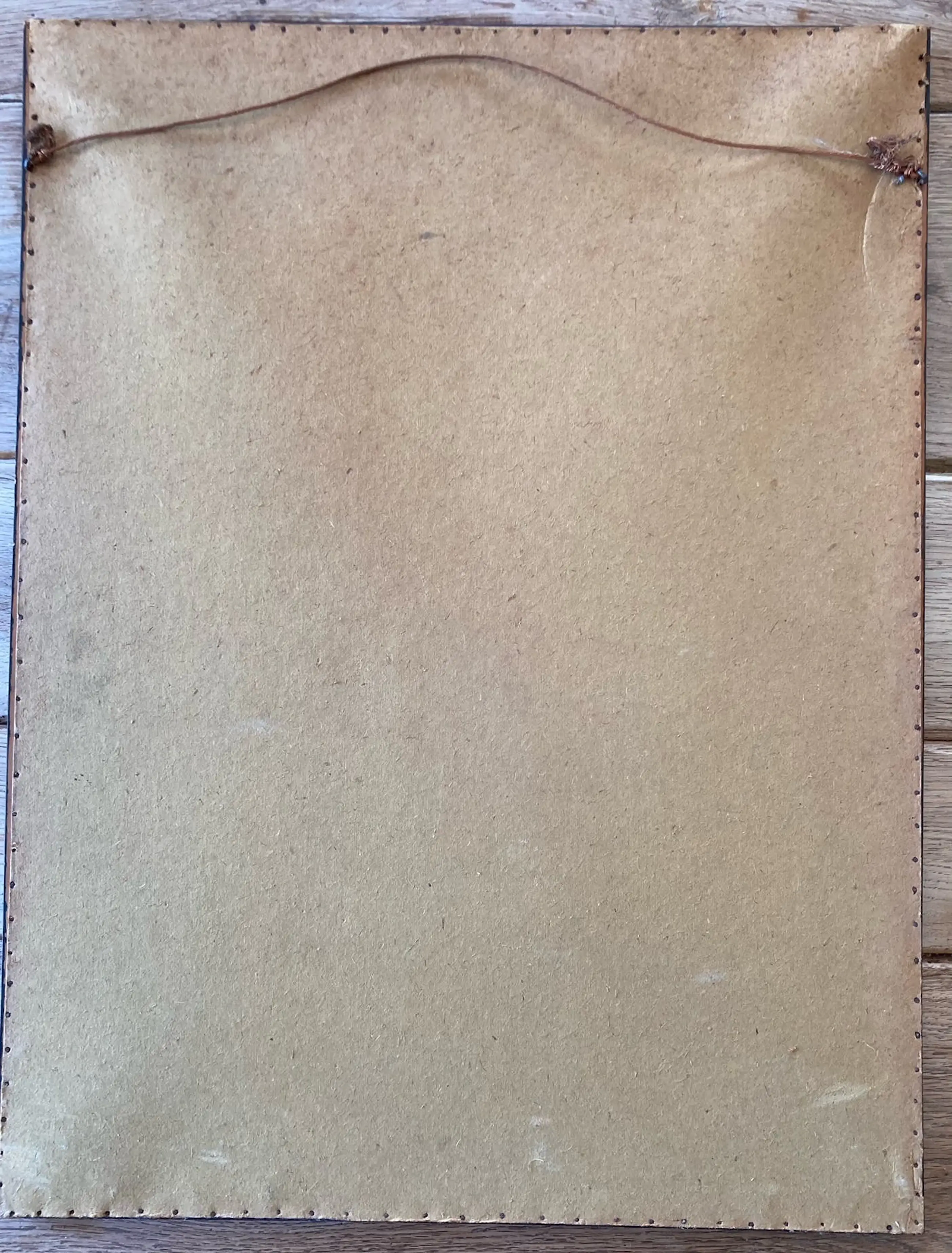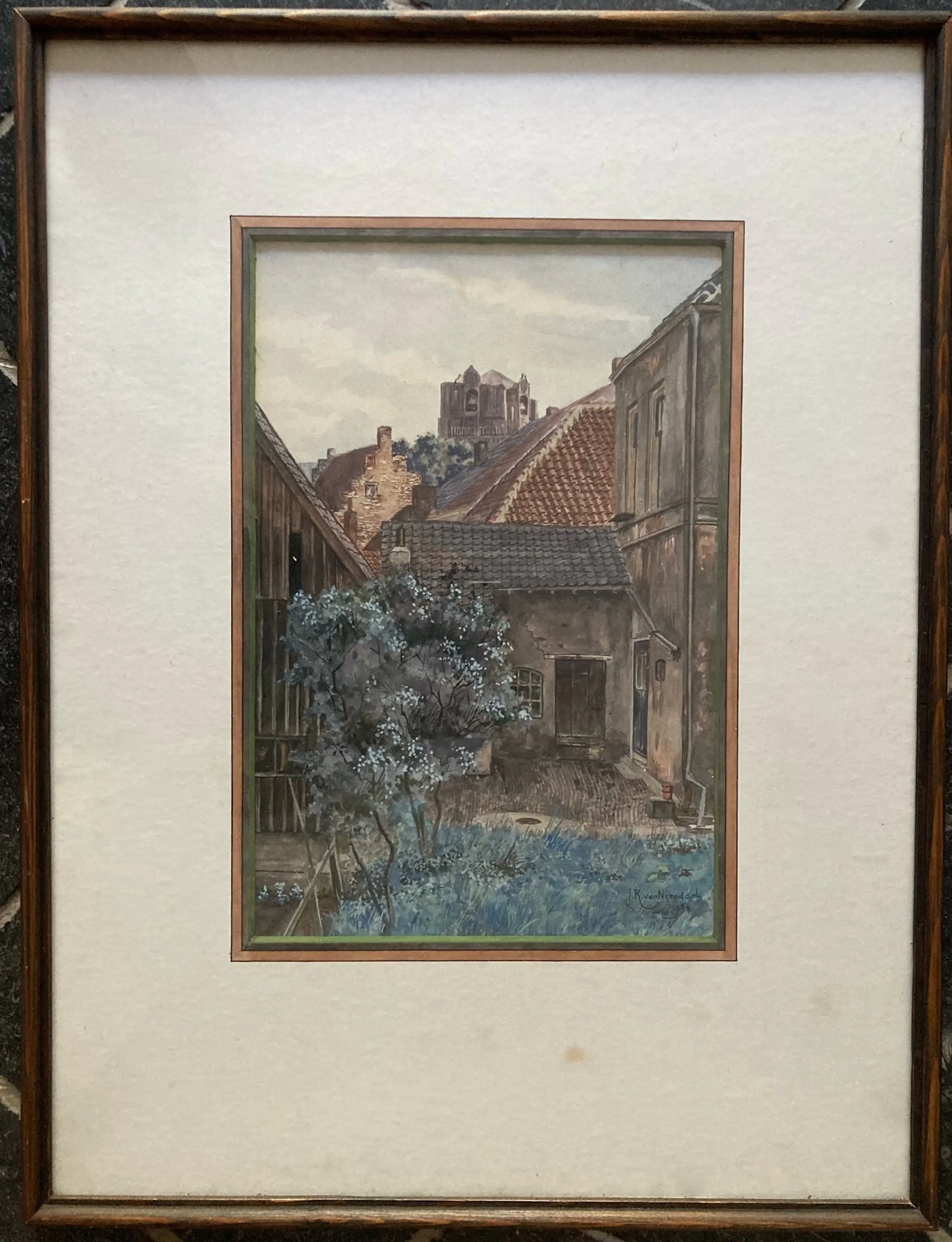 De aquarel is ingelijst en zit achter glas. Aan de bovenzijde (in de lucht) van het werk zit een verkleuring, net als in het passe-partout. De reflectie in het grijze dak is van de camera waarmee de foto's zijn genomen.
