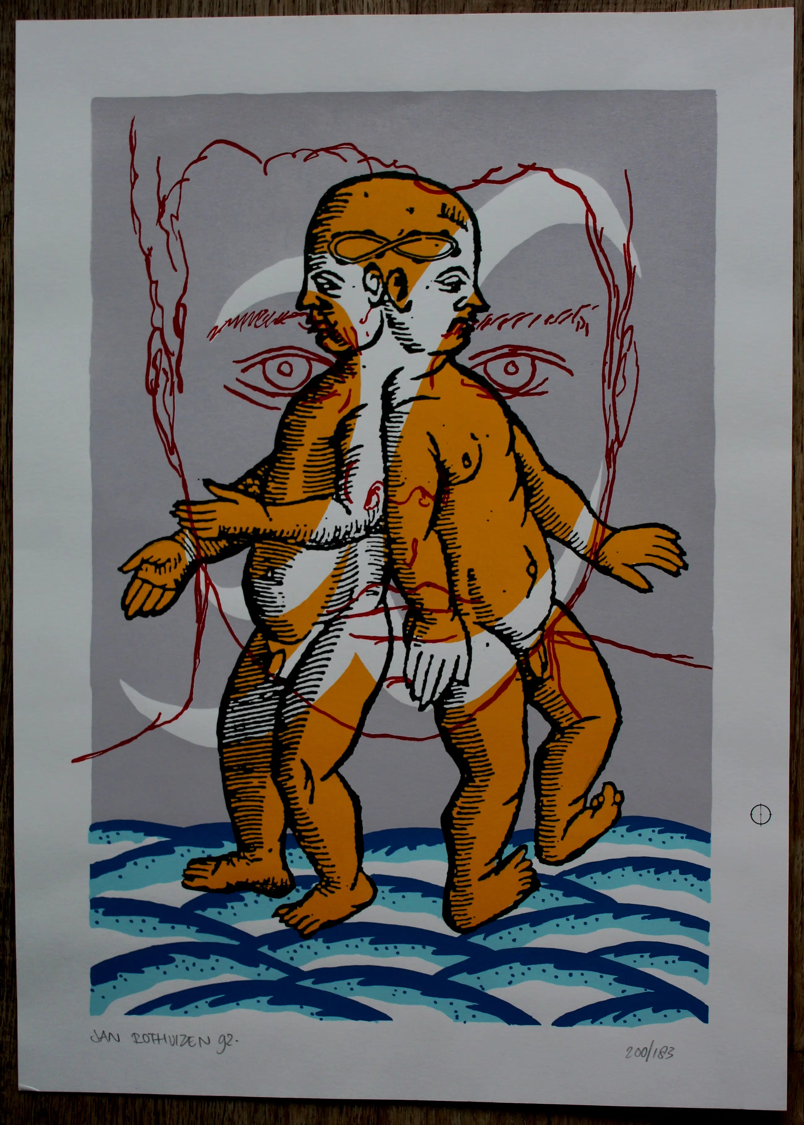 Zeefdruk van Jan Rothuizen uit 1992. Voorstelling van een siamese tweeling, achter een lineair portret van een man. Oplage: 183/200. Afmetingen blad: H42.5 x b30.5cm. Afmetingen voorstelling: H36.5 x b24cm. Het werk is links onderaan, gesigneerd door de kunstenaar. De authenticiteit van het, aangeboden, werk wordt volledig gegarandeerd. Een certificaat van echtheid kan, op aanvraag, worden gemaild.