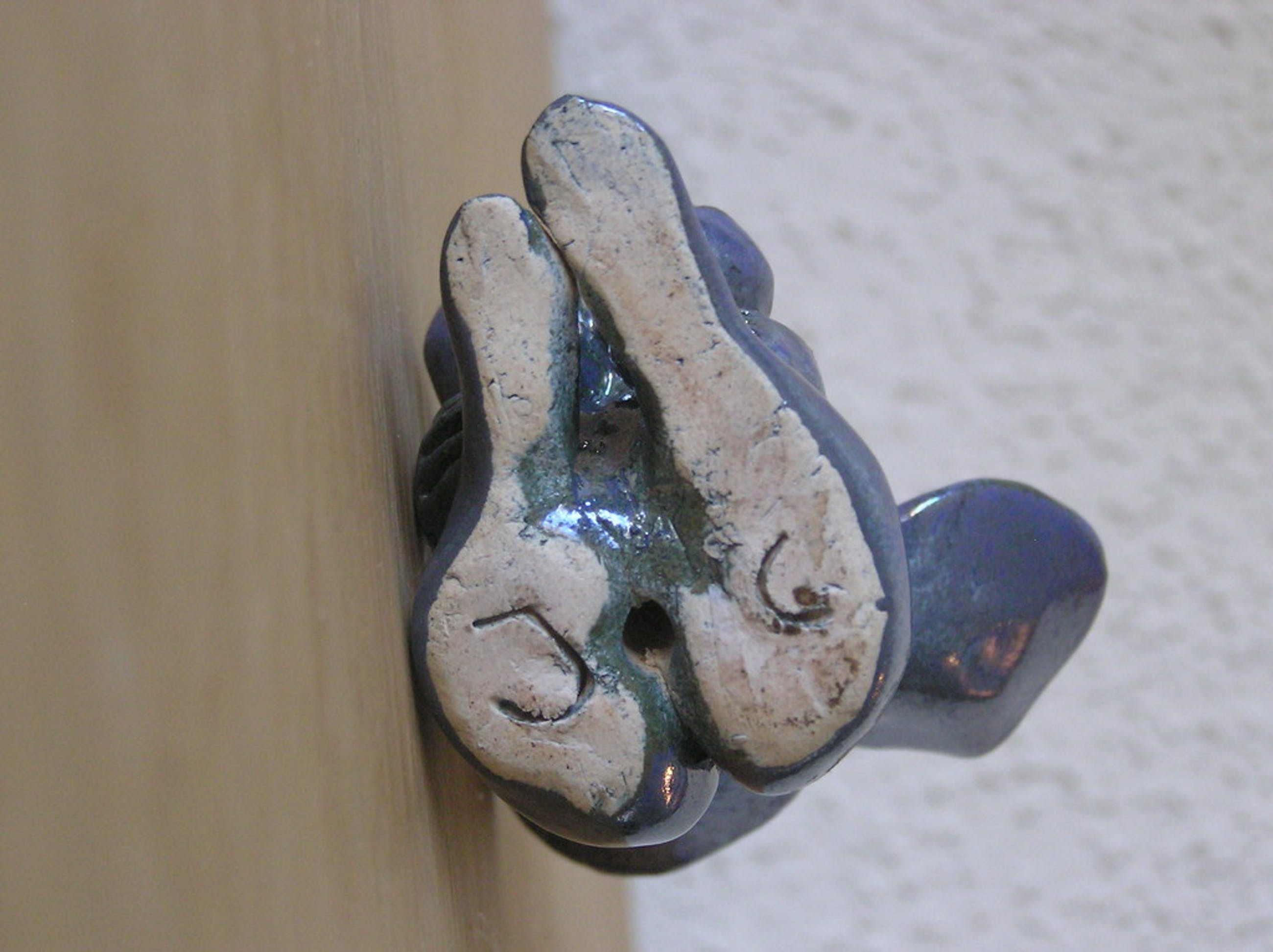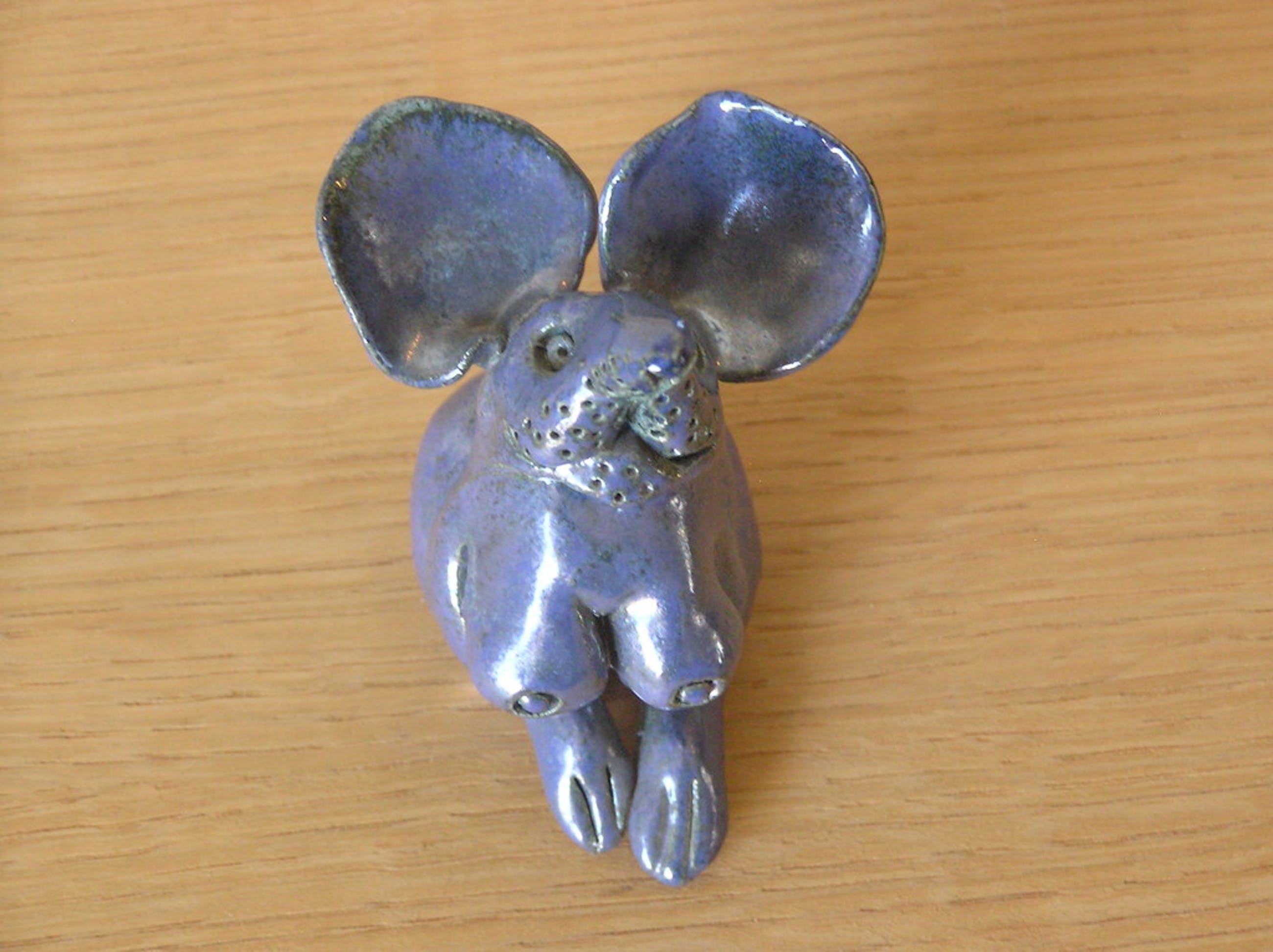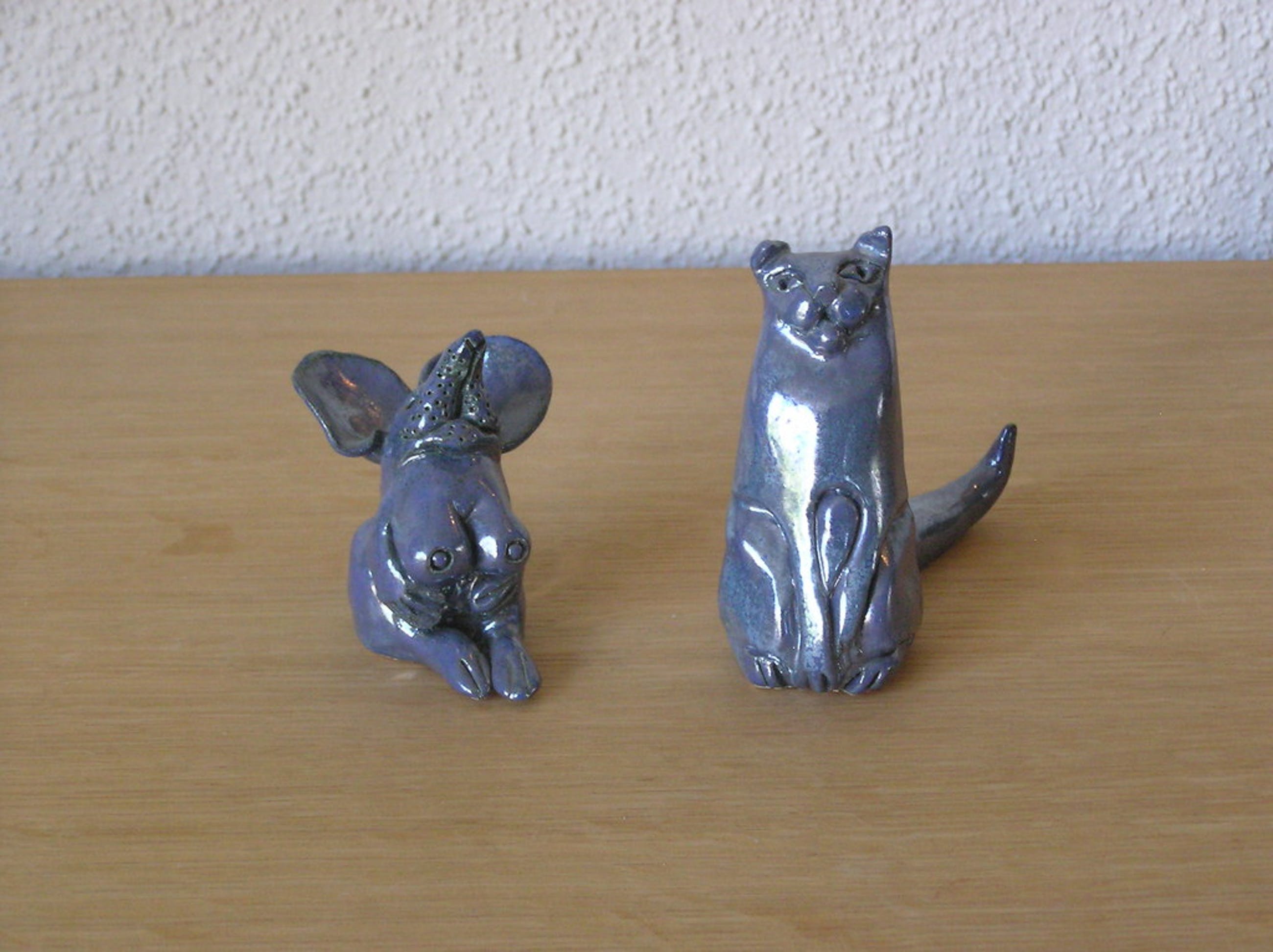 Jan Saarloos - Kunstkeramieken figuur van een muis en een kat. Mooi gemaakt, zijn ook wel komisch. Voorzien van paarsblauw lusterglazuur.