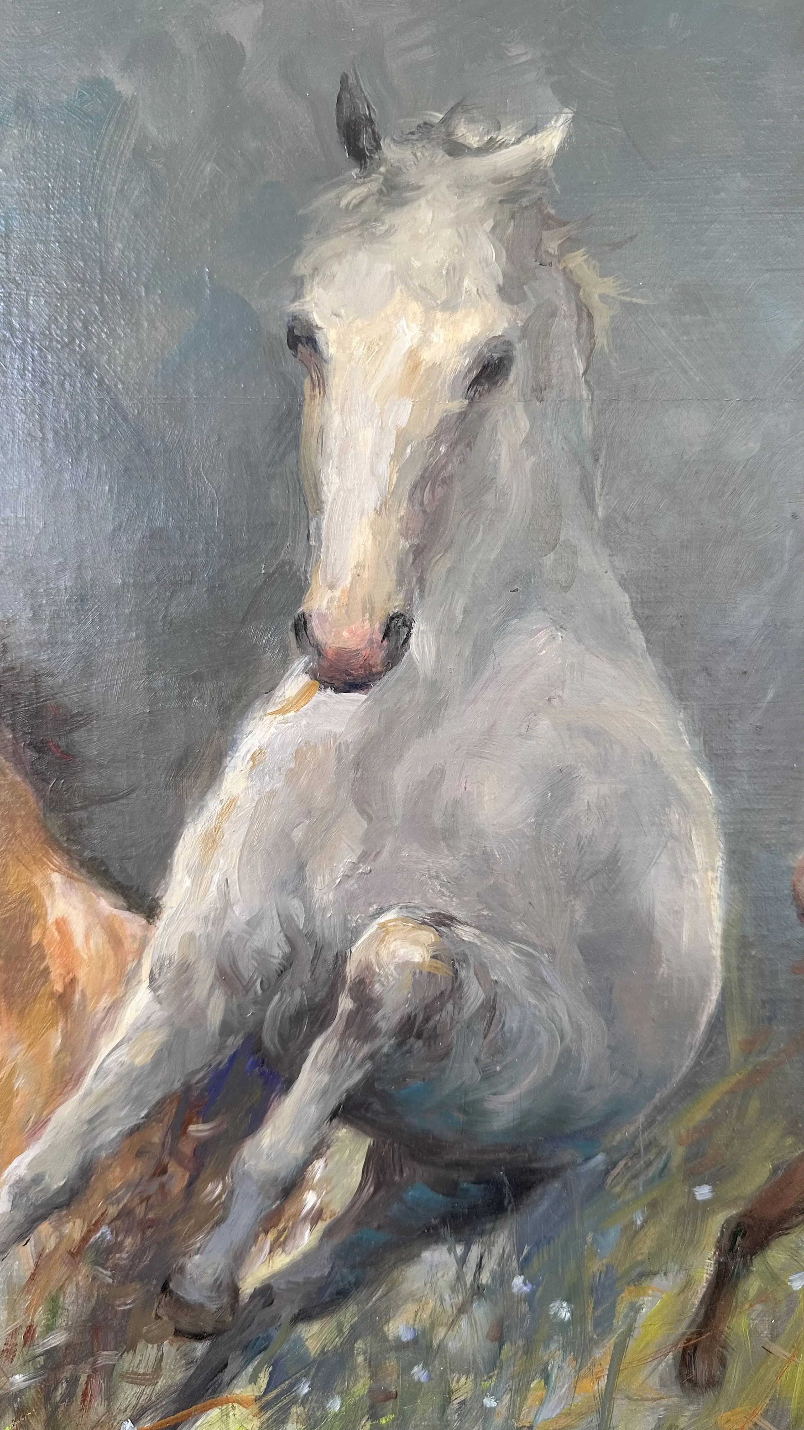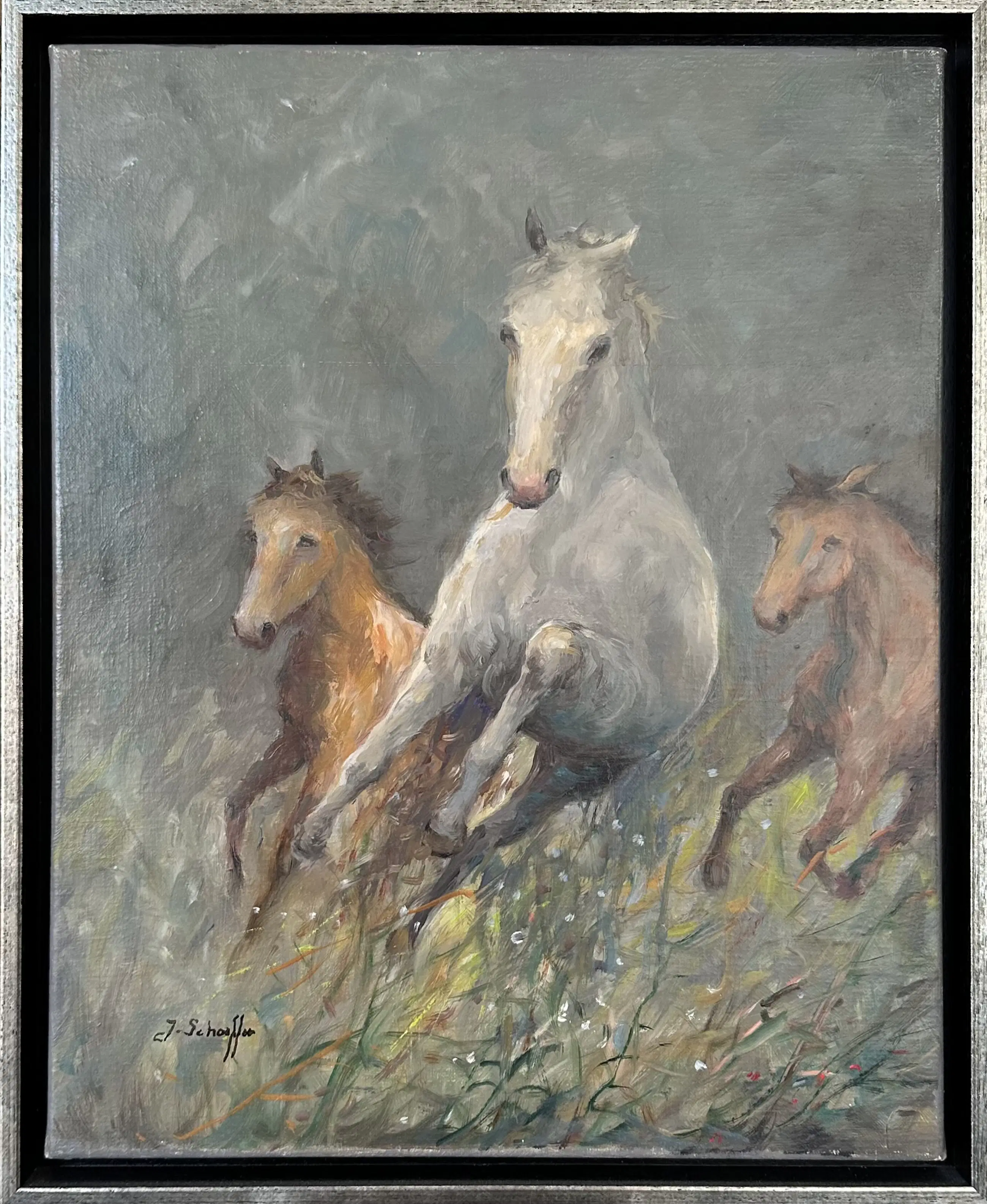 Drie dravende paarden geschilderd door Jan Schaeffer. Het schilderij is in nieuwstaat en is onlangs voorzien van een baklijst,
