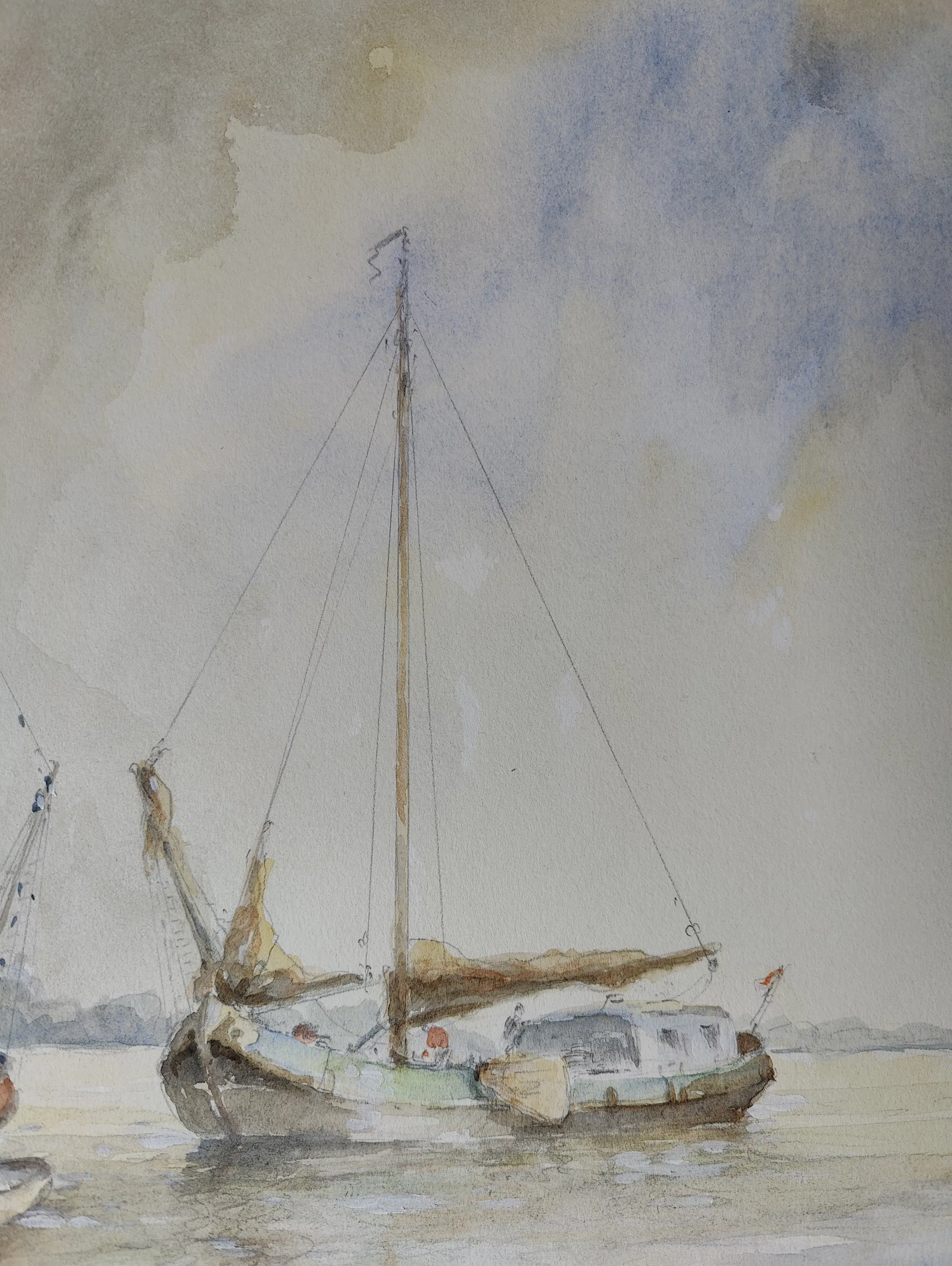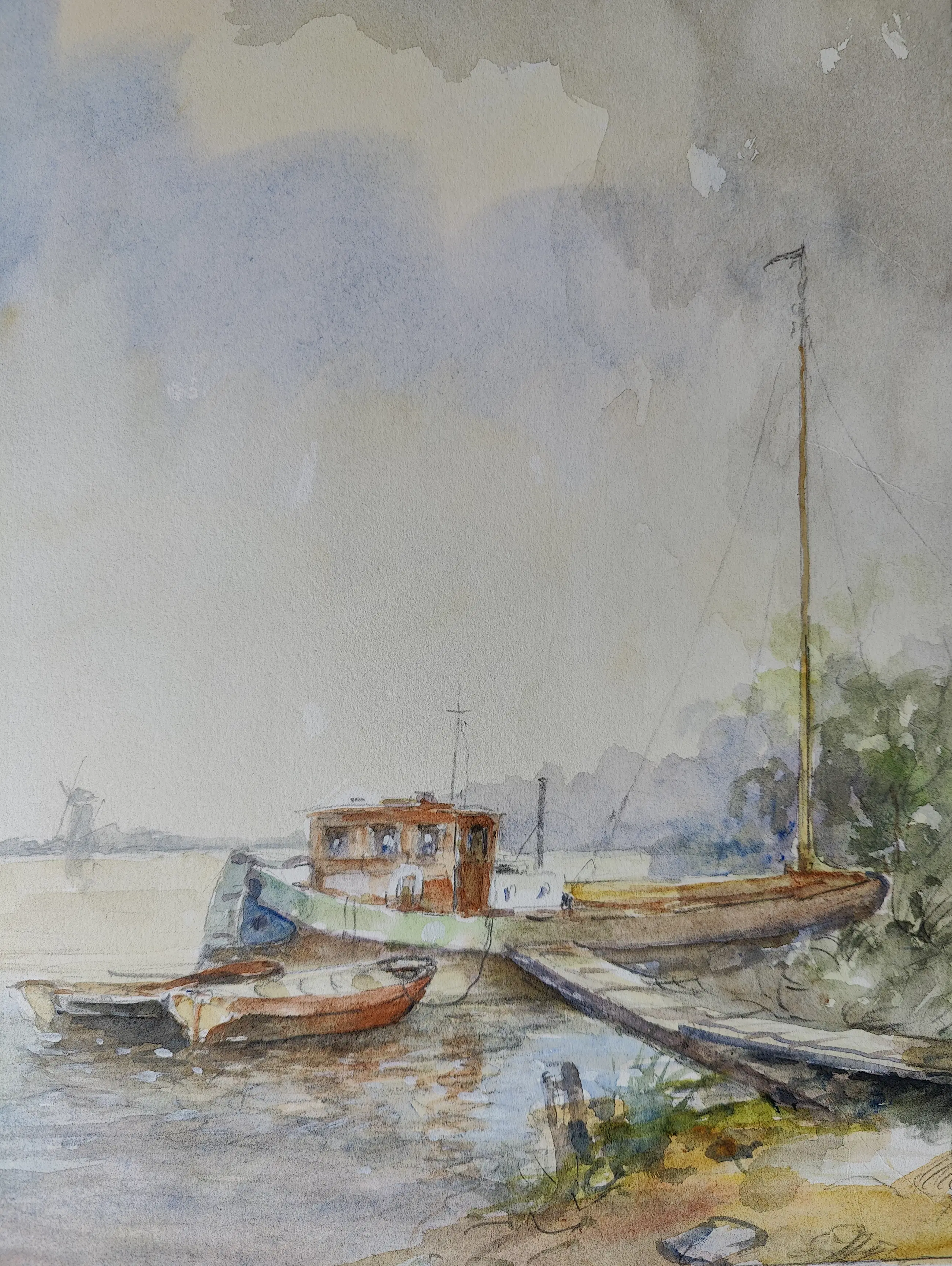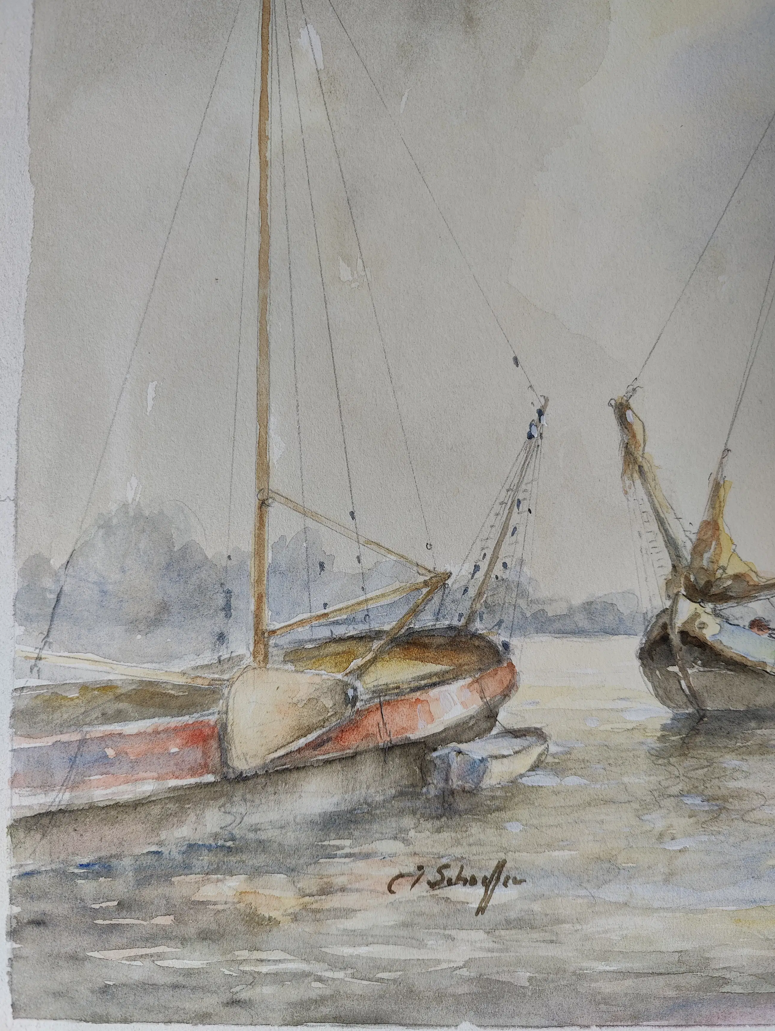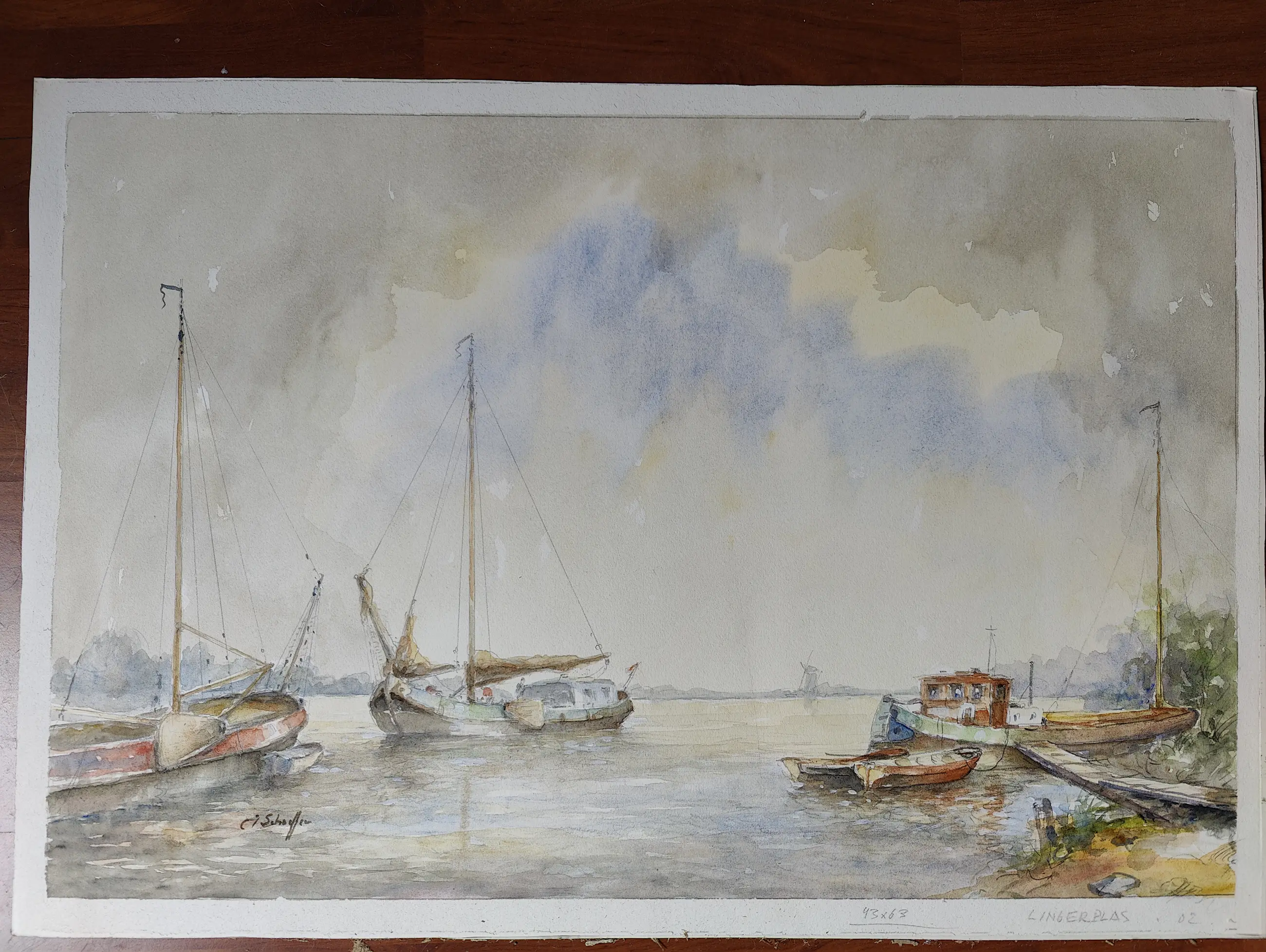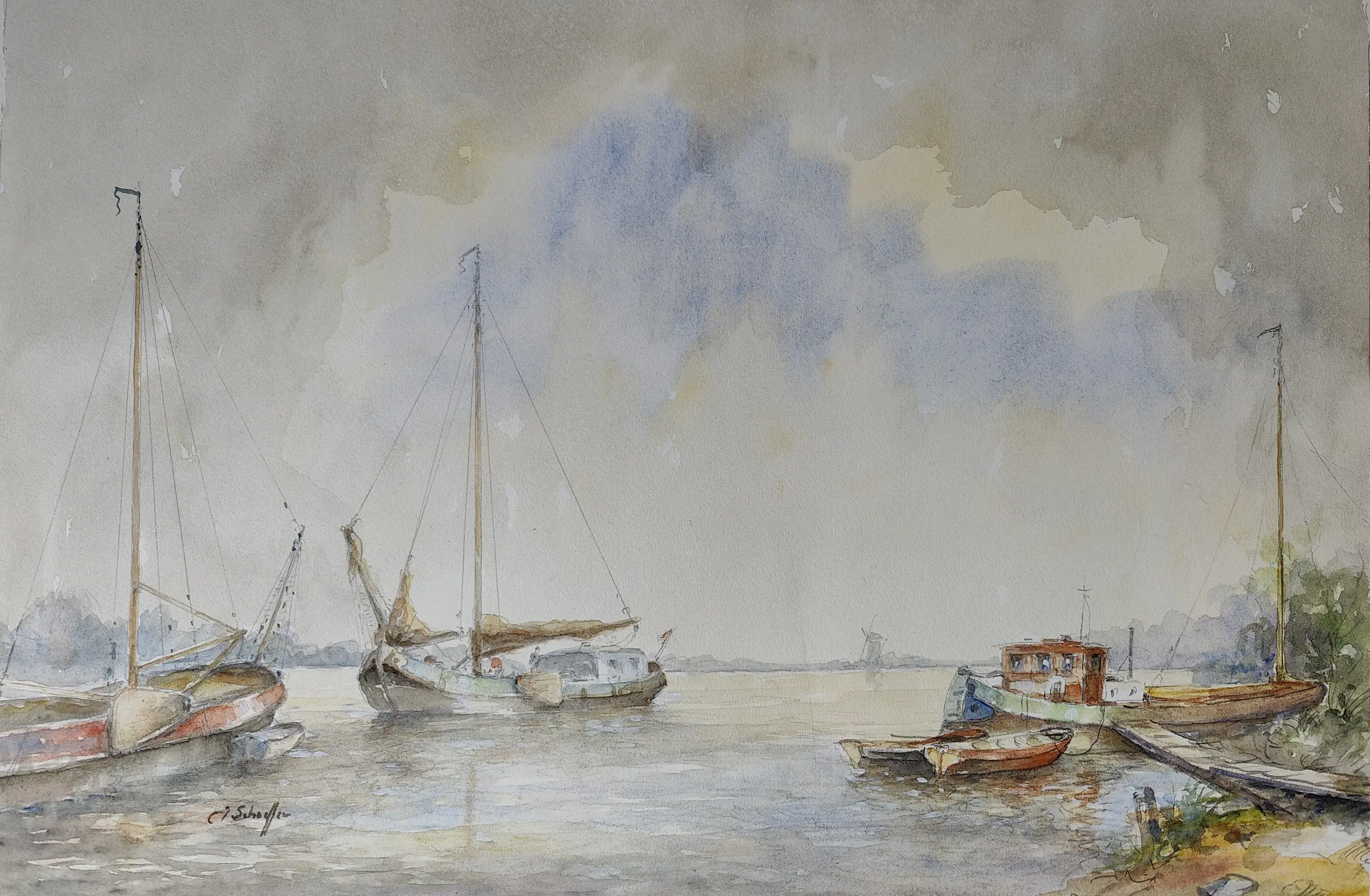 Mooi aquarel in nieuwstaat. Is getekend door de bekende Rotterdamse schilder, Jan Schaeffer. Jan Schaeffer was een veelzijdige kunstenaar die vooral bekend was om zijn Rotterdamse havens, landschappen, riviergezichten, stadsgezichten en stillevens. Op hoge leeftijd zat hij nog dagelijks achter zijn schildersezel. Behalve schilderijen heeft hij ook veel aquarellen gemaakt. Dit werk komt uit de nalatenschap van de kunstenaar en is nooit op de markt geweest.