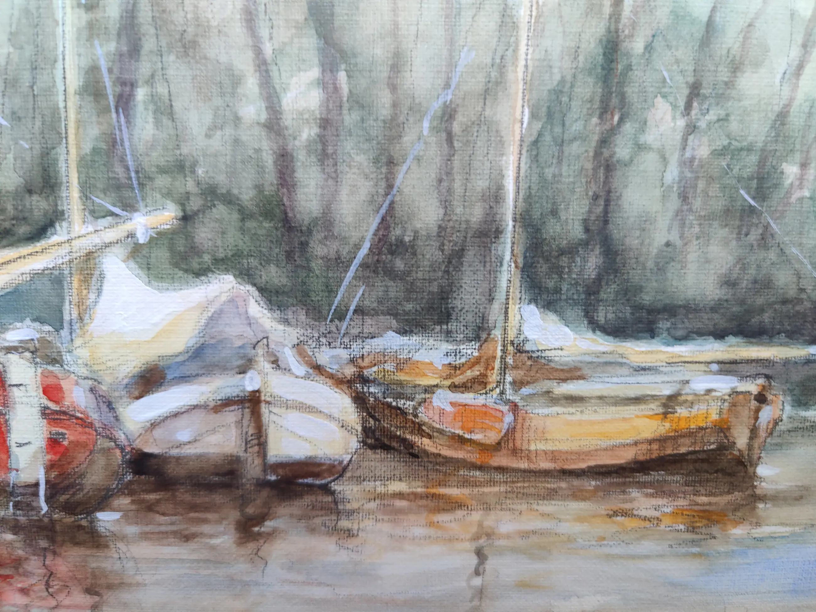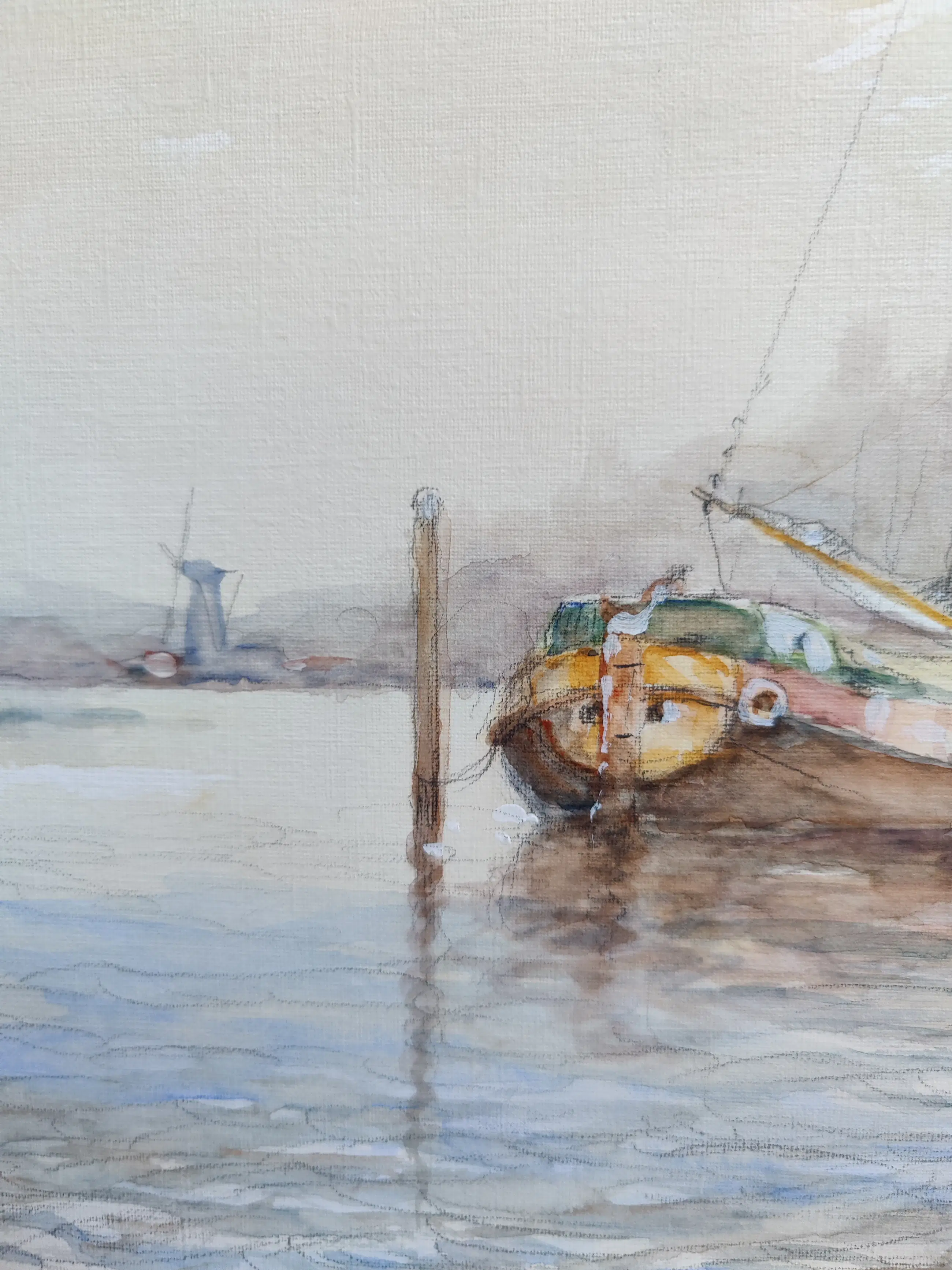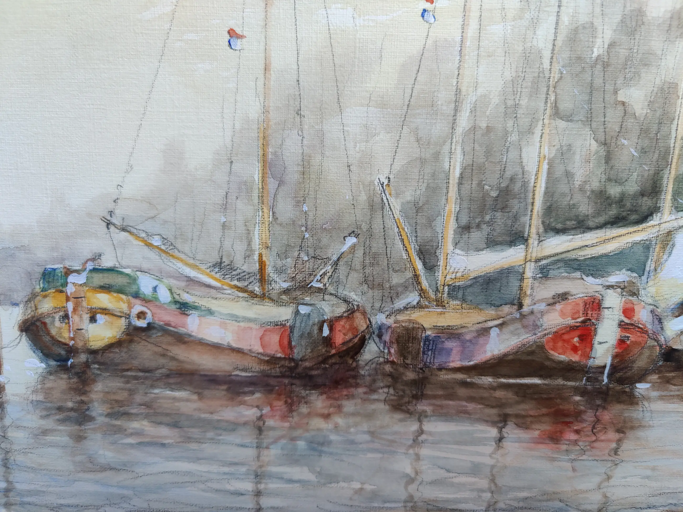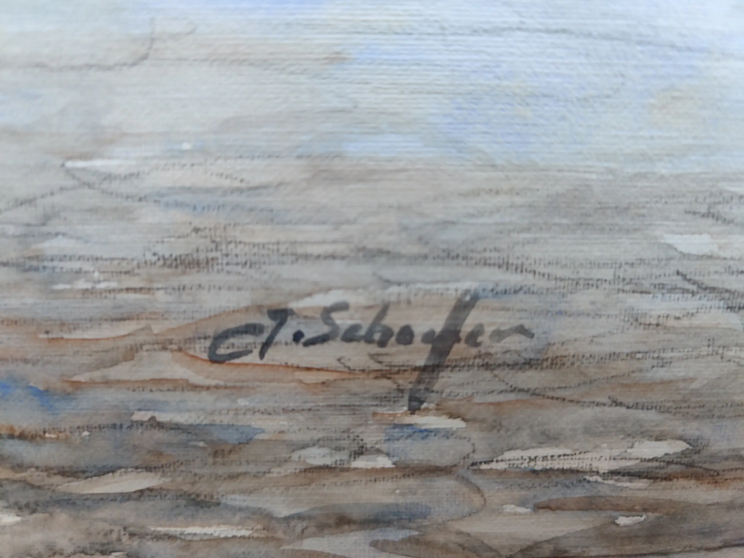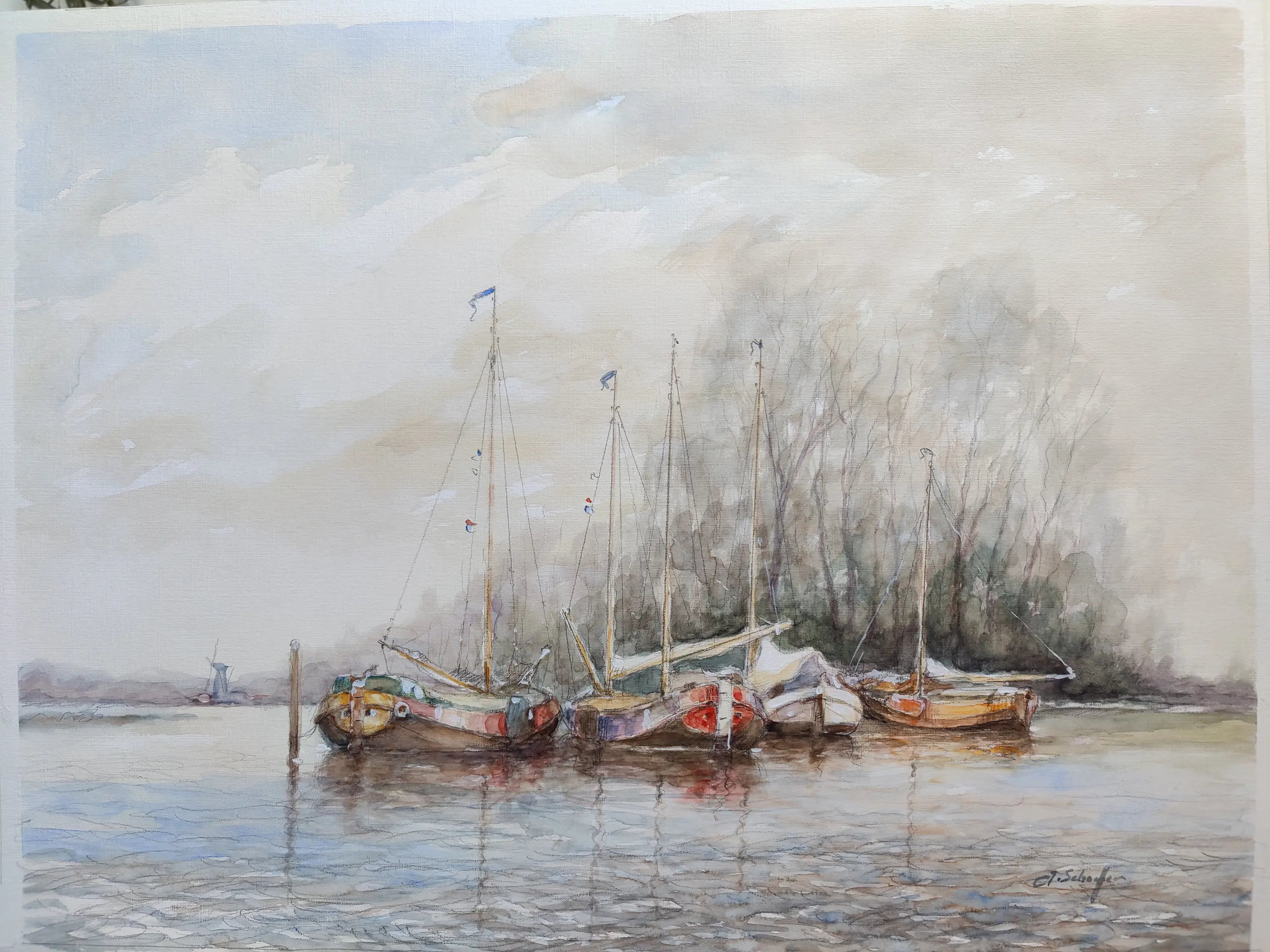 Mooi aquarel in nieuwstaat. Is getekend door de bekende Rotterdamse schilder, Jan Schaeffer. Jan Schaeffer was een veelzijdige kunstenaar die vooral bekend was om zijn Rotterdamse havens, landschappen, riviergezichten, stadsgezichten en stillevens. Op hoge leeftijd zat hij nog dagelijks achter zijn schildersezel. Behalve schilderijen heeft hij ook veel aquarellen gemaakt. Dit werk komt uit de nalatenschap van de kunstenaar en is nooit op de markt geweest.