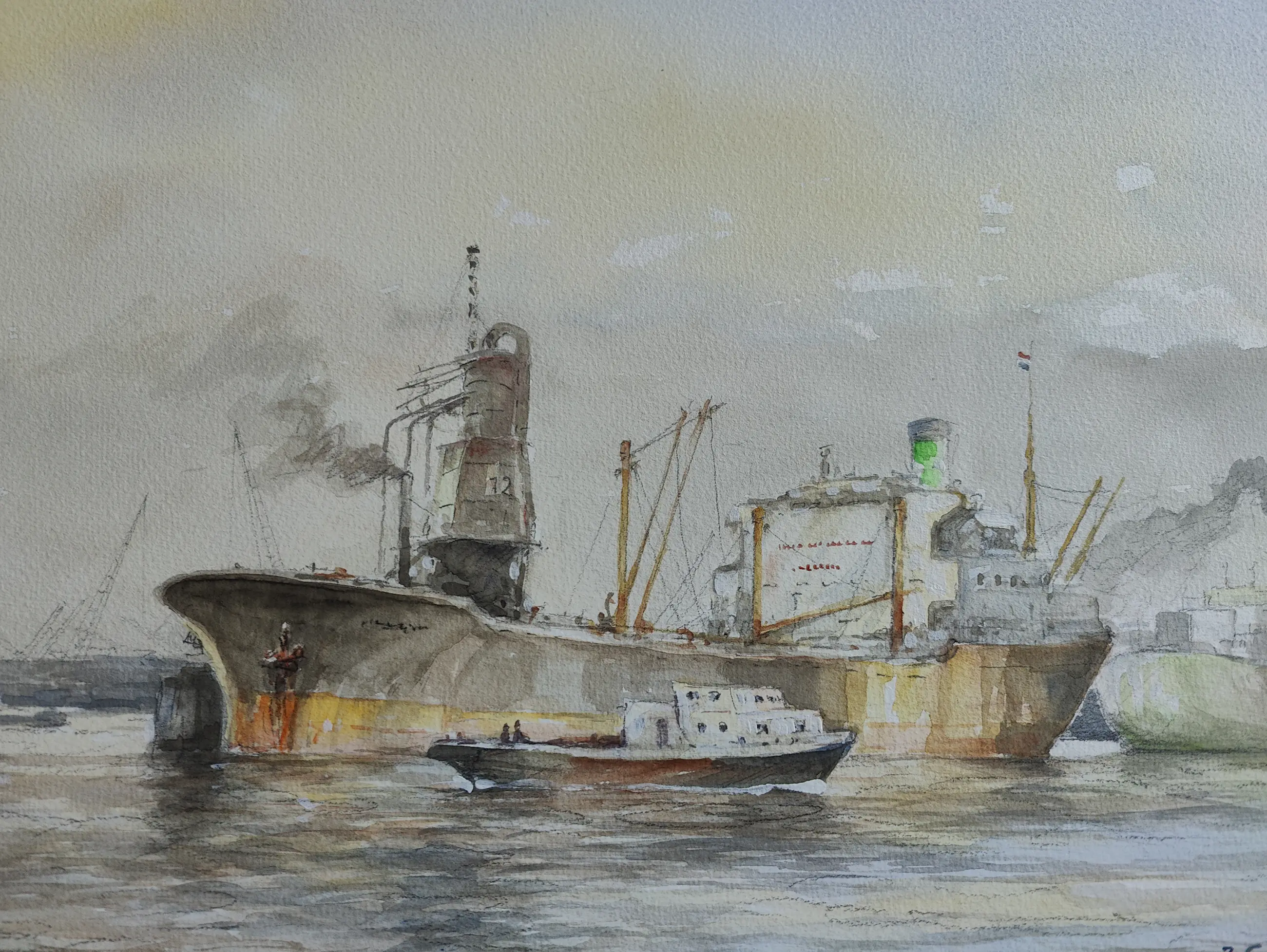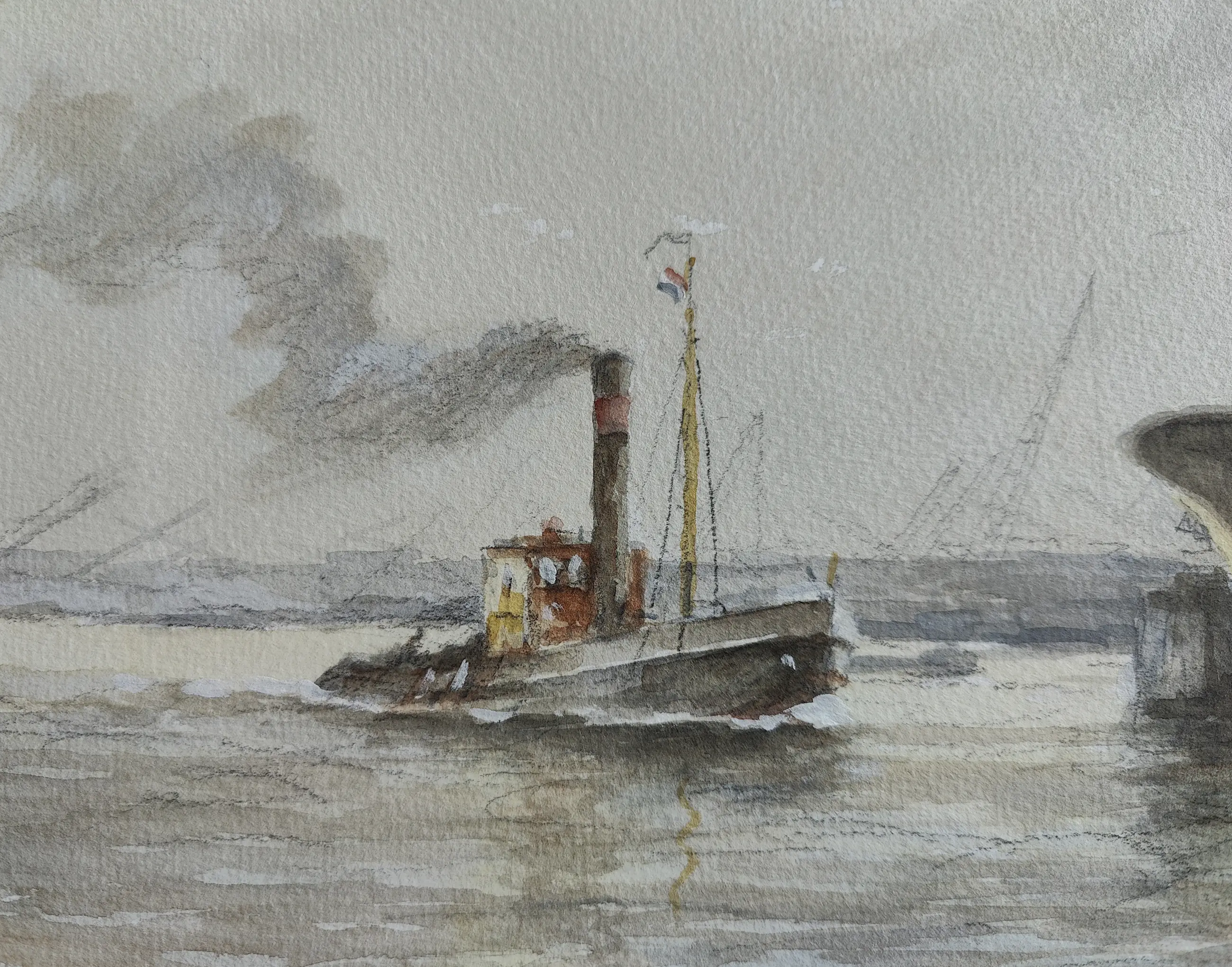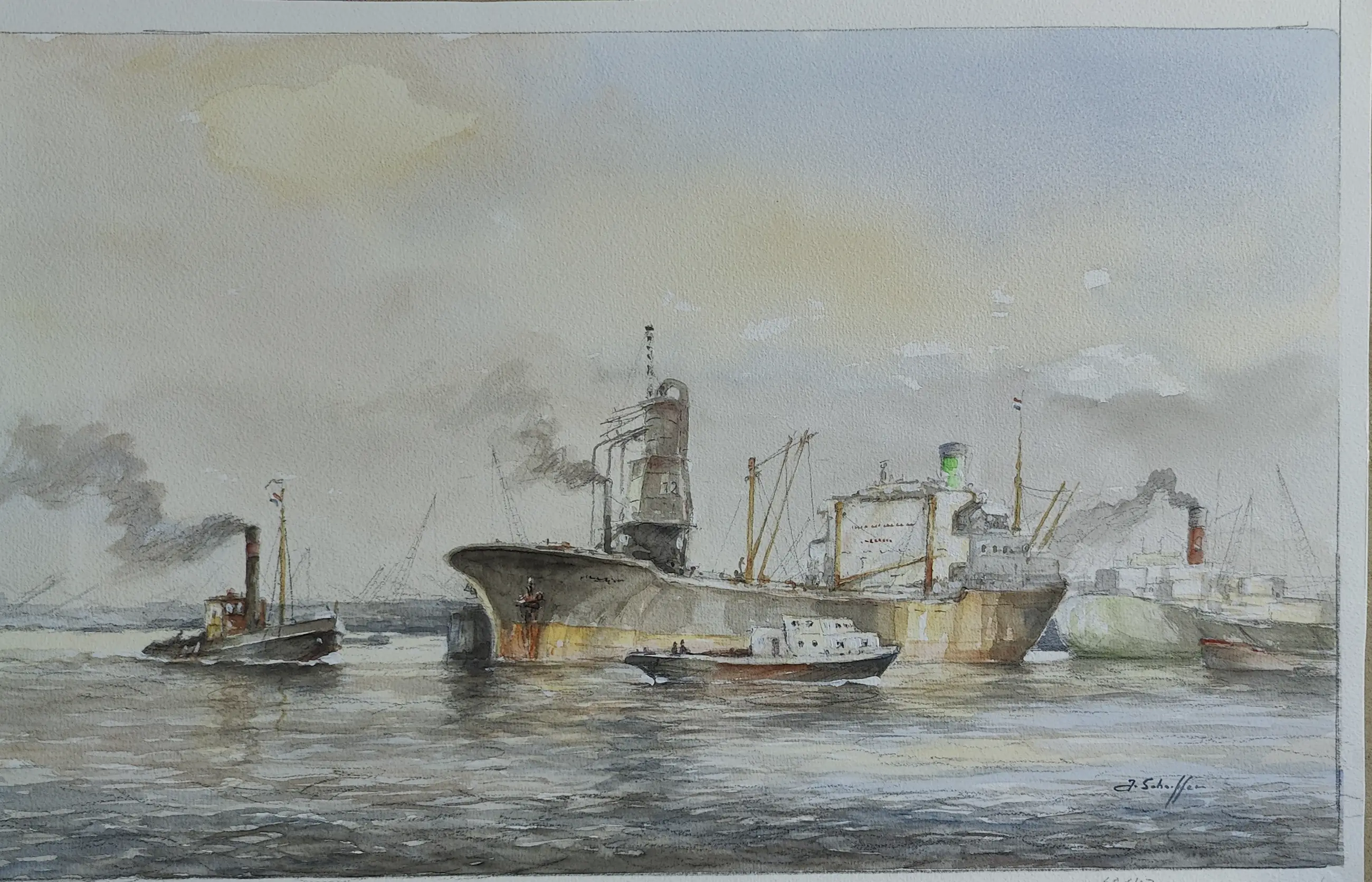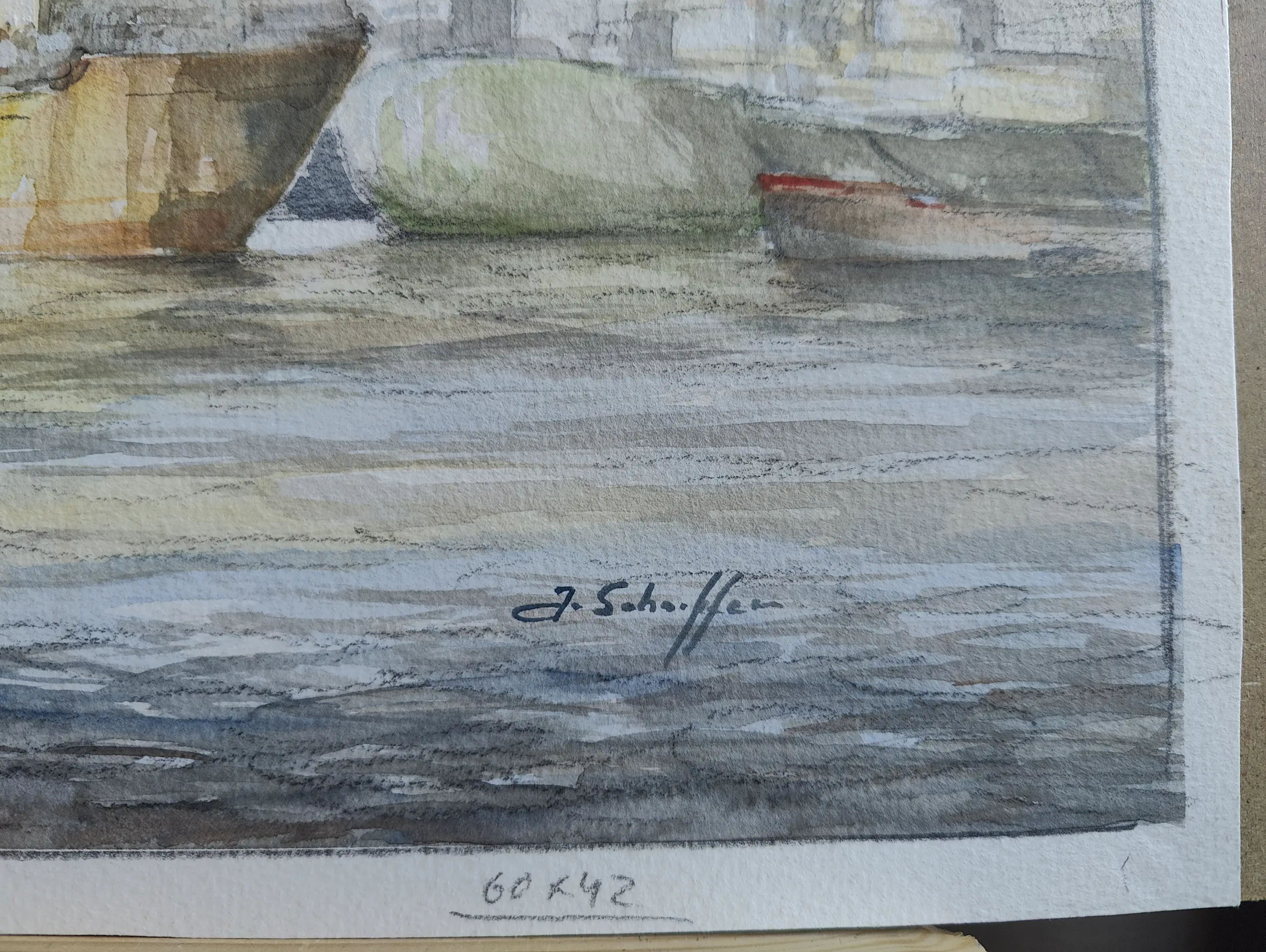 Mooi aquarel in nieuwstaat. Is getekend door de bekende Rotterdamse schilder, Jan Schaeffer. Jan Schaeffer was een veelzijdige kunstenaar die vooral bekend was om zijn Rotterdamse havens, landschappen, riviergezichten, stadsgezichten en stillevens. Op hoge leeftijd zat hij nog dagelijks achter zijn schildersezel. Behalve schilderijen heeft hij ook veel aquarellen gemaakt. Dit werk komt uit de nalatenschap van de kunstenaar en is nooit op de markt geweest.