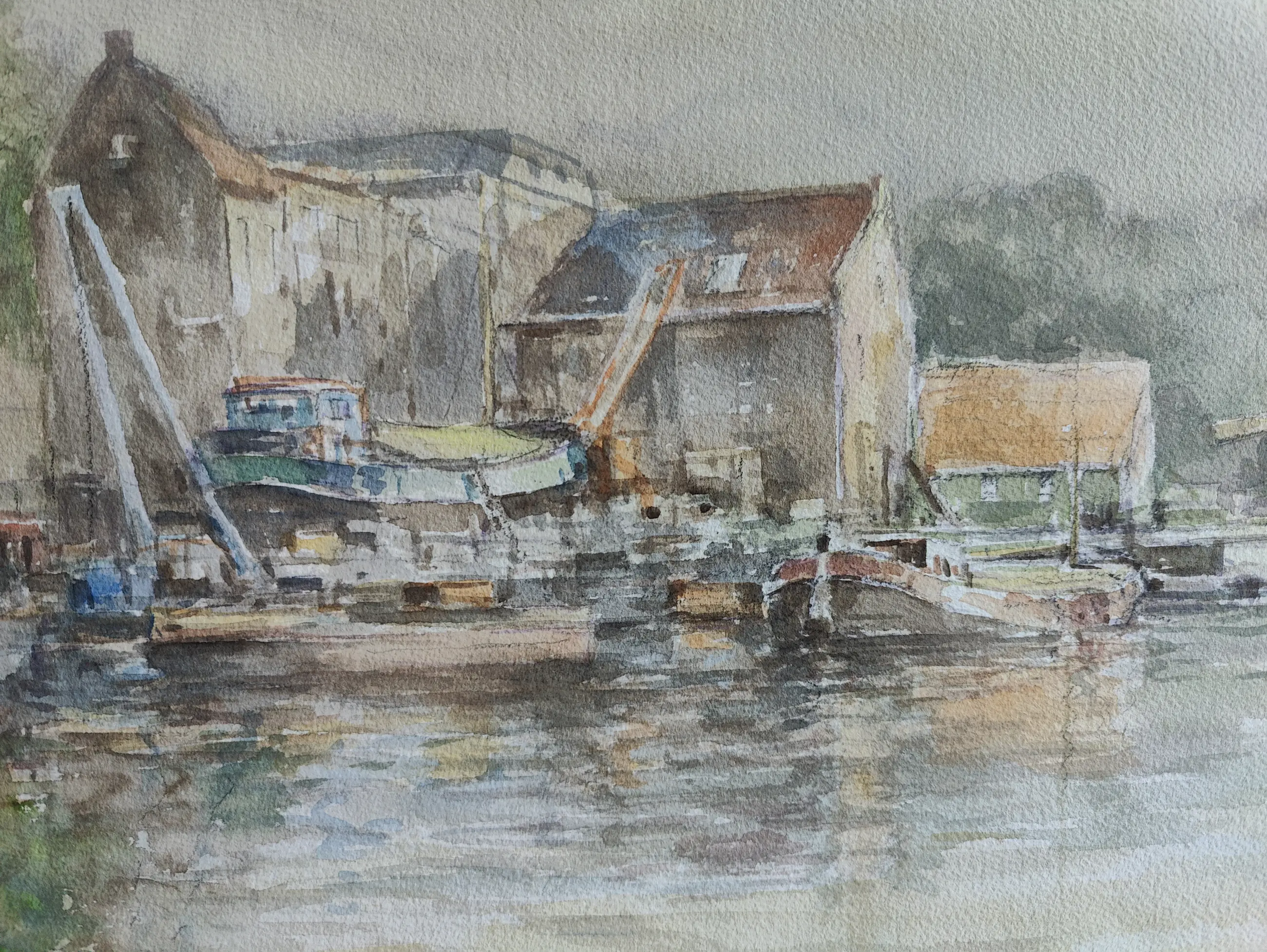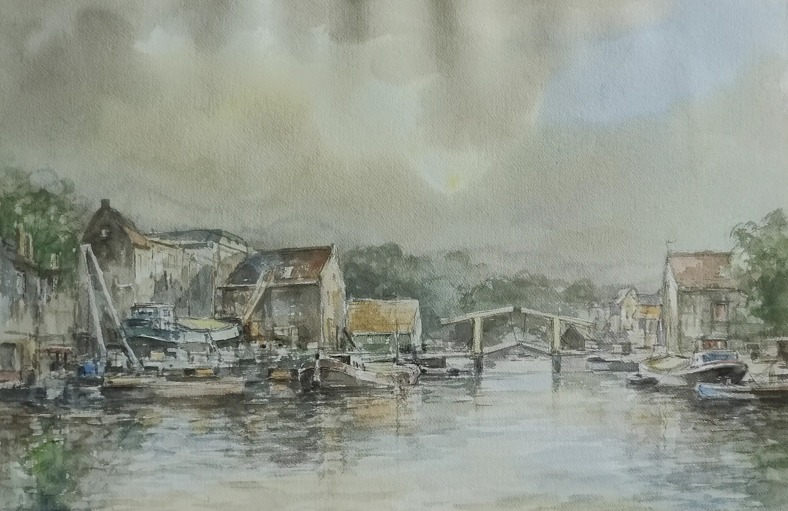 Mooi aquarel in nieuwstaat. Is getekend door de bekende Rotterdamse schilder, Jan Schaeffer. Jan Schaeffer was een veelzijdige kunstenaar die vooral bekend was om zijn Rotterdamse havens, landschappen, riviergezichten, stadsgezichten en stillevens. Op hoge leeftijd zat hij nog dagelijks achter zijn schildersezel. Behalve schilderijen heeft hij ook veel aquarellen gemaakt. Dit werk komt uit de nalatenschap van de kunstenaar en is nooit op de markt geweest.