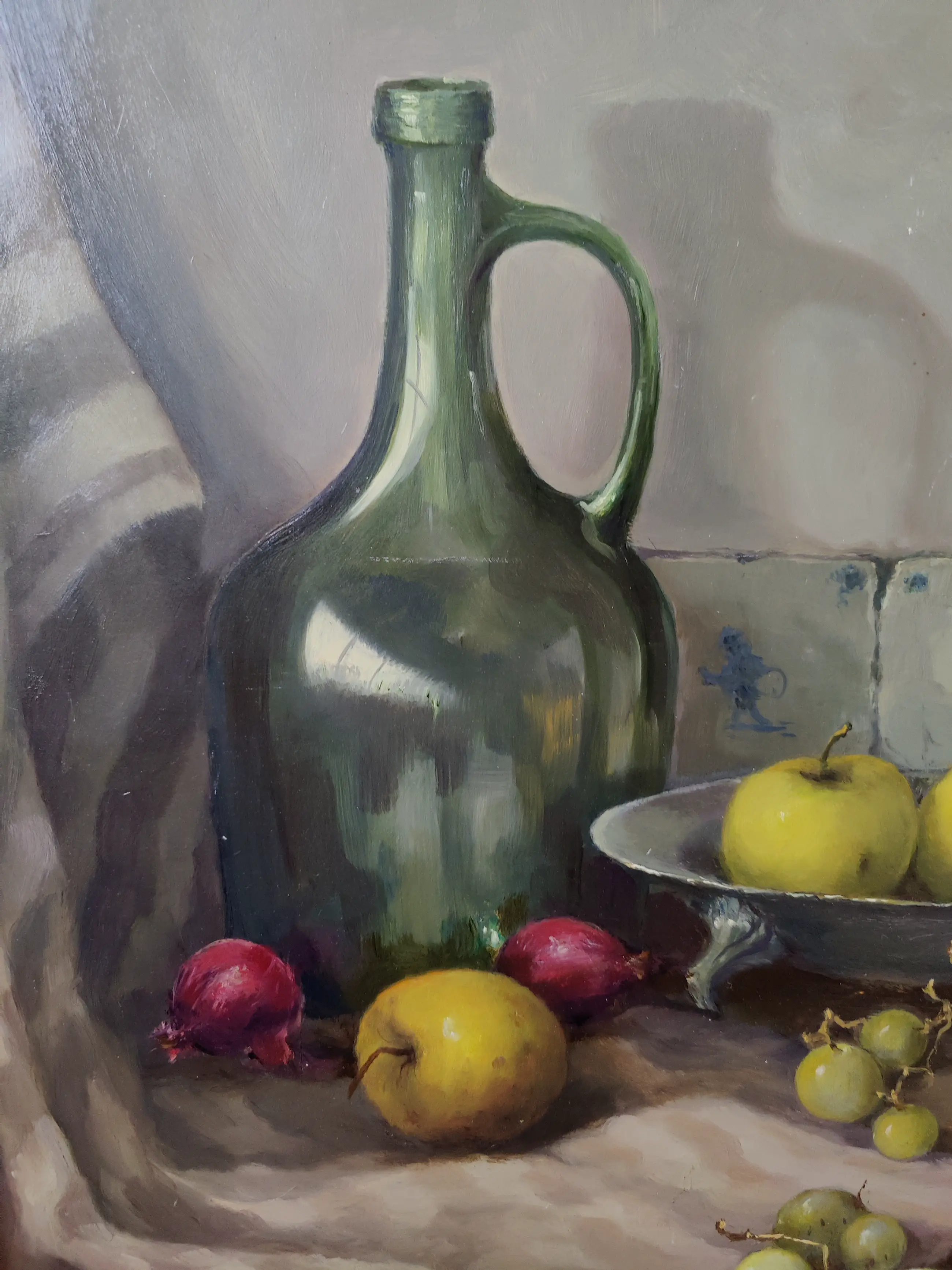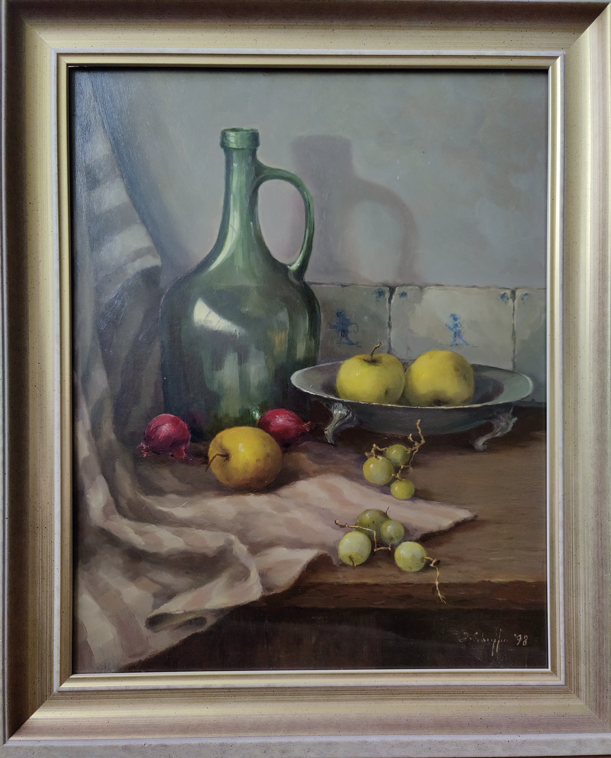Mooi stilleven van Jan Schaeffer met een Groene vaas en een mooie tinnen schaal met fruit. Wordt geleverd met lijst.