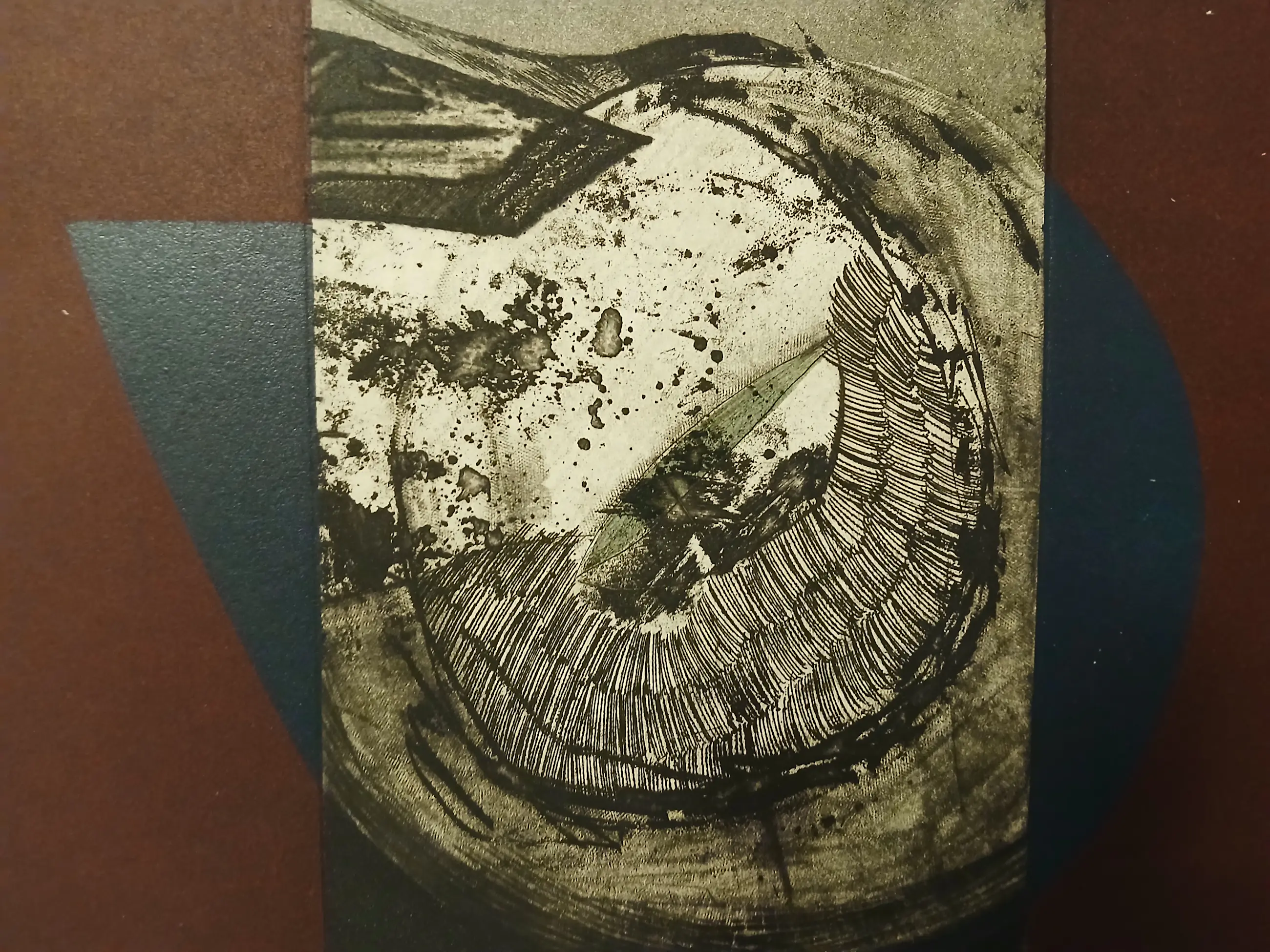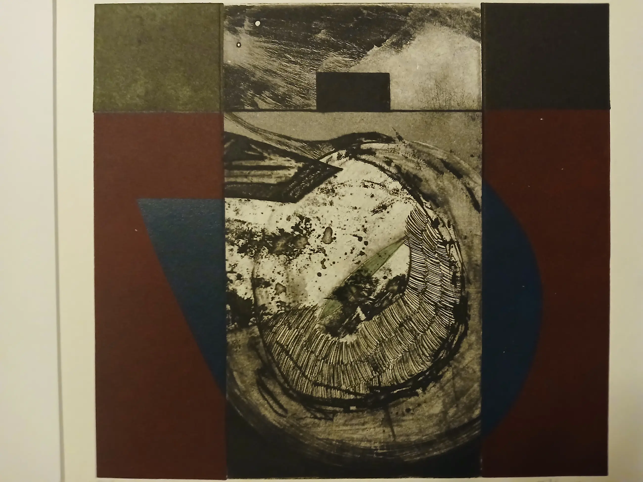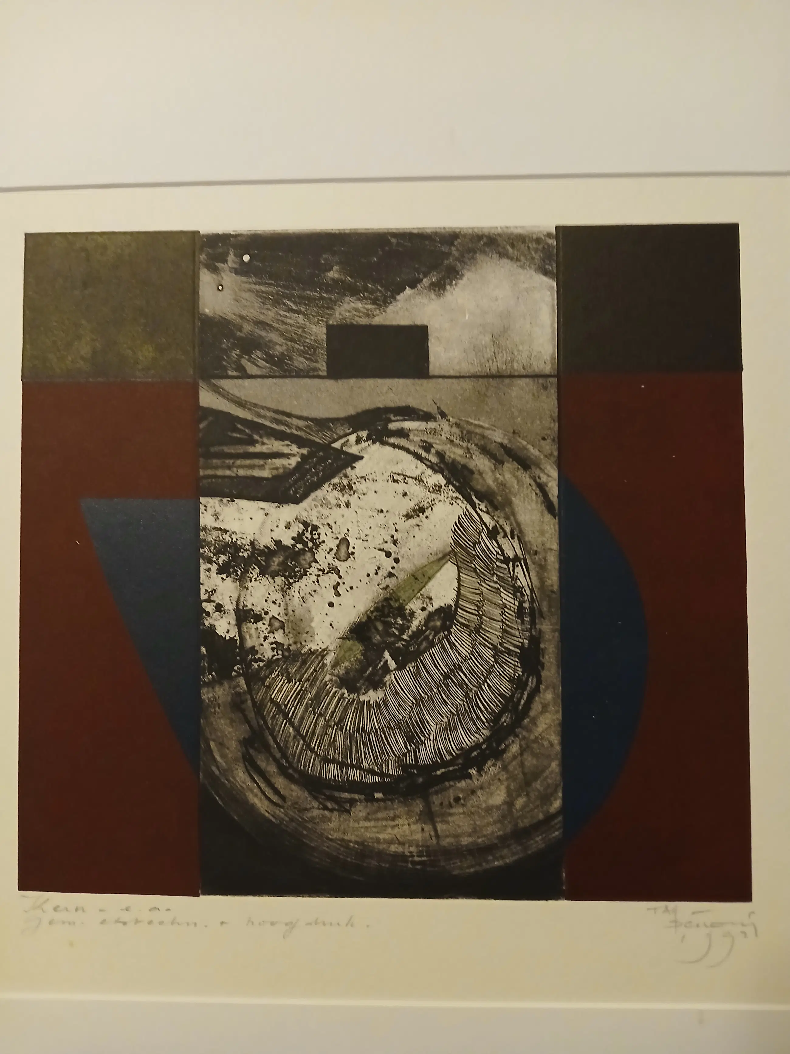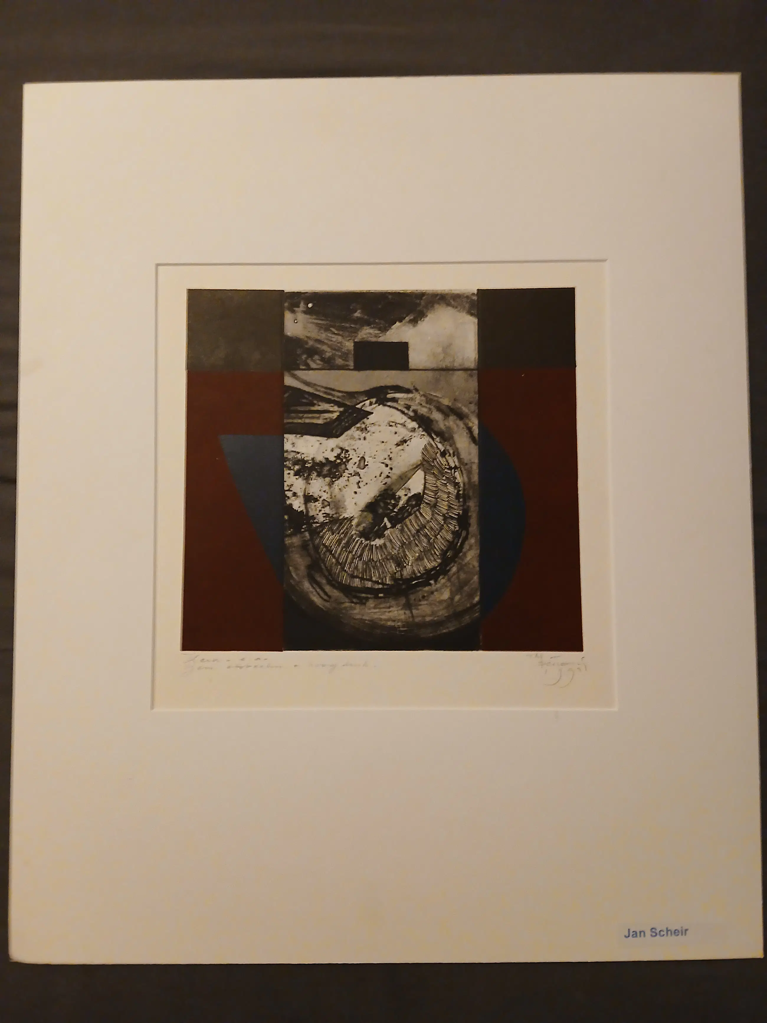Gemengde technieken +hoogdruk. Monumentale abstracte compositie met centrale cirkelvorm ("kern") geflankeerd door kleurvlakken. Kenmerkend voor Scheirs werk begin jaren 90 , waarin grafische structuren , hoogdruk en schilderkundige kleurvelden samen komen. In perfecte nieuwstaat.
