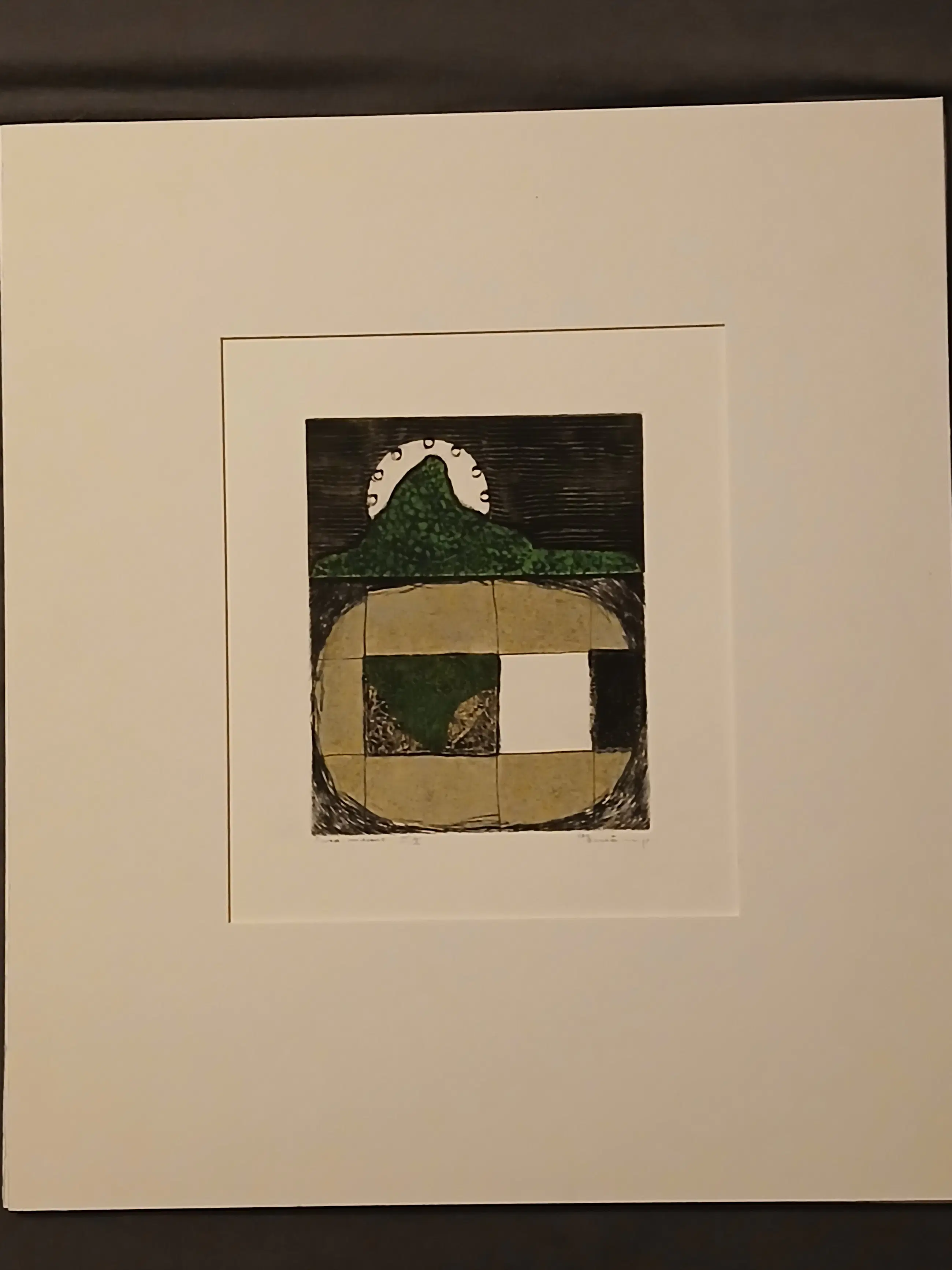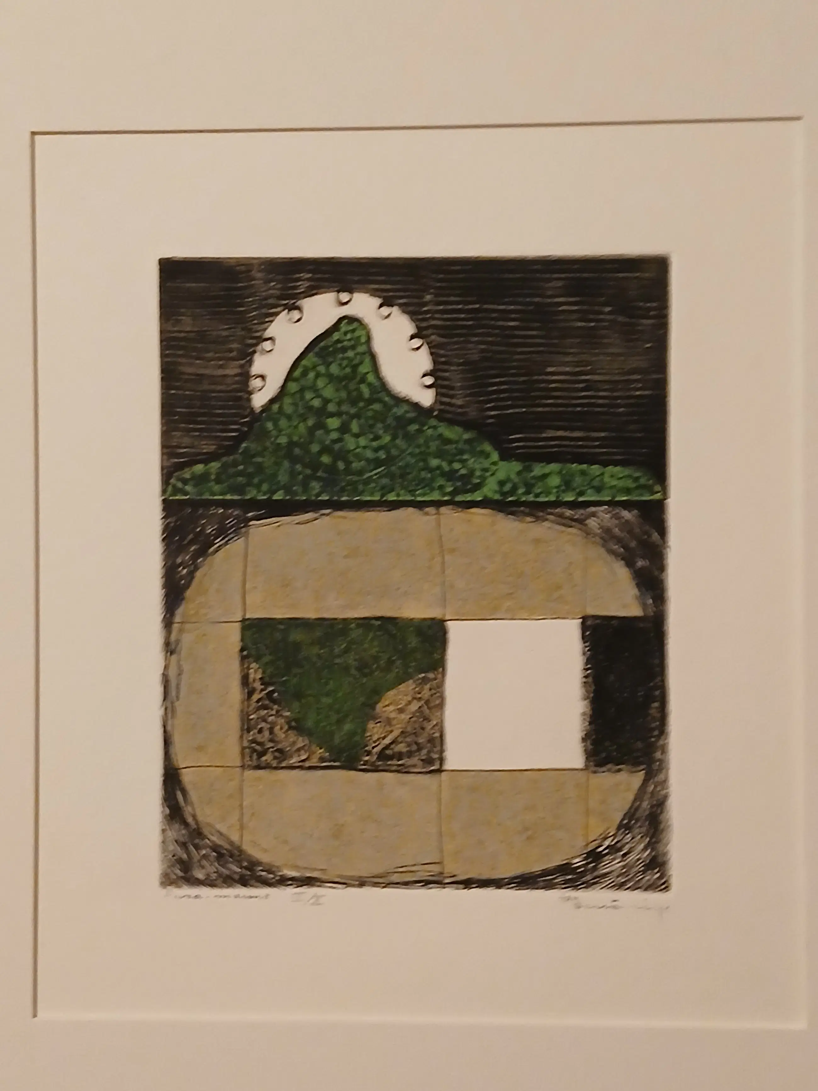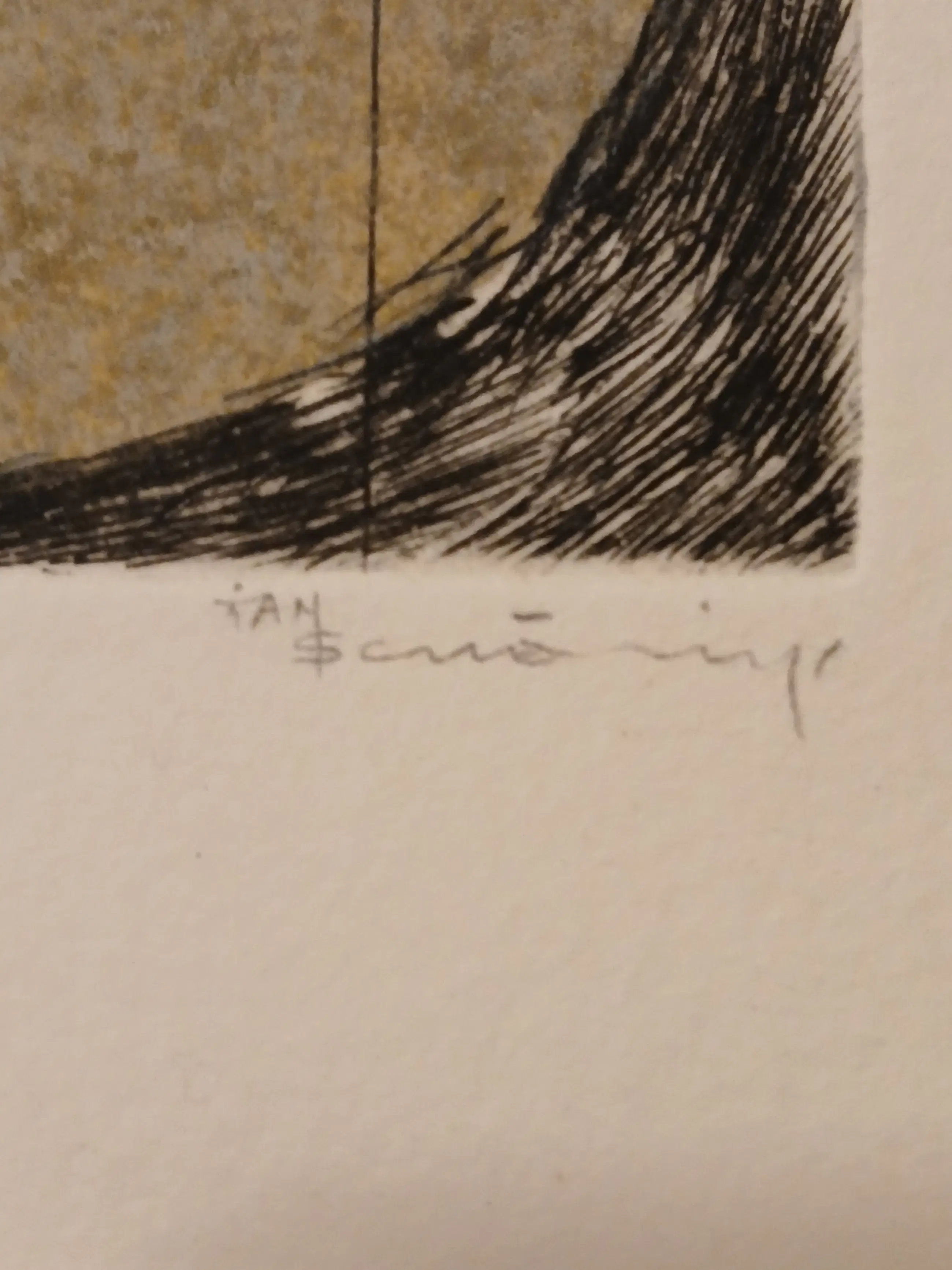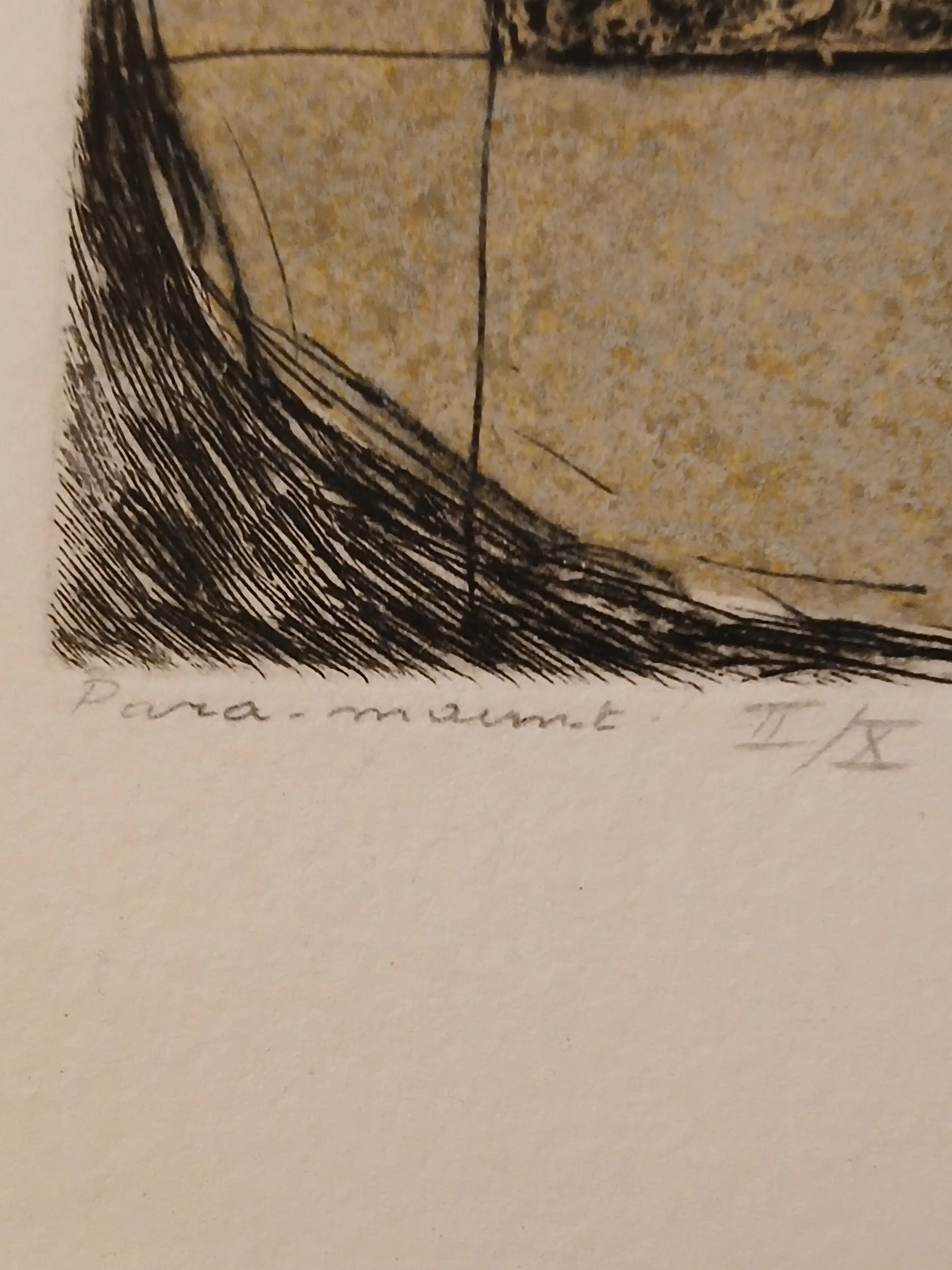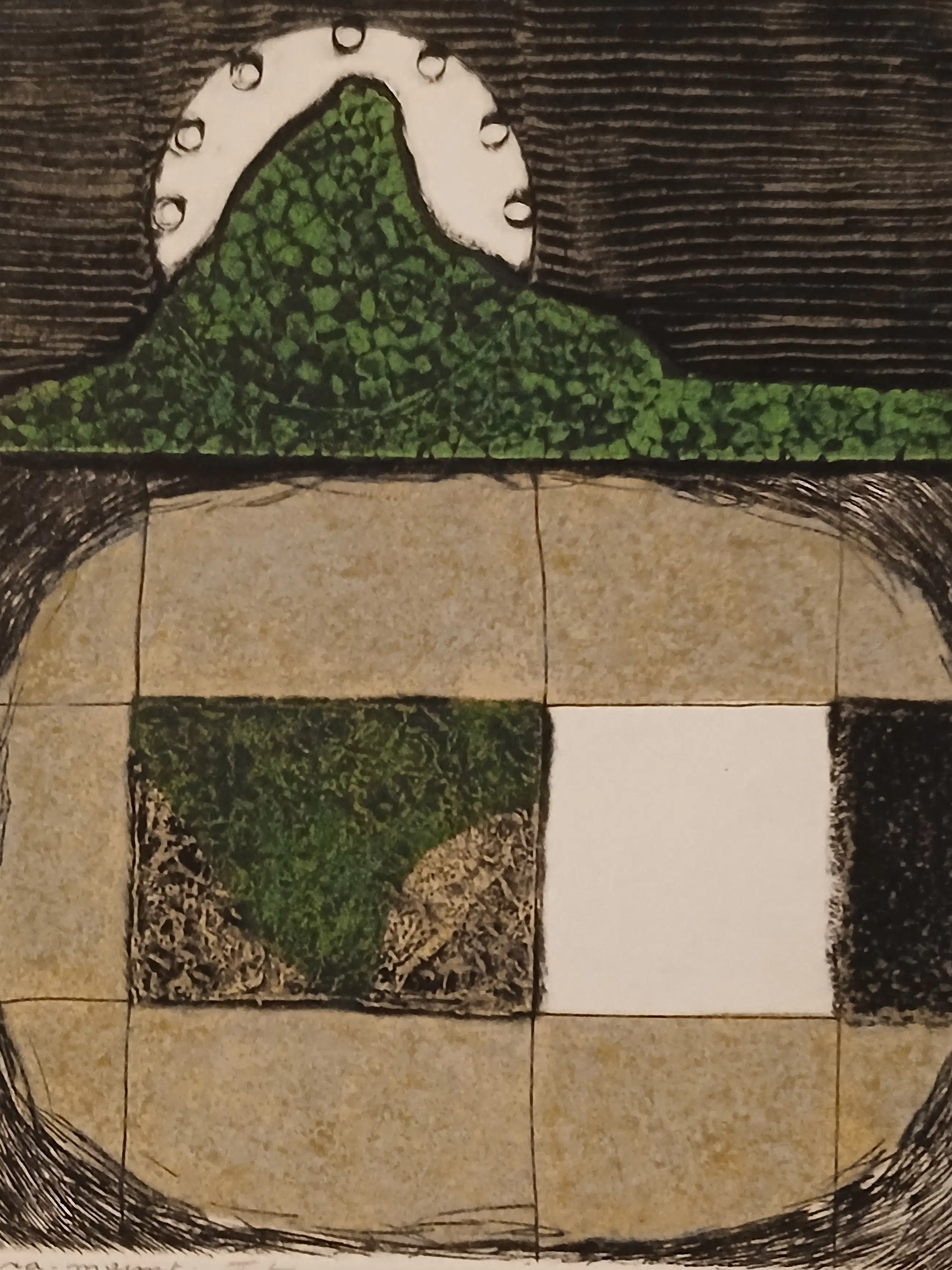 Geometrisch opgebouwde compositie met aardse vlakken en een centraal groen accent. De zware arceringen en vlakverdeling creëren een architecturale, symbolische ruimte. De vermelding manum wijst op een bewuste handmatige ingreep door de kunstenaar. Jan Scheir is een Belgische kunstenaar actief in de jaren 1980-90 . Zijn grafische oeuvre wordt gekenmerkt door soberheid, concentratie en een sterke aandacht voor structuur , materiaal en handmatige afwerking. Ets/Droge naald / Handkleur. Gemengde technieken. Oplage kleine reeks: 2/5 In perfecte nieuwstaat. In perfecte nieuwstaat.