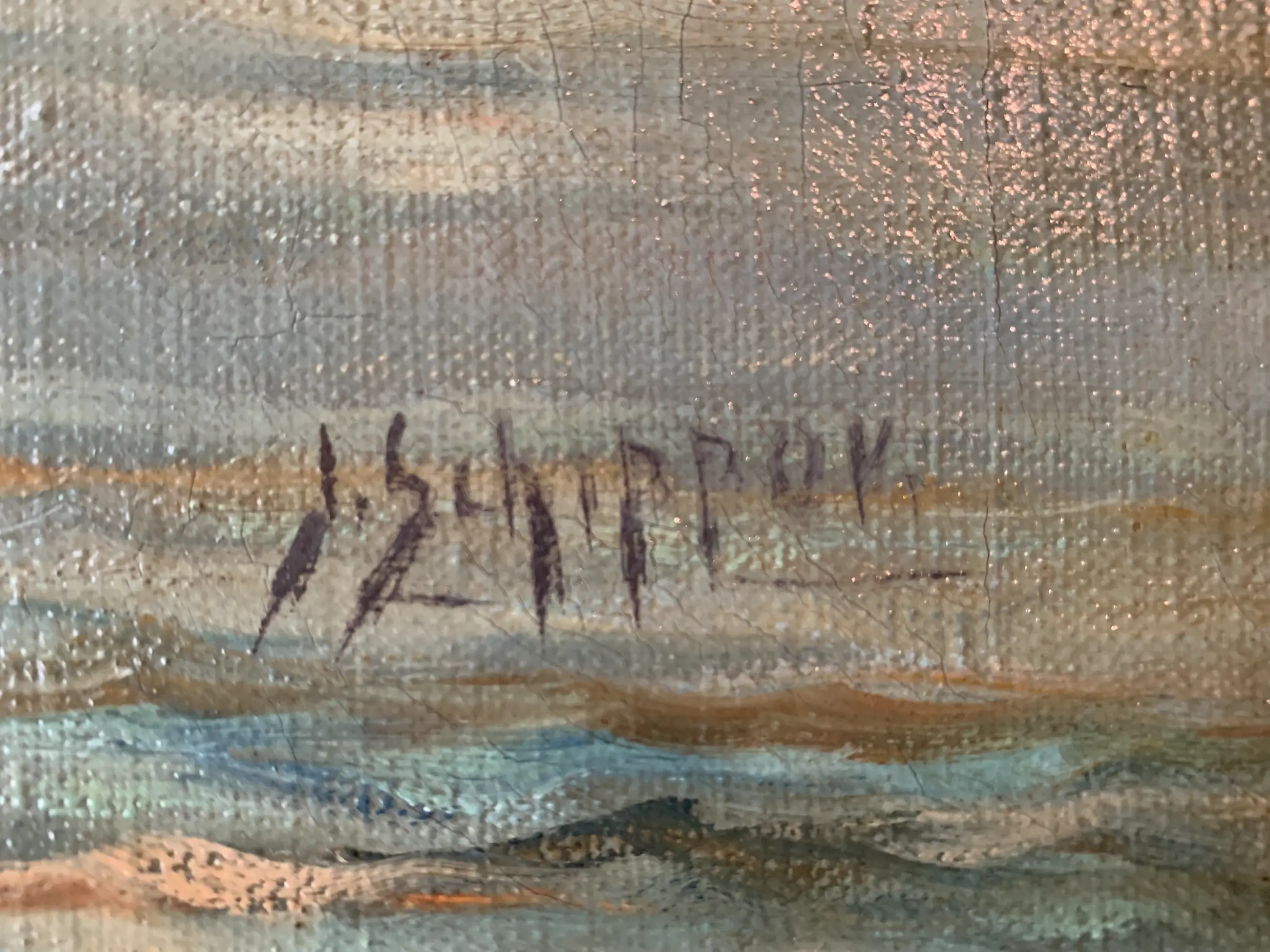 Dit Rotterdams havengezicht met stoomschepen, geschilderd door Jan Schepers is rechts onder met de hand gesigneerd.