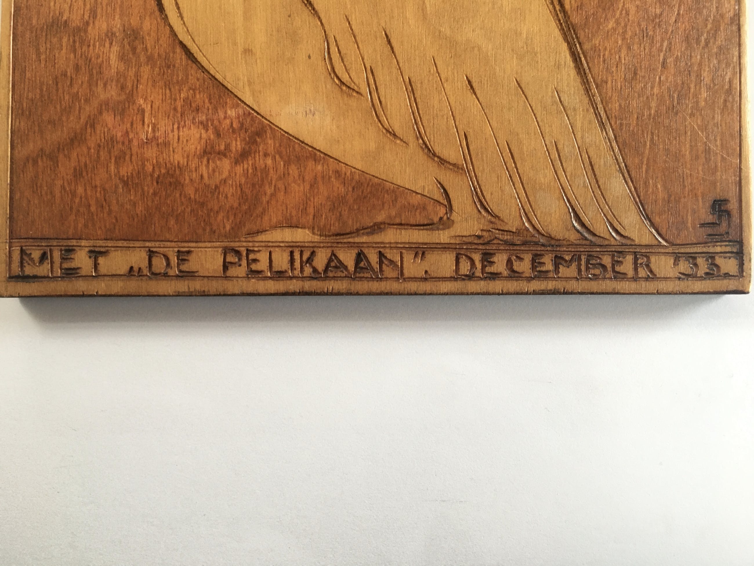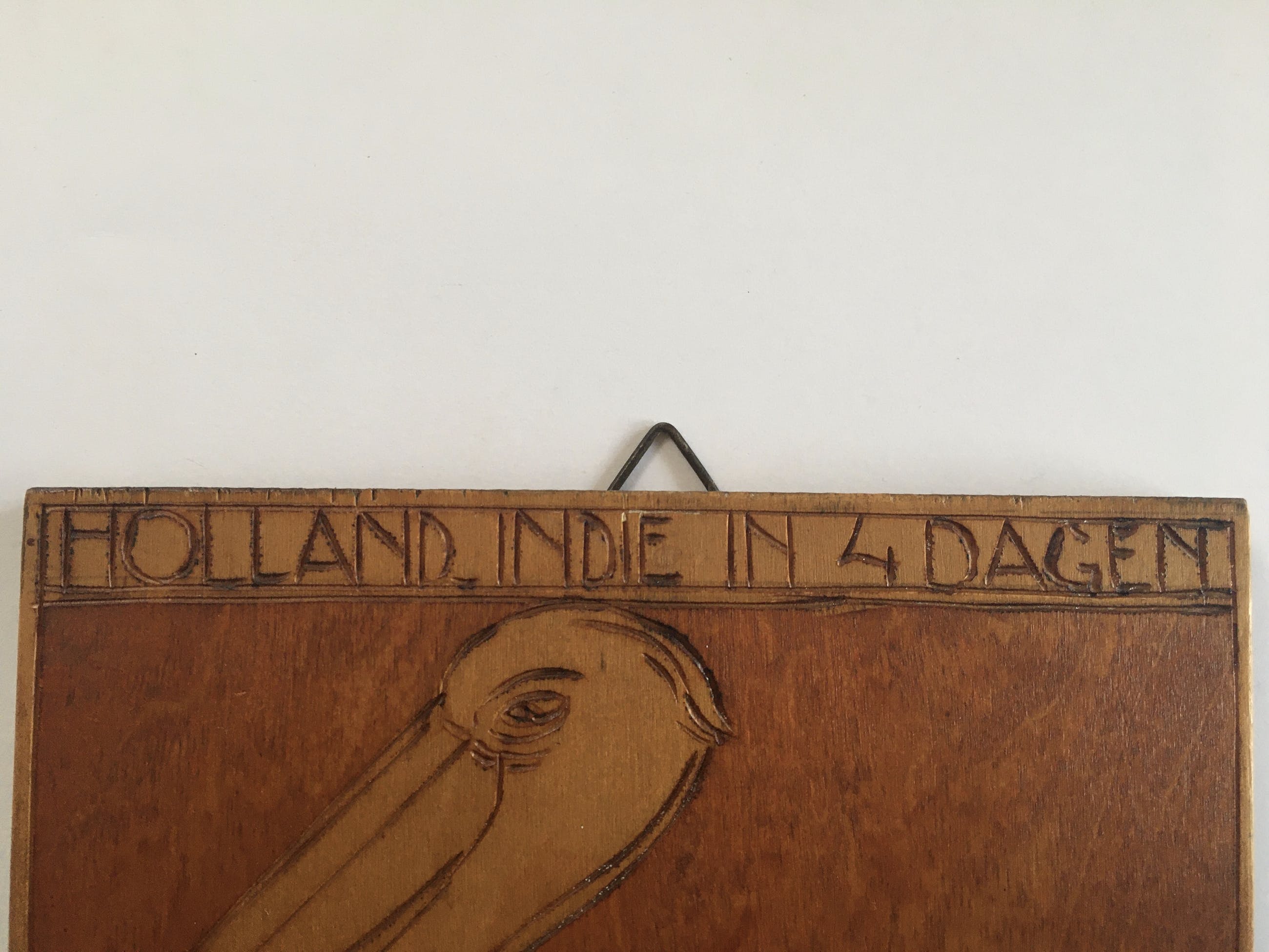 Zeldzaam houtsnijwerk van Jan Schonk ter herinnering aan de recordvlucht van Schiphol naar Batavia.