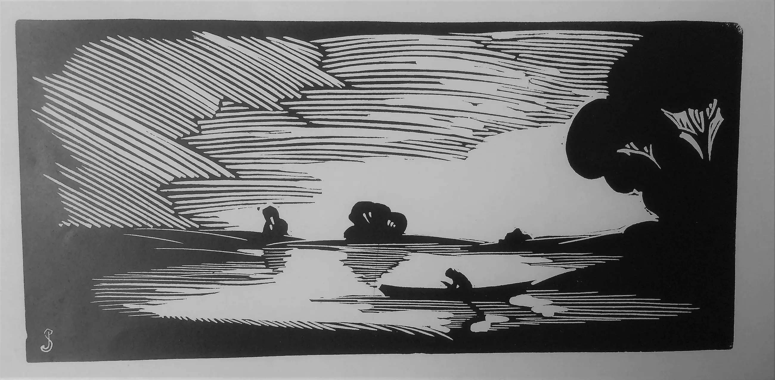 Houtsnede "De Plas" 1928; ontwerp & uitvoering Jan Schonk