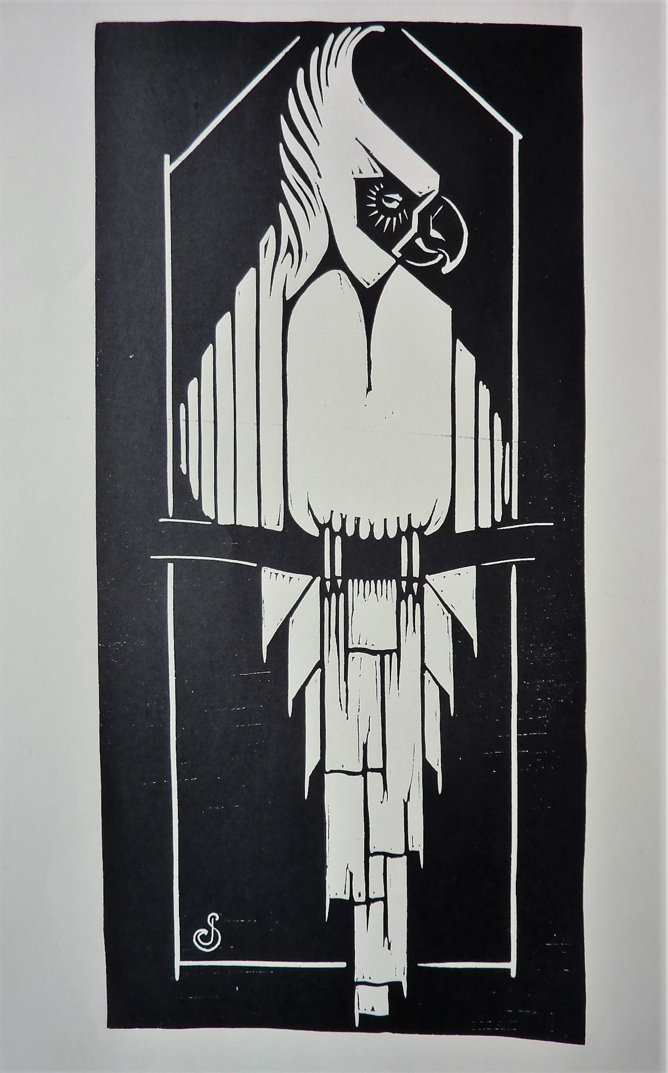 Houtsnede Kaketoe 1927; ontwerp & uitvoering Jan Schonk