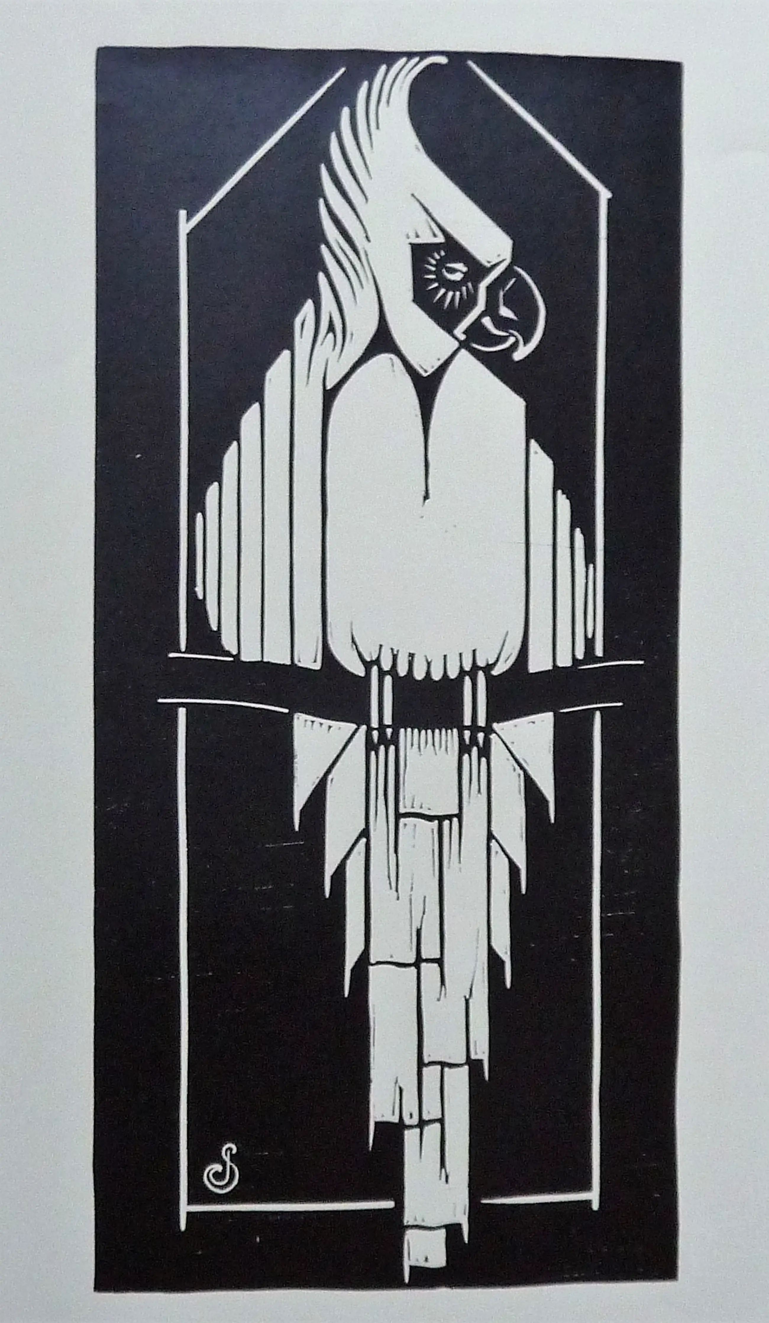 Houtsnede Kaketoe 1927; ontwerp & uitvoering Jan Schonk