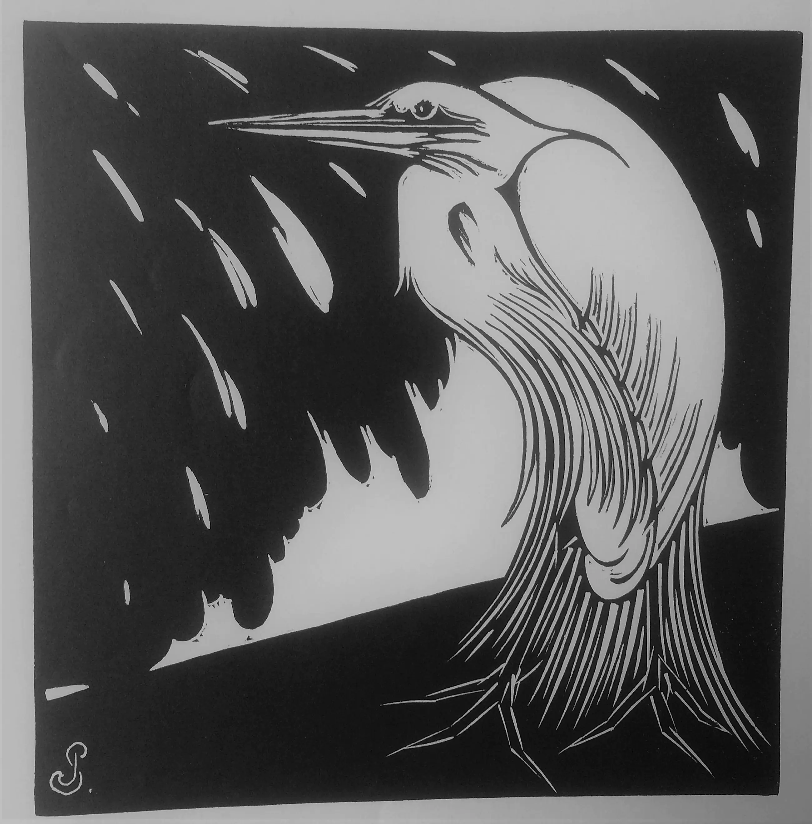 Houtsnede "Reiger" 1925, ontwerp & uitvoering Jan Schonk Gesigneerd JS in blok.