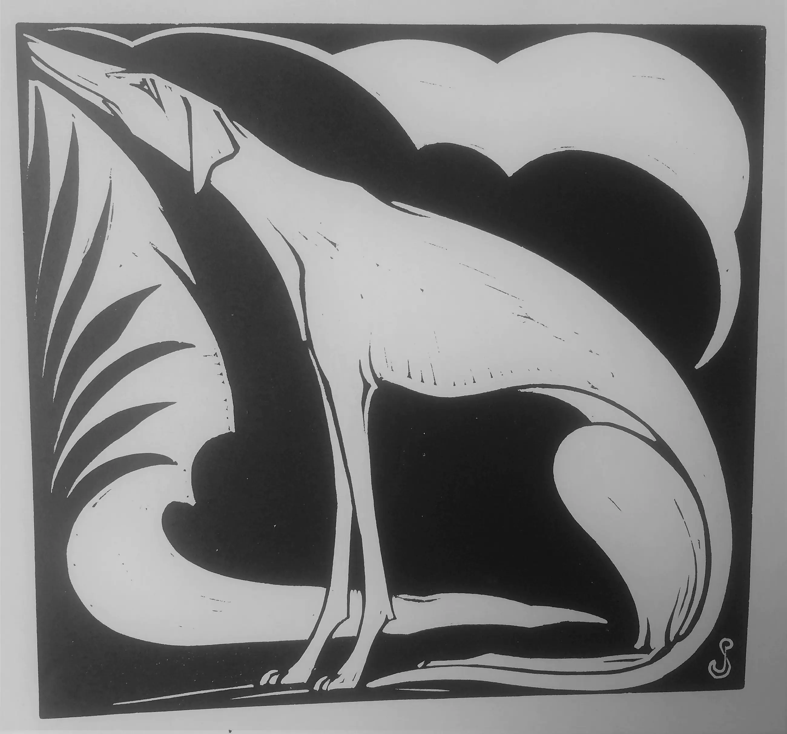 Houtsnede "Windhond" 1927; ontwerp & uitvoering Jan Schonk