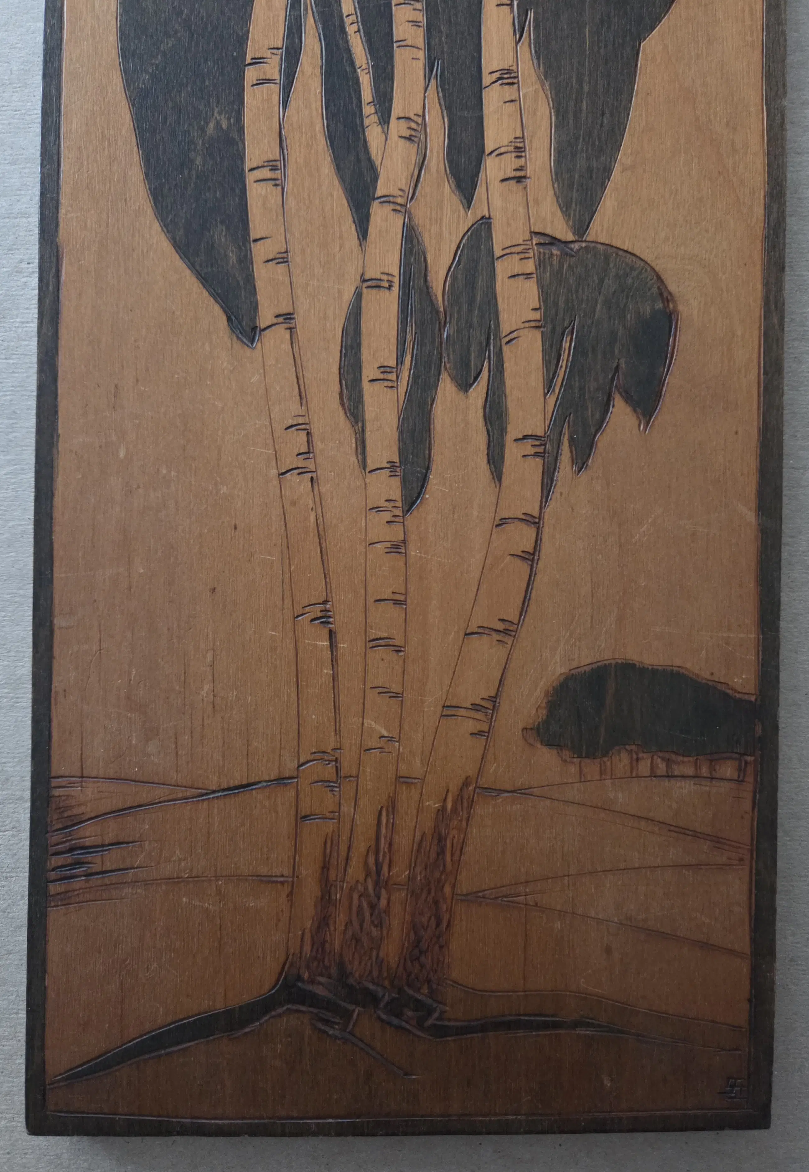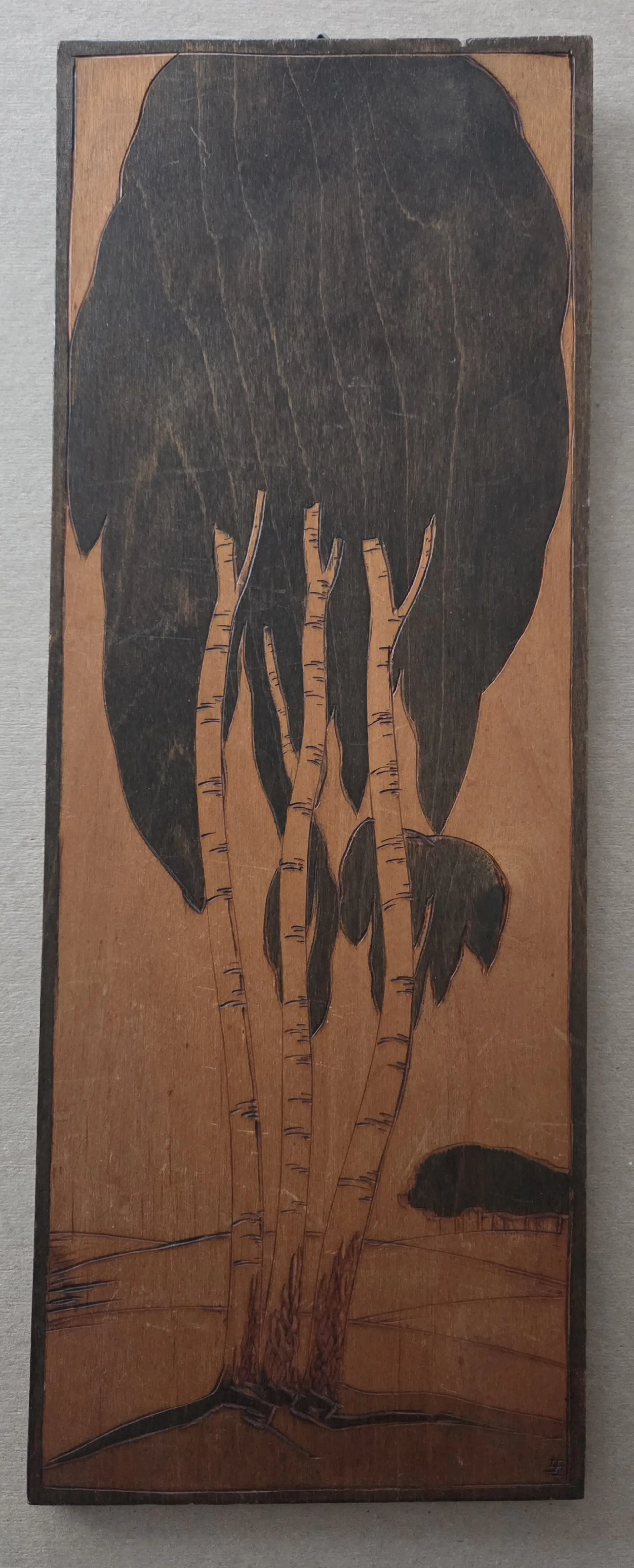 Jan Schonk - Houtsnijwerk. Bomen. Berken. Monogram.