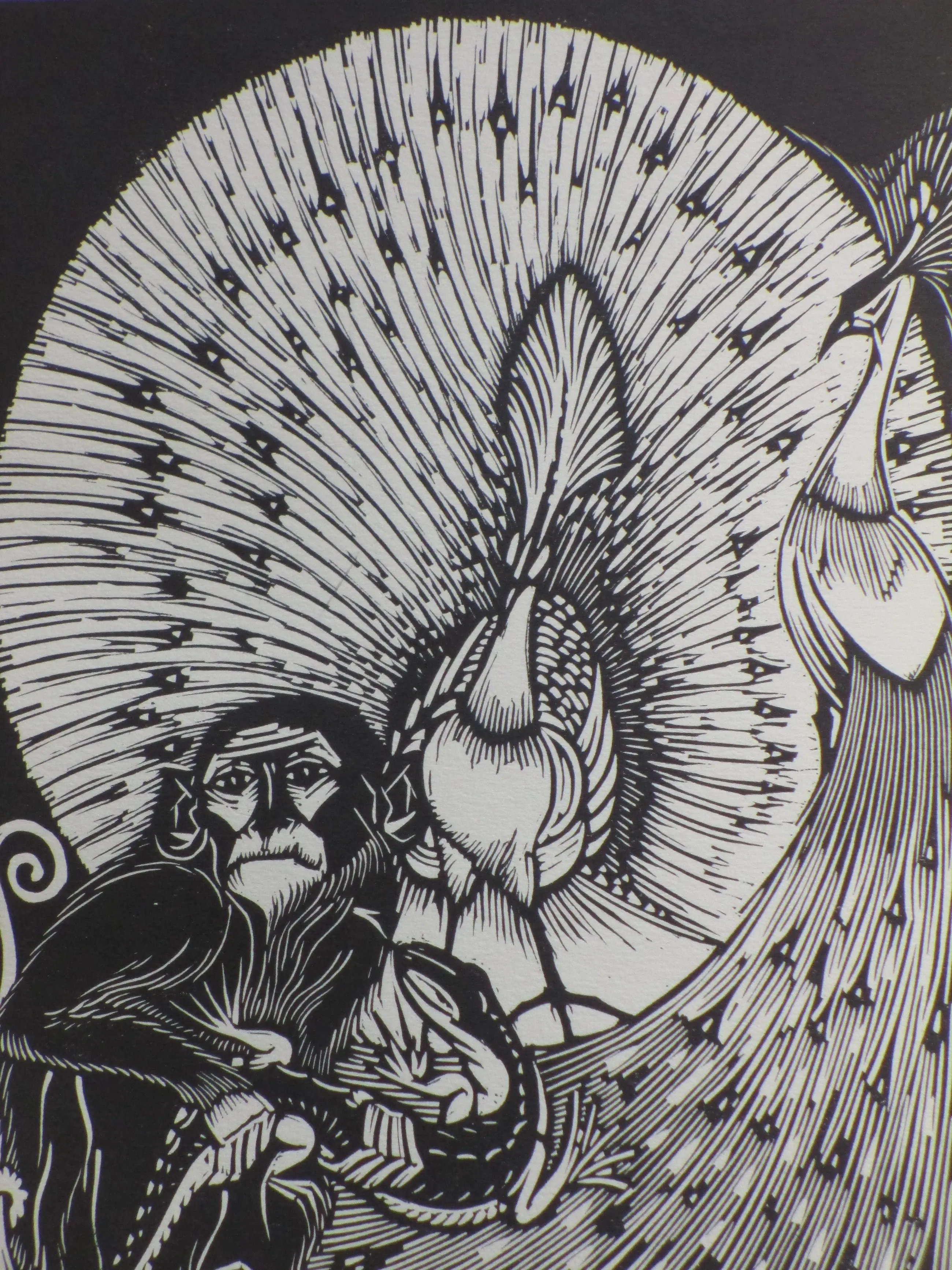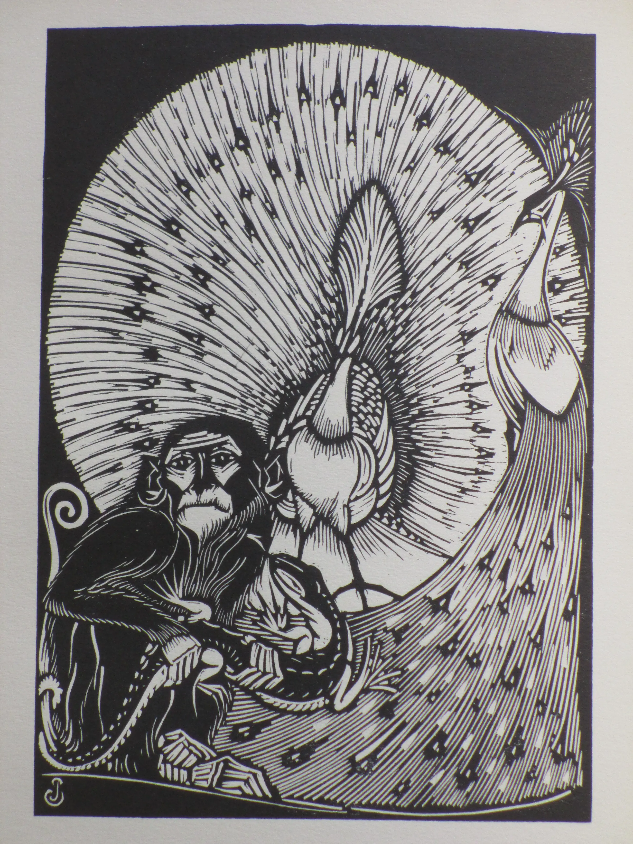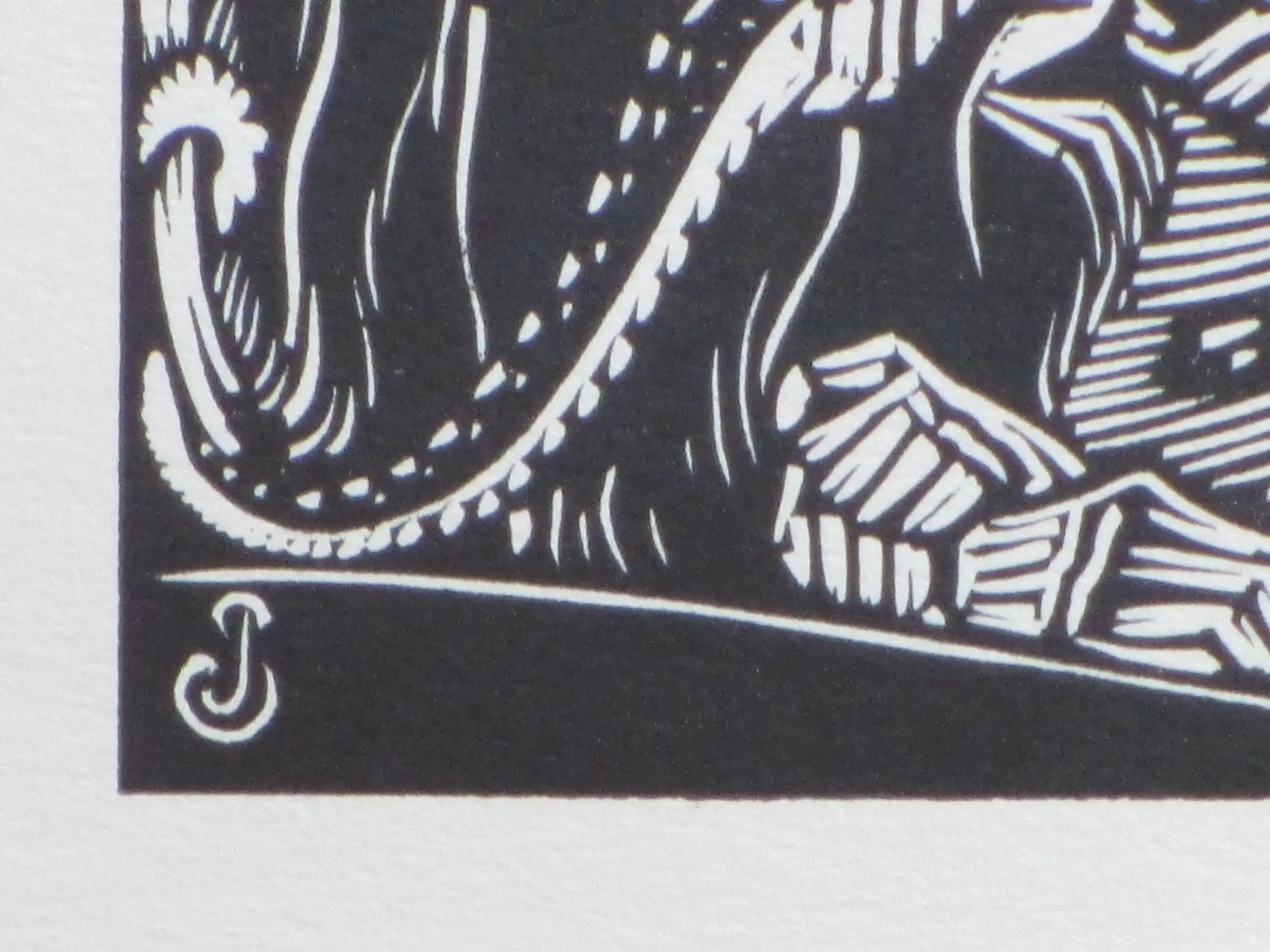 Houtsnede door Jan Schonk Voorstelling van twee pauwen, een aap en een hagedis Losbladig, beeldmaat 19x13,5, bladmaat 32x24 Gemonogrammeerd l.o. in de druk Authenticiteit volledig gegarandeerd