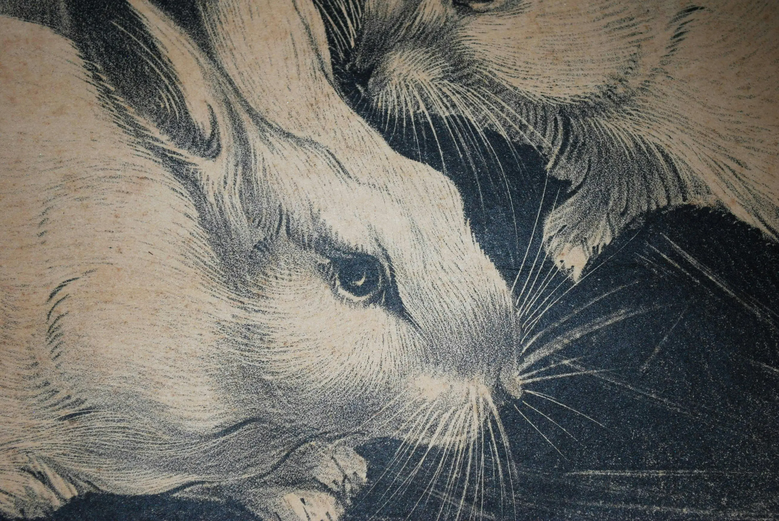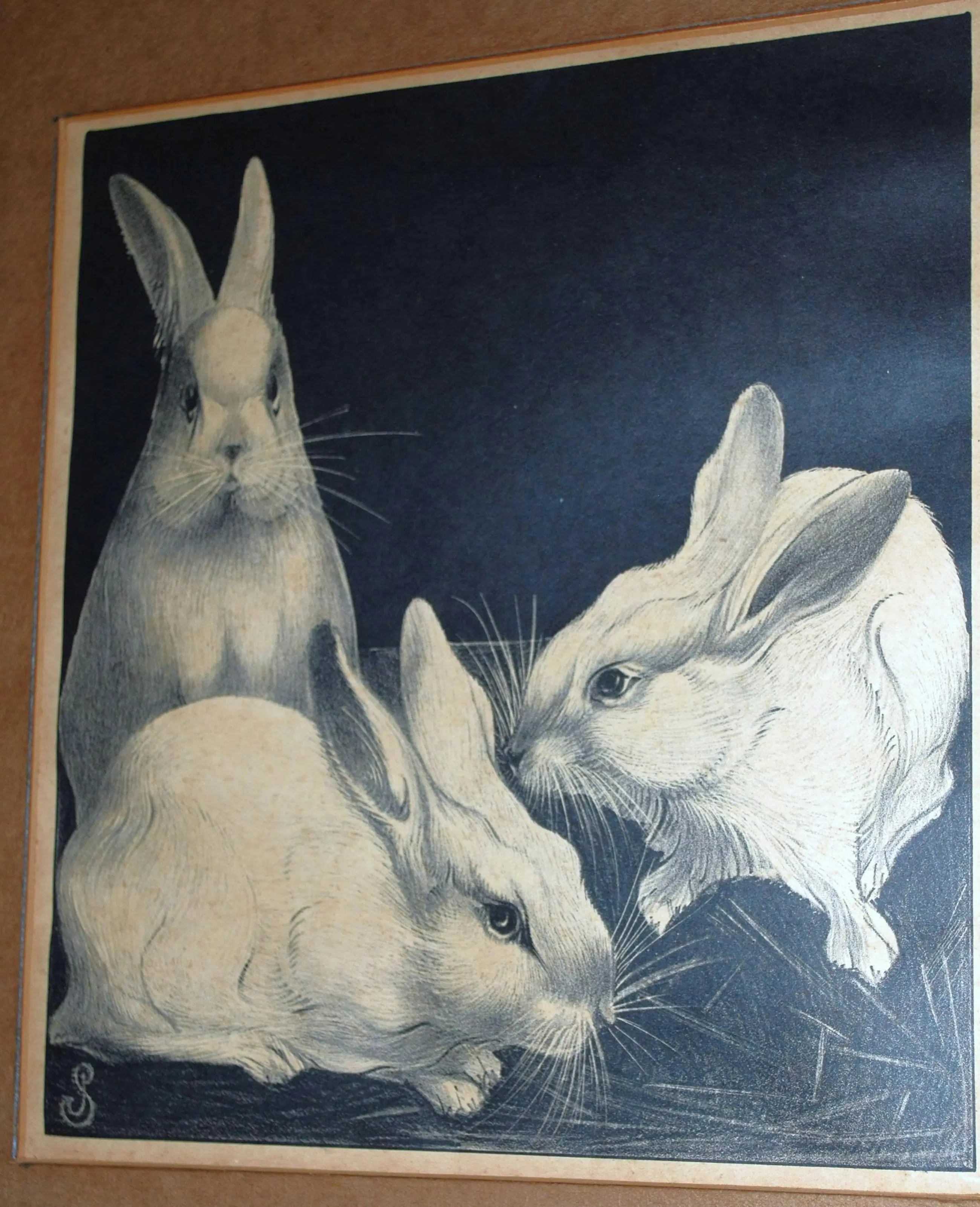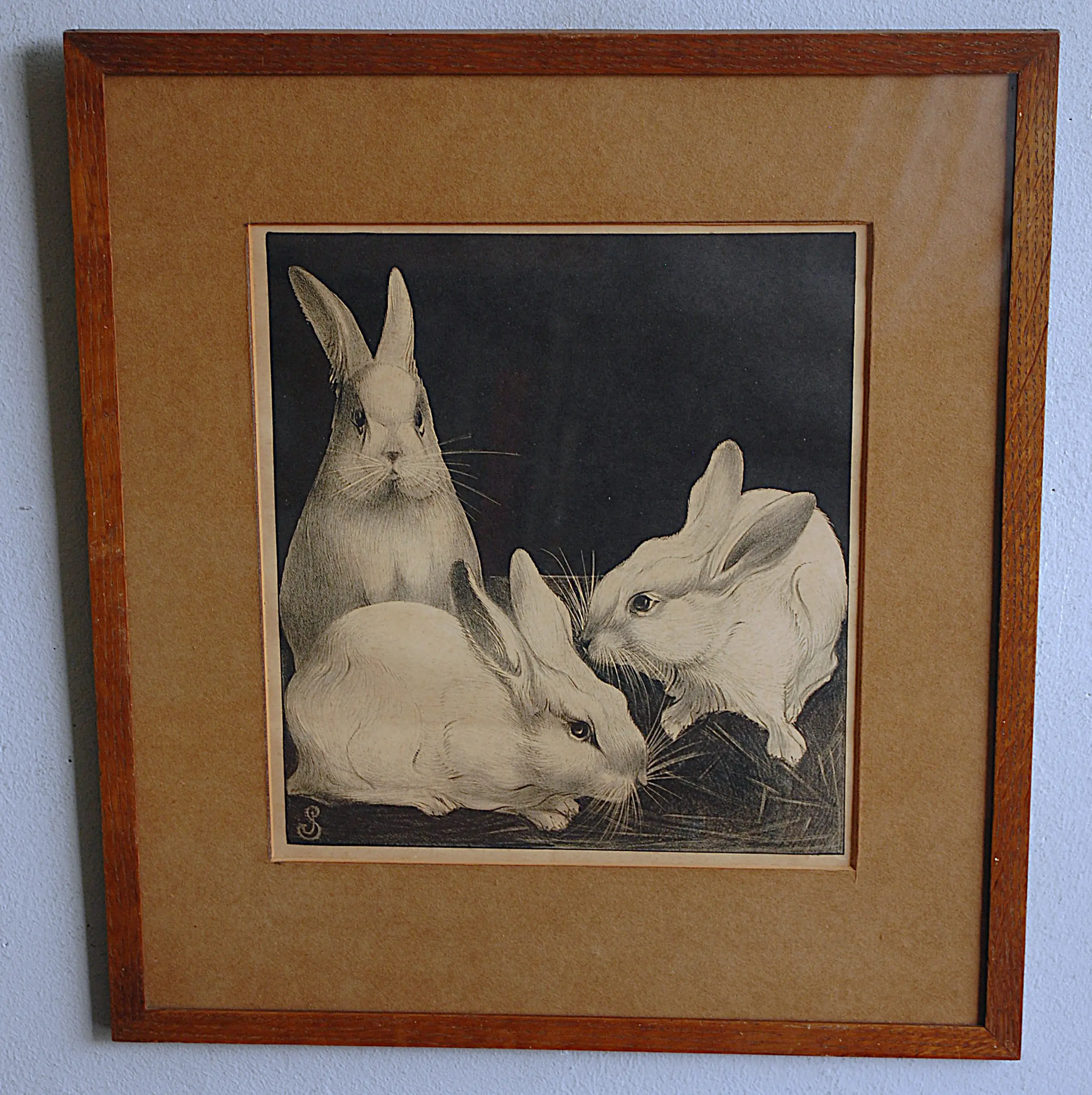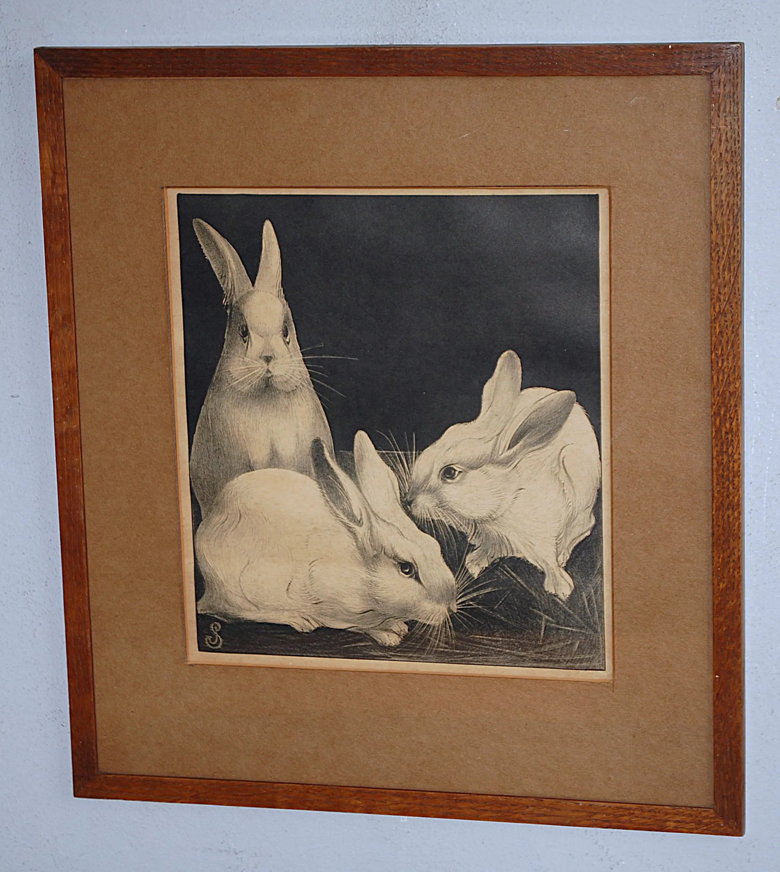 Schaarse litho (steendruk) van 3 konijnen.Bladmaat ca 35x25 cm. Bevestigd achter het originele passepartout. In goede staat (lichte horizontale kreuk onderaan). Achter glas in de originele hardhouten lijst. Het achterkarton is vernieuwd.