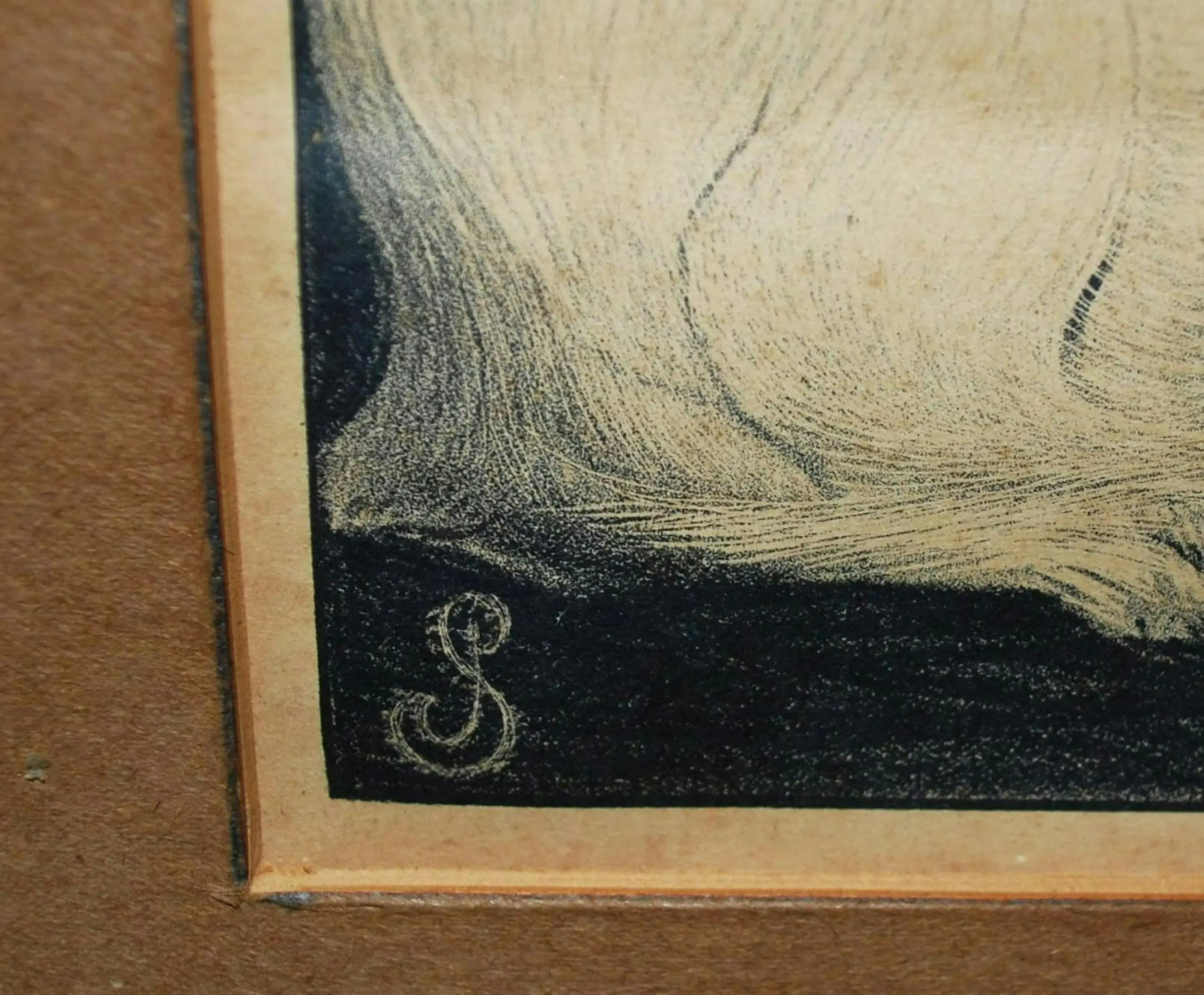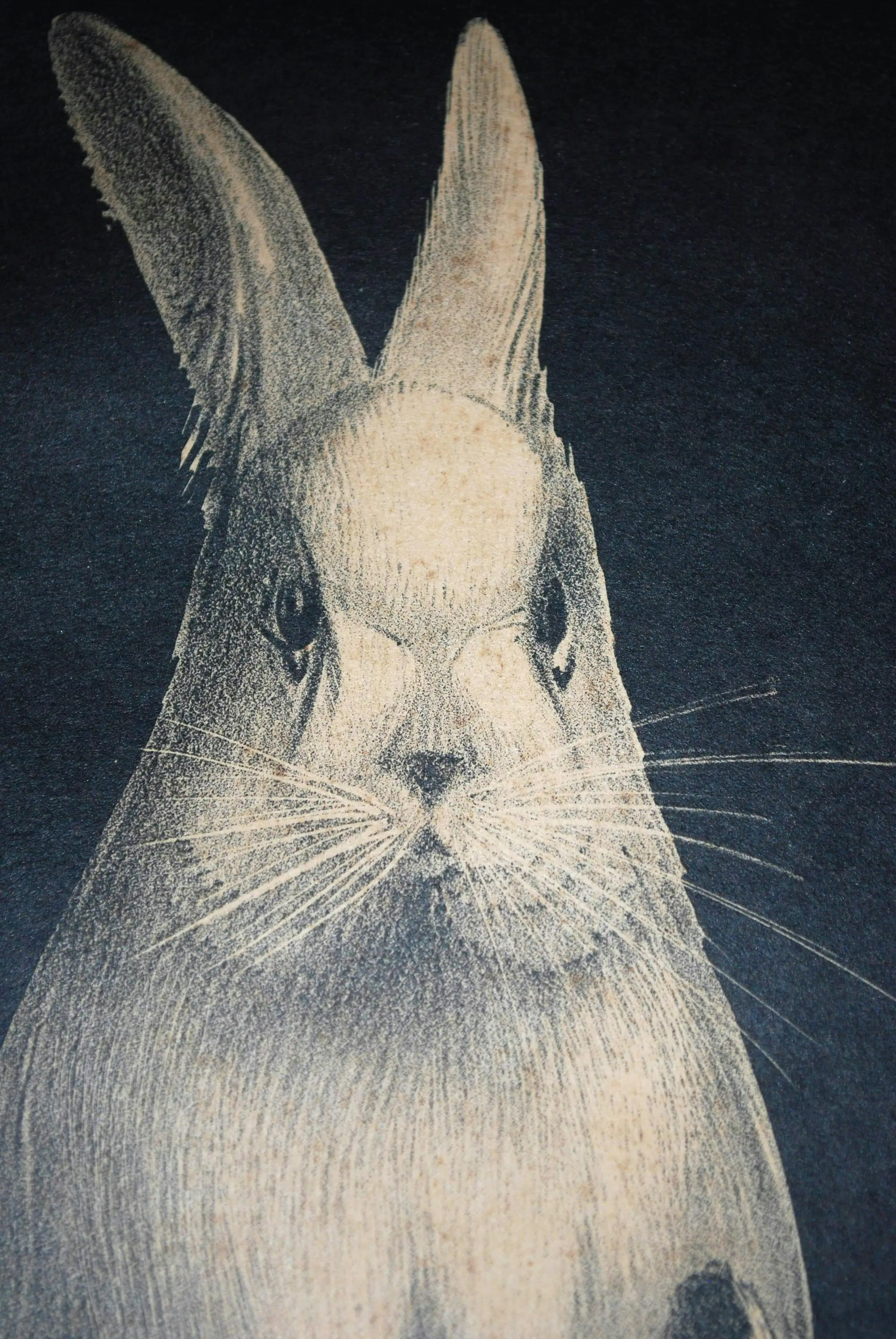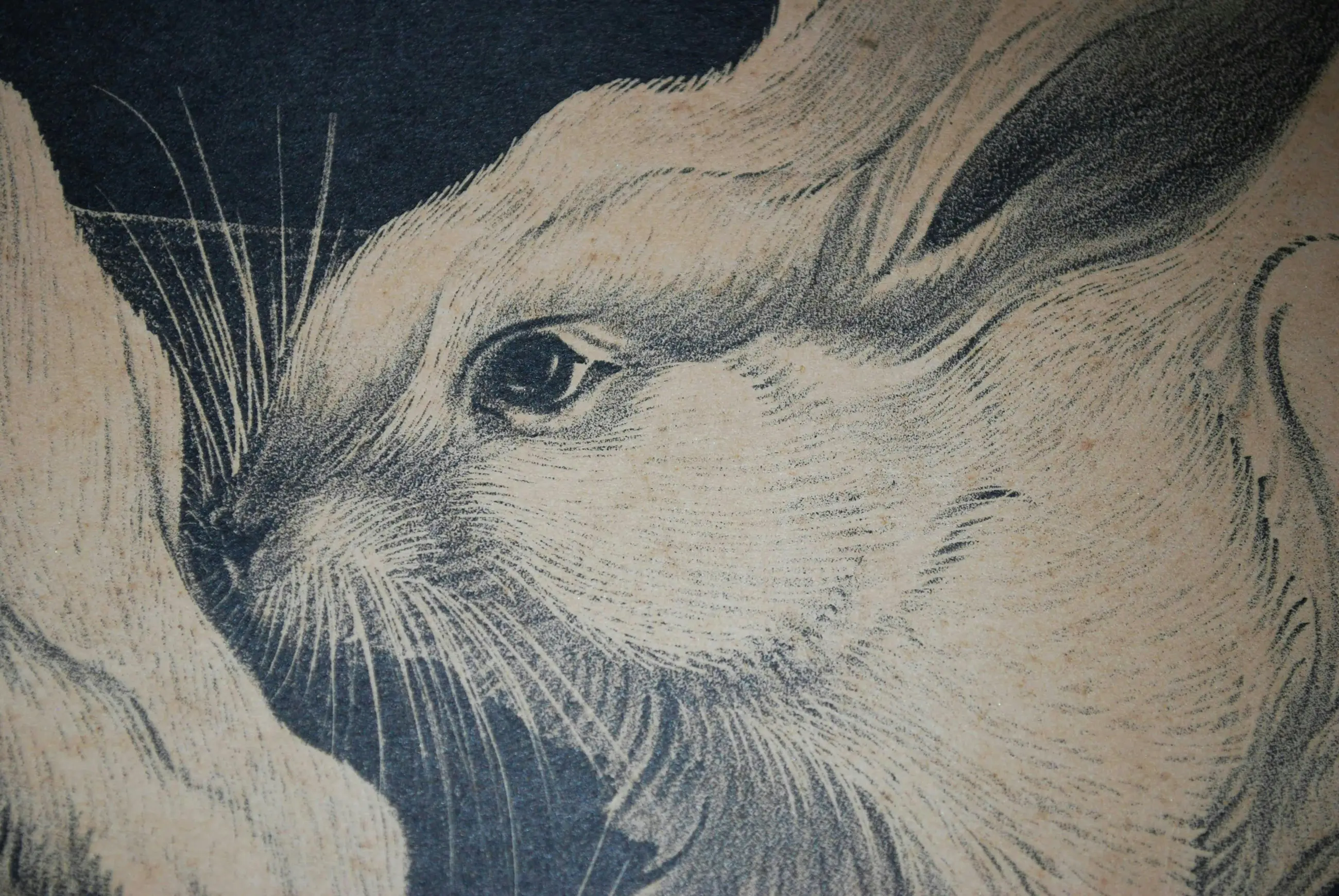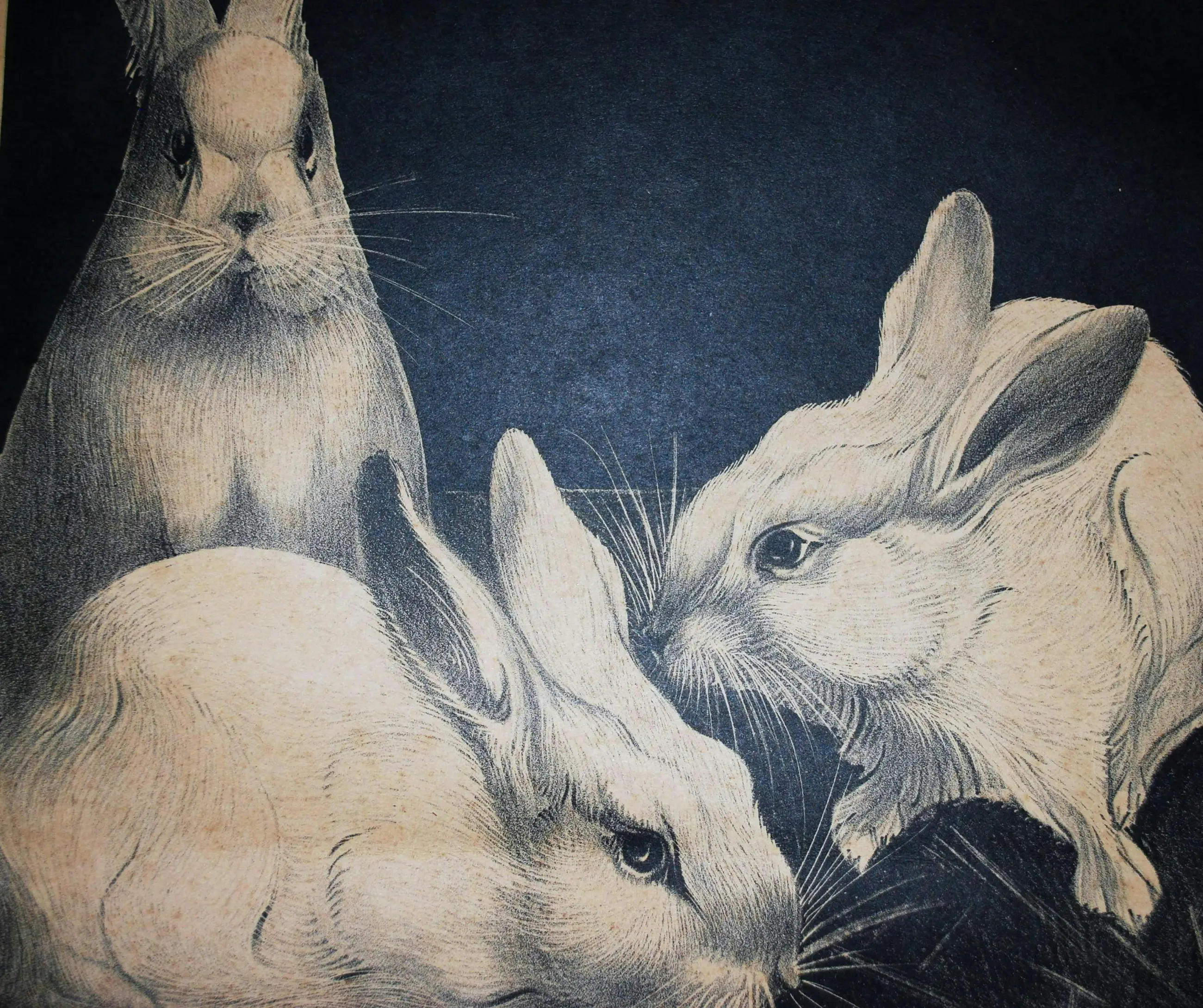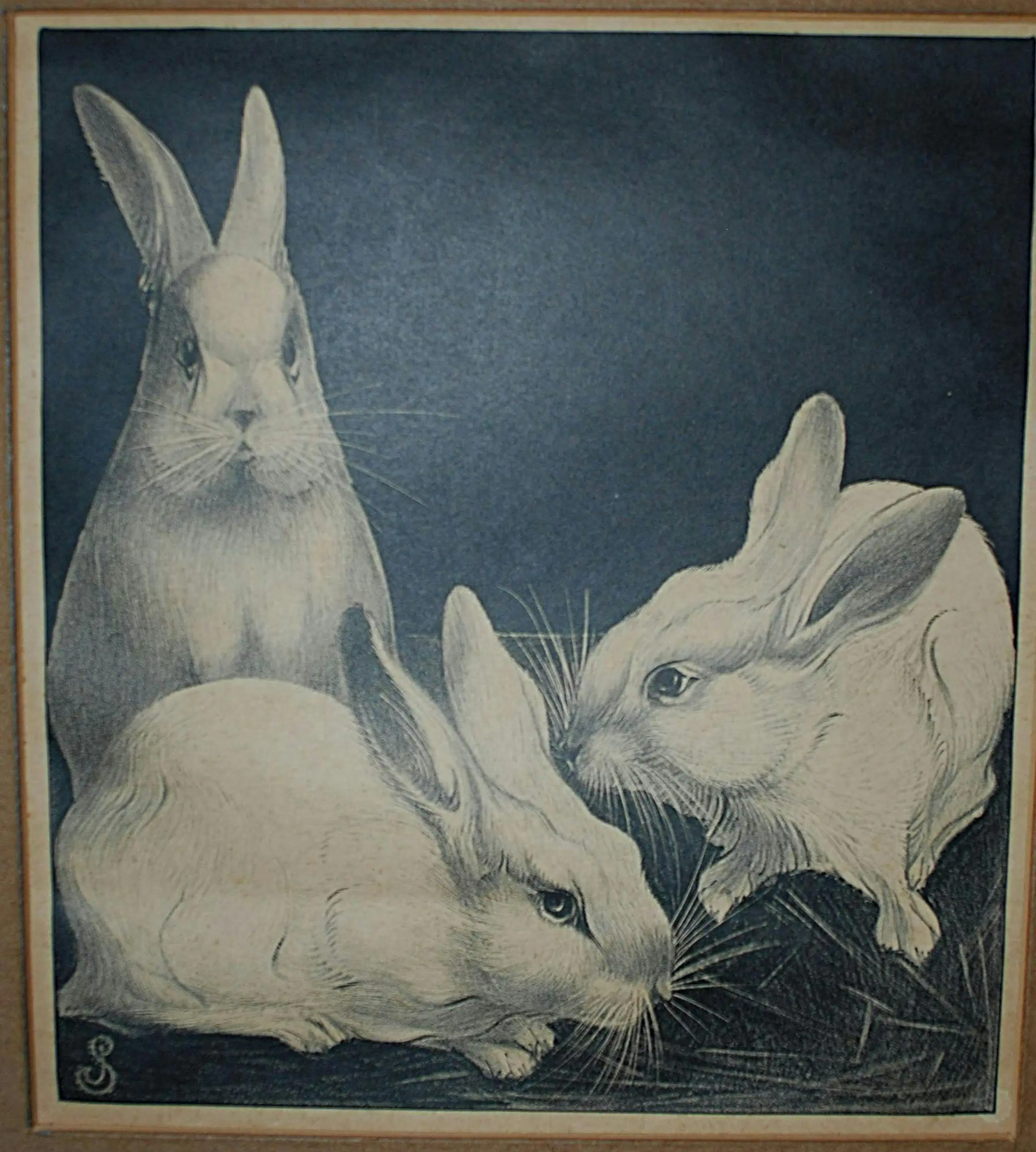 Schaarse litho (steendruk) van 3 konijnen.Bladmaat ca 35x25 cm. Bevestigd achter het originele passepartout. In goede staat (lichte horizontale kreuk onderaan). Achter glas in de originele hardhouten lijst. Het achterkarton is vernieuwd.