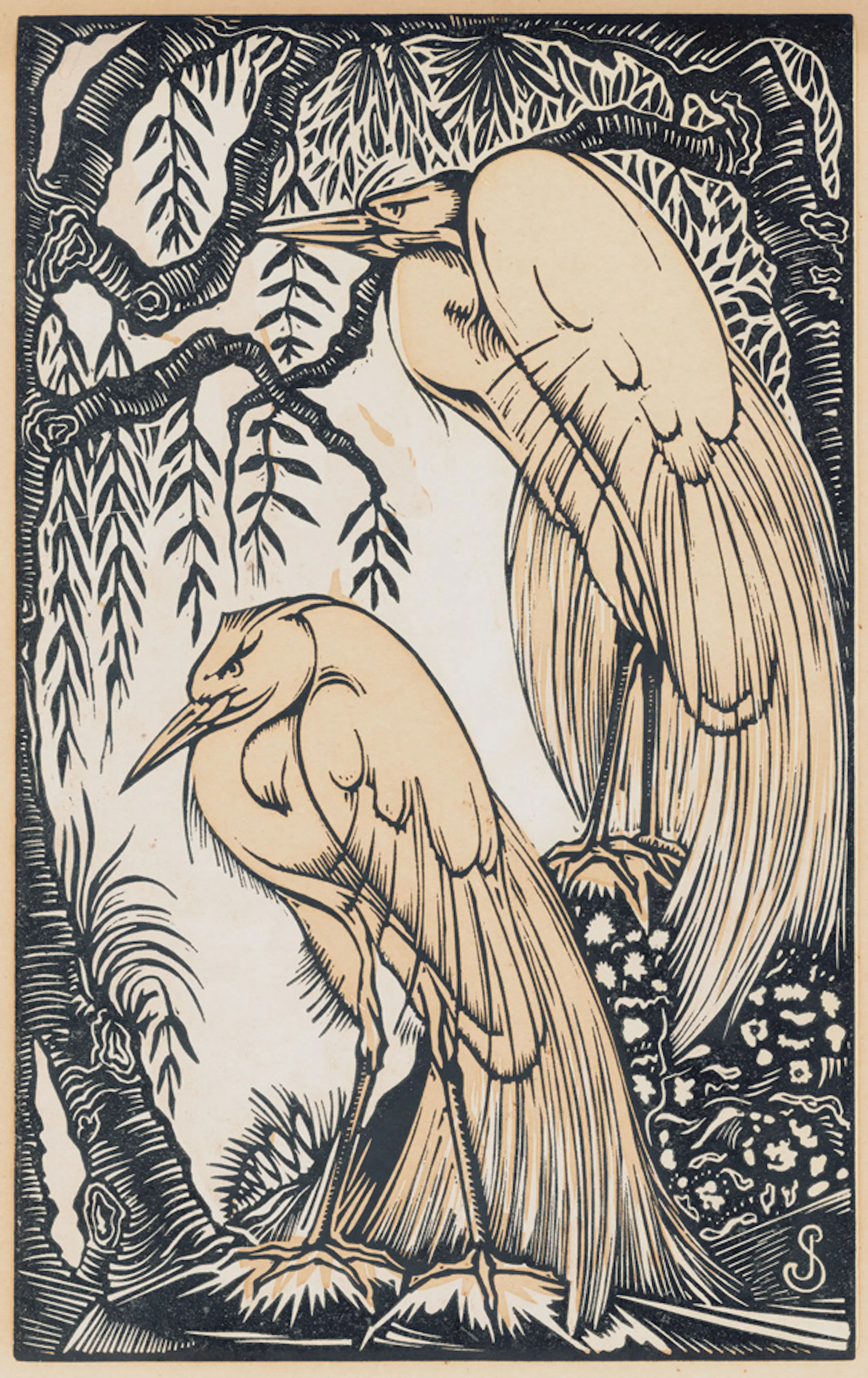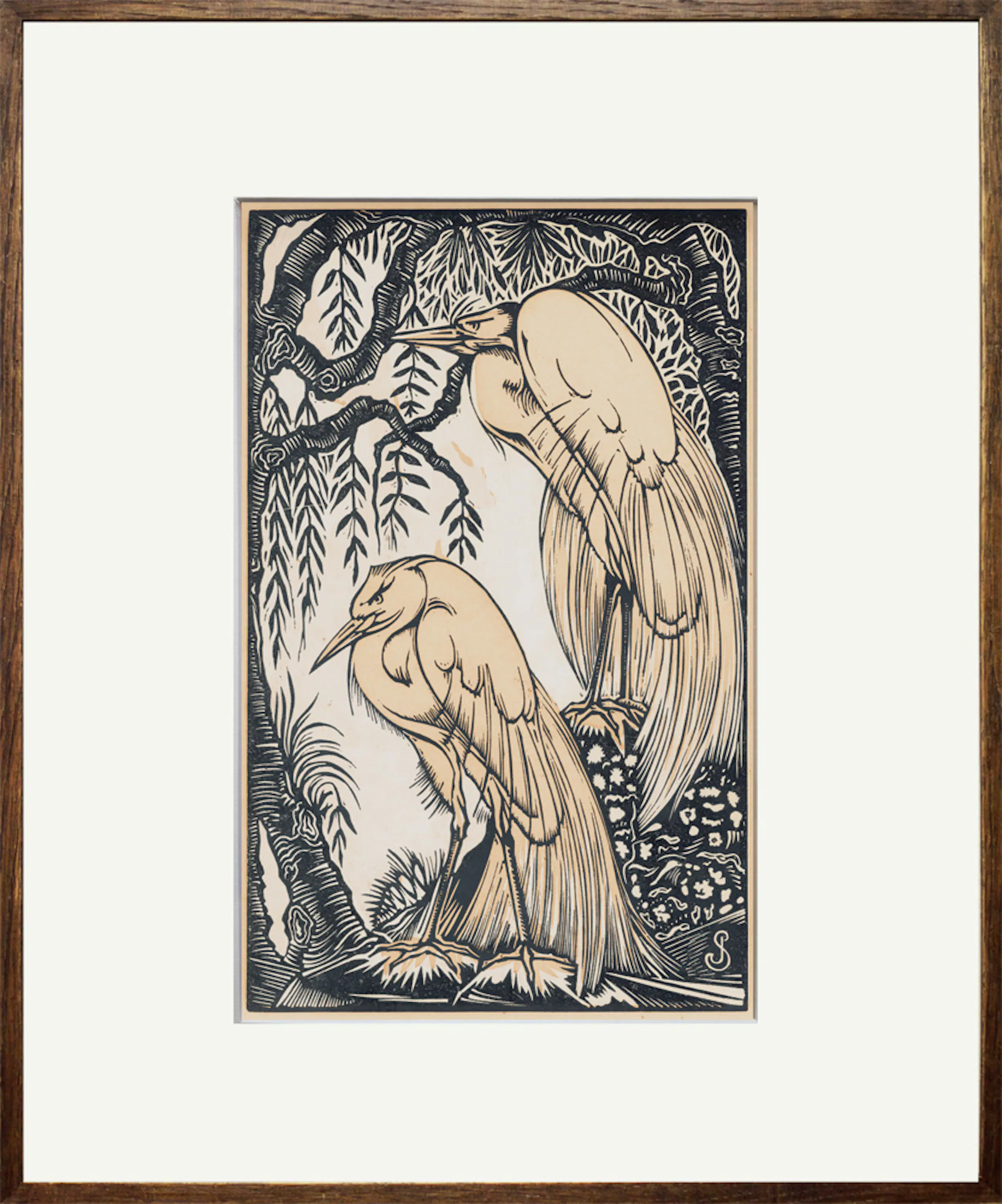 Houtsnede van de Nederlandse kunstenaar Jan Schonk. Afgebeeld zijn twee zilverreigers. De houtsnede is rechtsonder in het houtblok gesigneerd met het monogram ‘JS’ wat staat voor Jan Schonk.