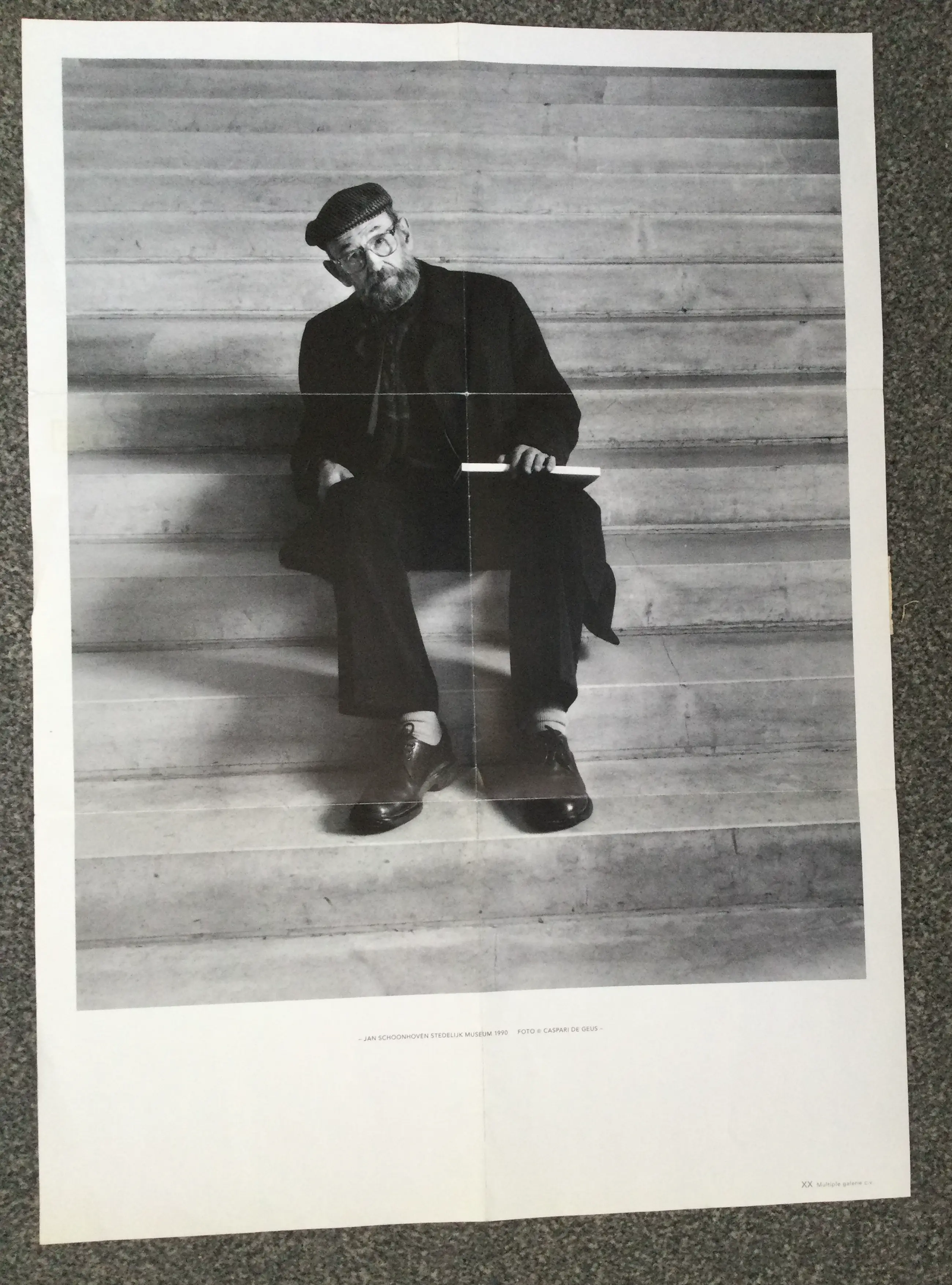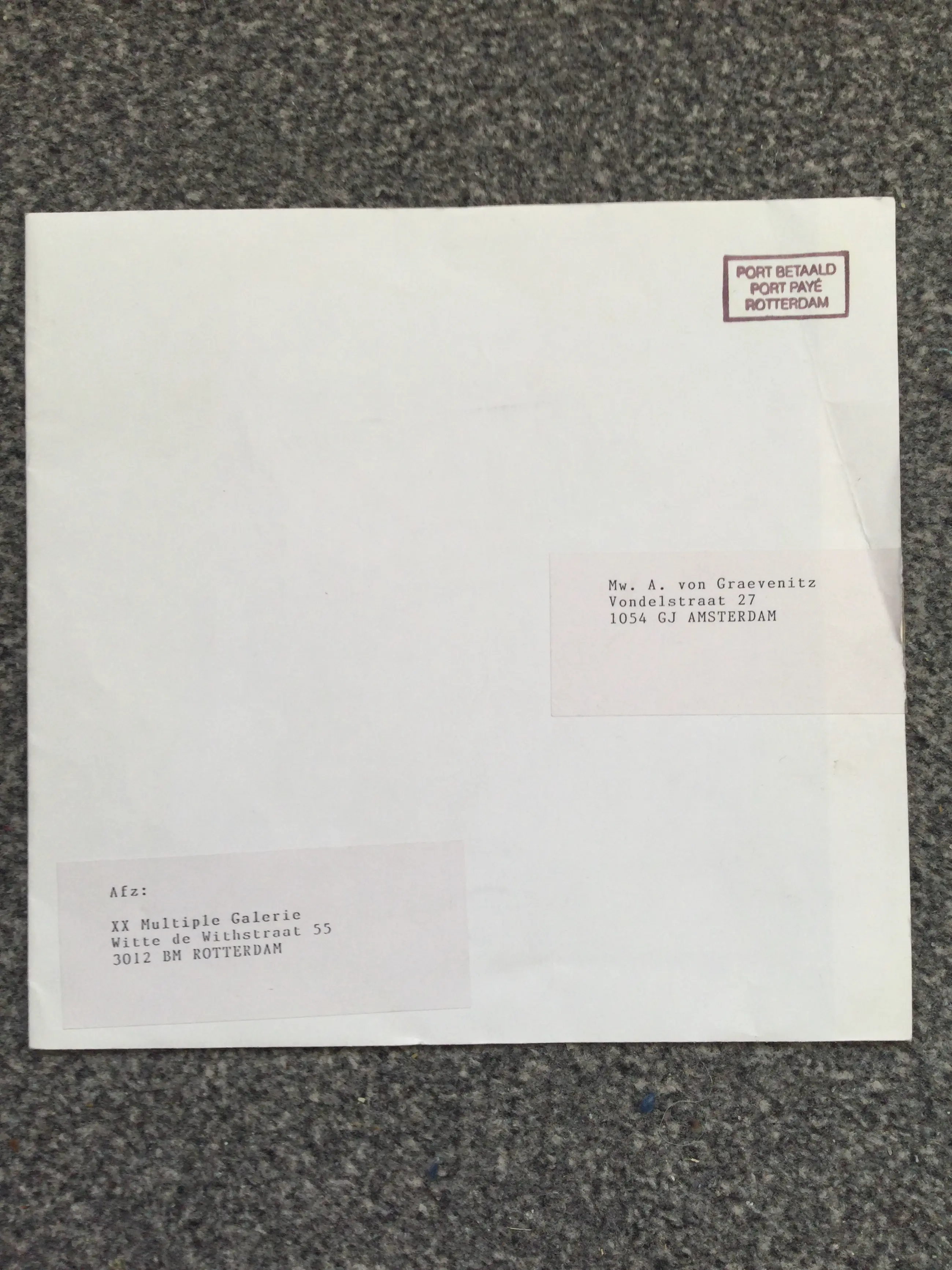 Uitnodiging voor een expositie van het werk van Nul-kunstenaar Jan Schoonhoven in de vorm van een gevouwen poster, gericht aan kunsthistorica en hoogleraar prof. dr. Antje von Graevenitz (echtgenote van wijlen kunstenaar Gerhard von Graevenitz).