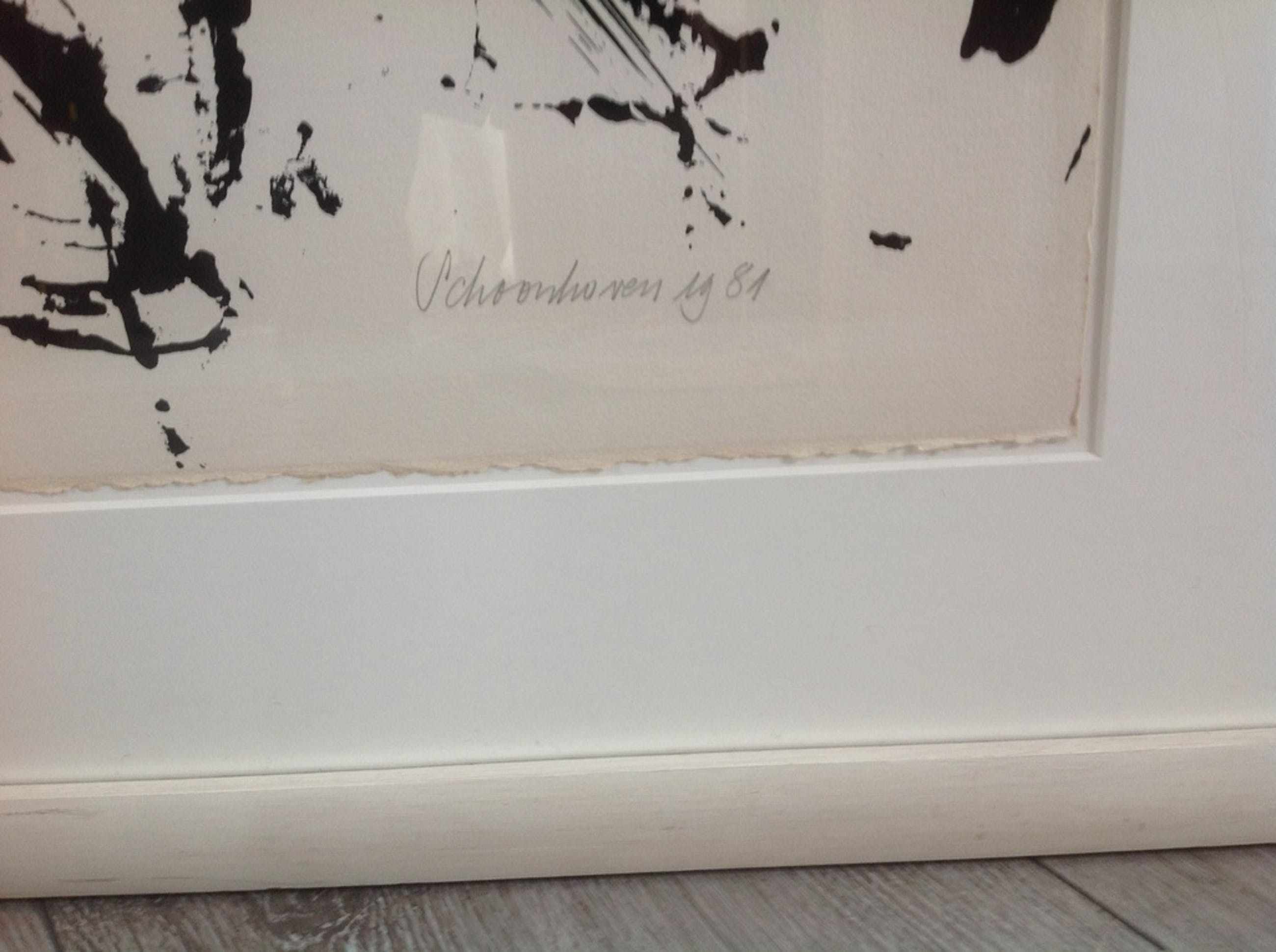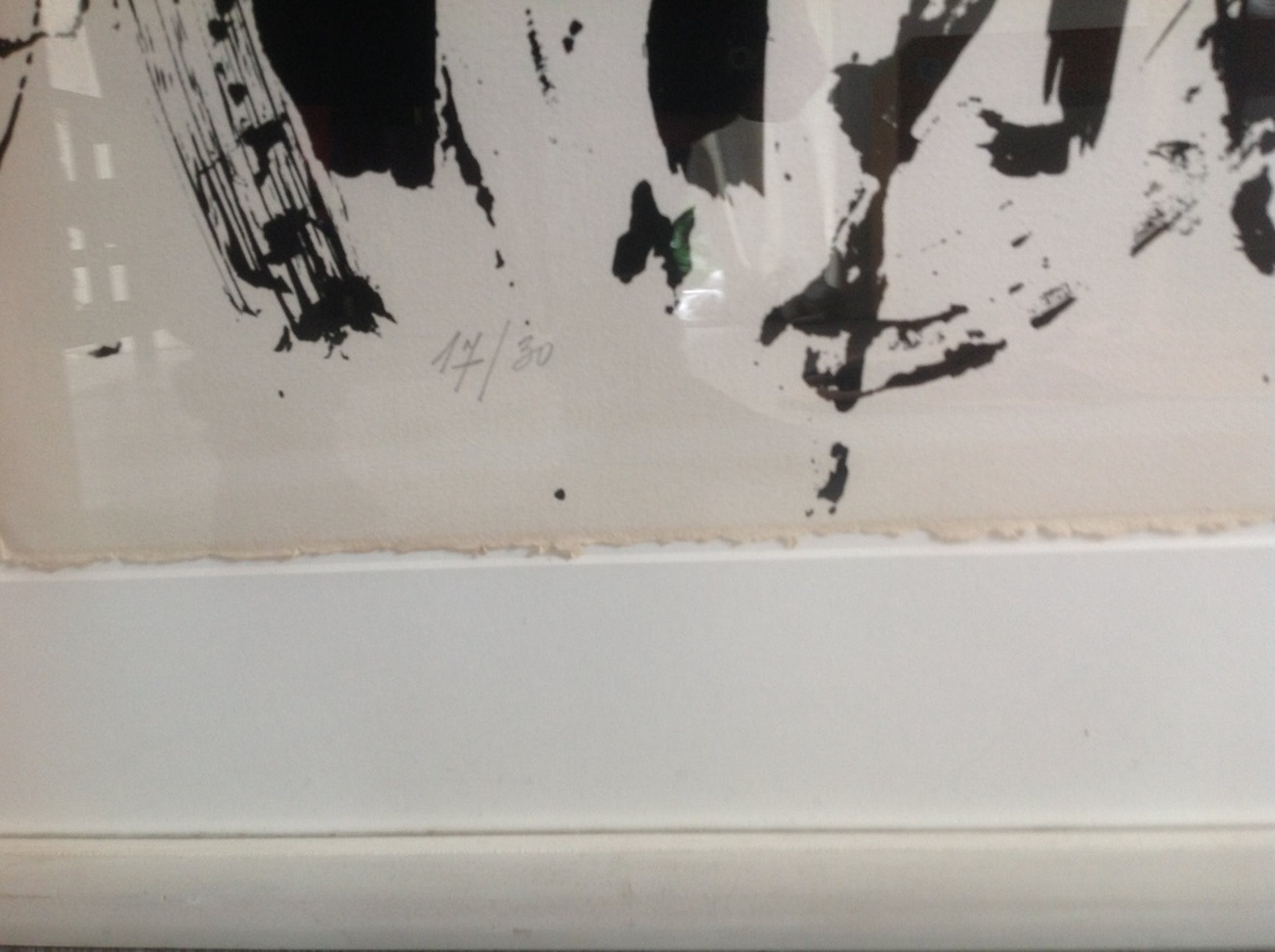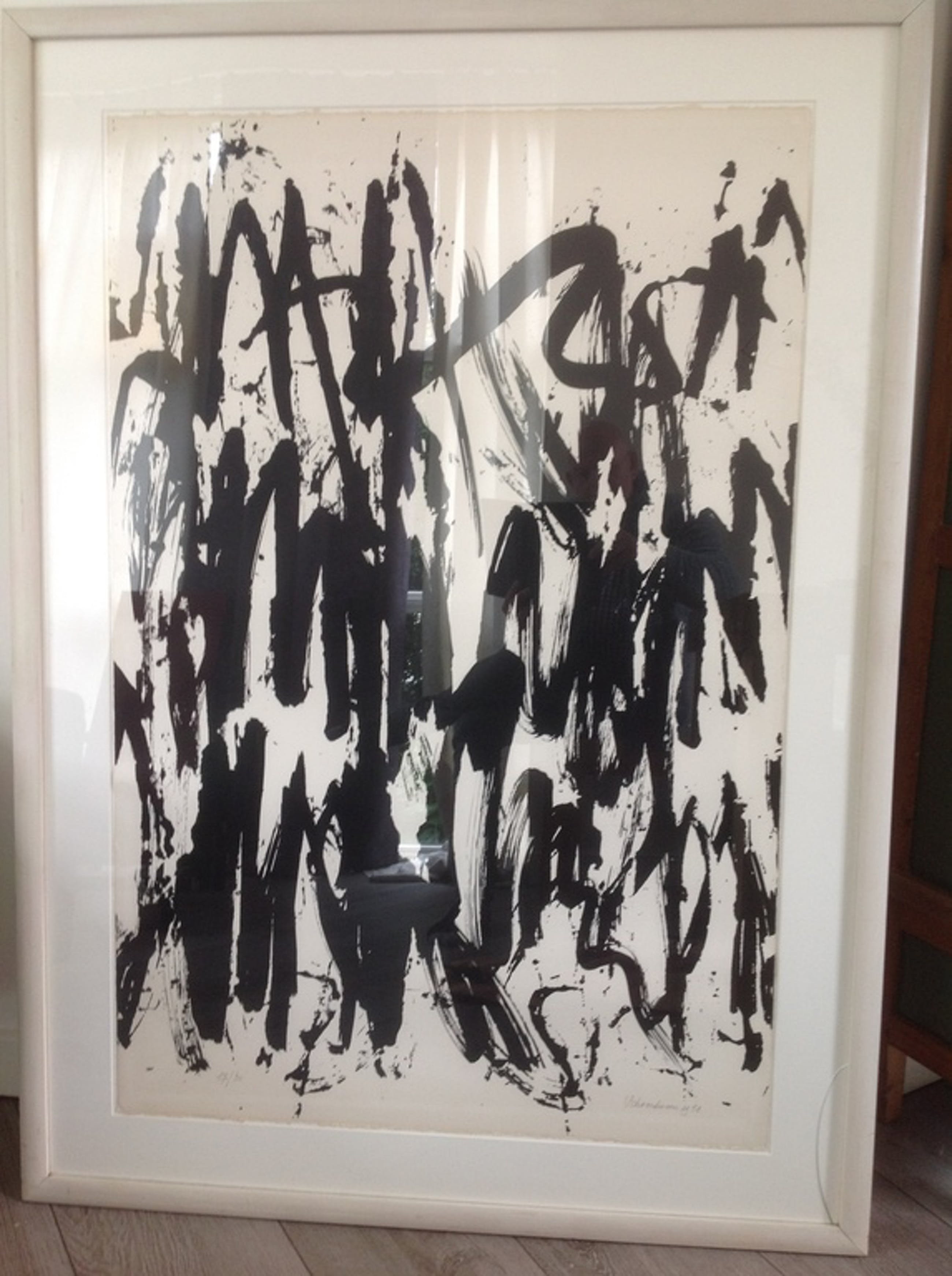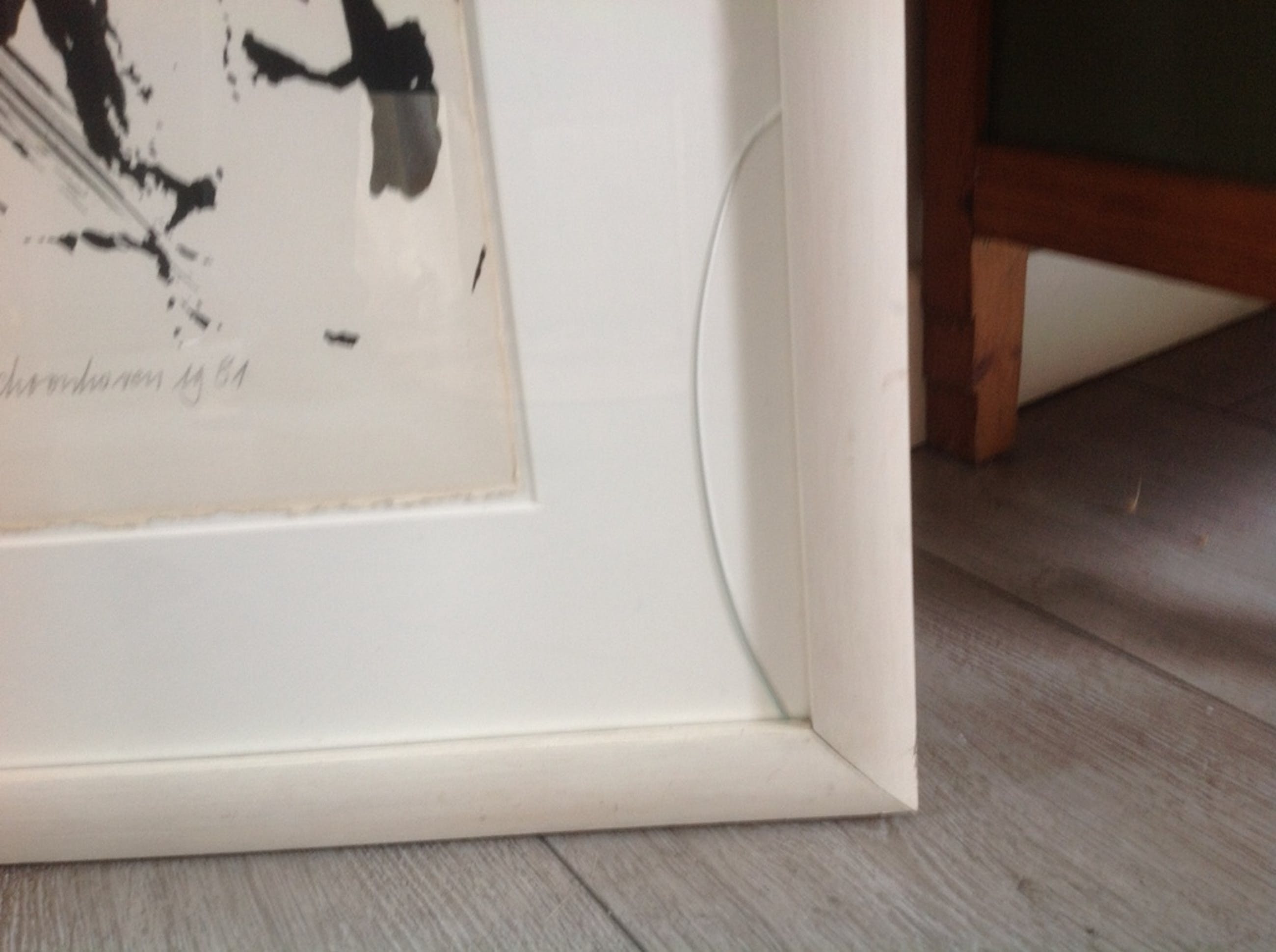 Zoals is te zien op de afneelding 4 zit er helaas een barst in het glas van de lijst. De litho zal opnieuw moeten worden ingelijst door eventuele koper.