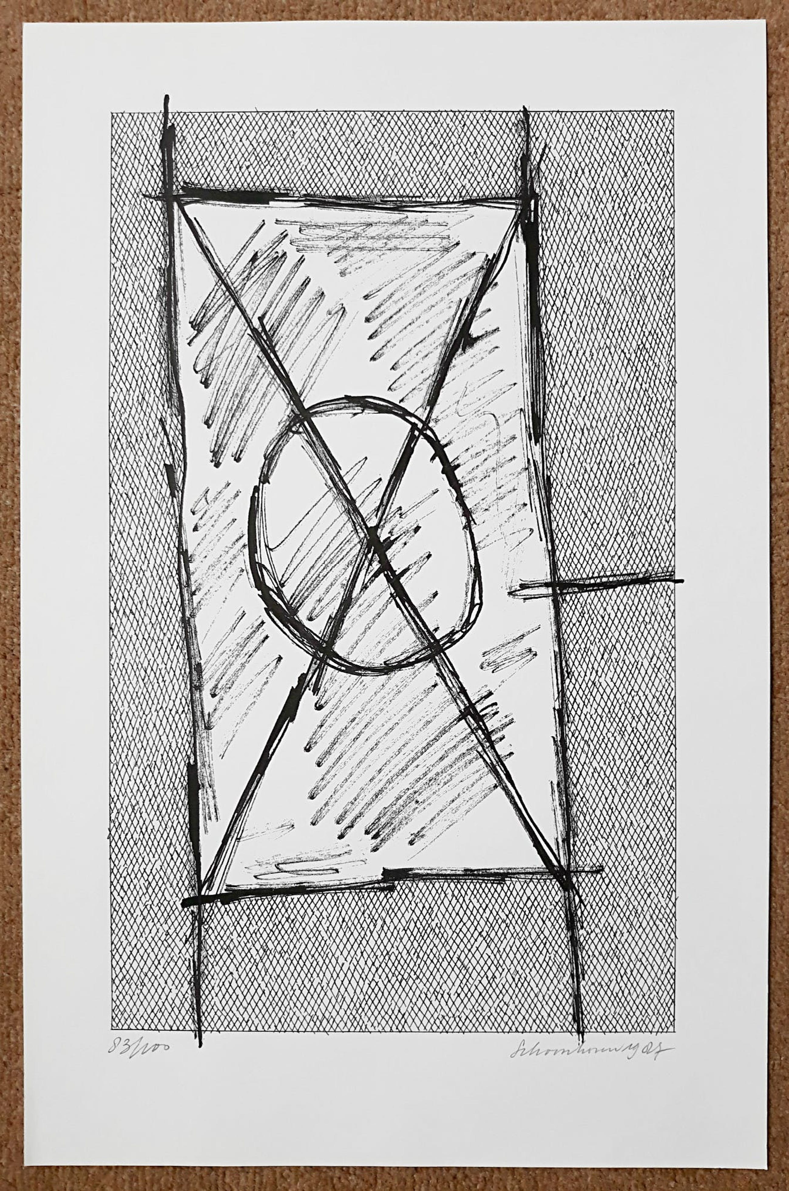 Mooie, karakteristieke compositie uit de portfolio Formatie van Jan Schoonhoven. Zeefdruk op Terlio papier, met potlood gesigneerd, gedateerd (1987) en genummerd (83/100). Gedrukt door Ger Stahlhöfer, uitgegeven door Bébert. In mint conditie.