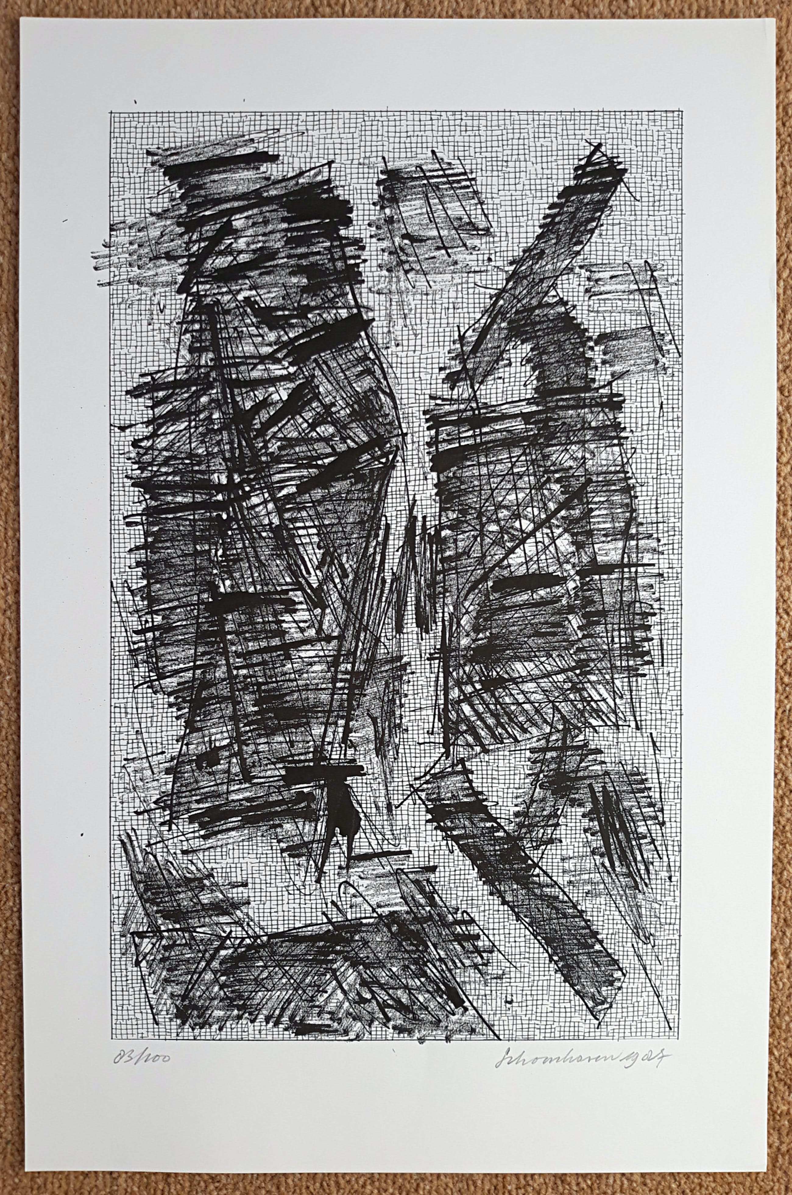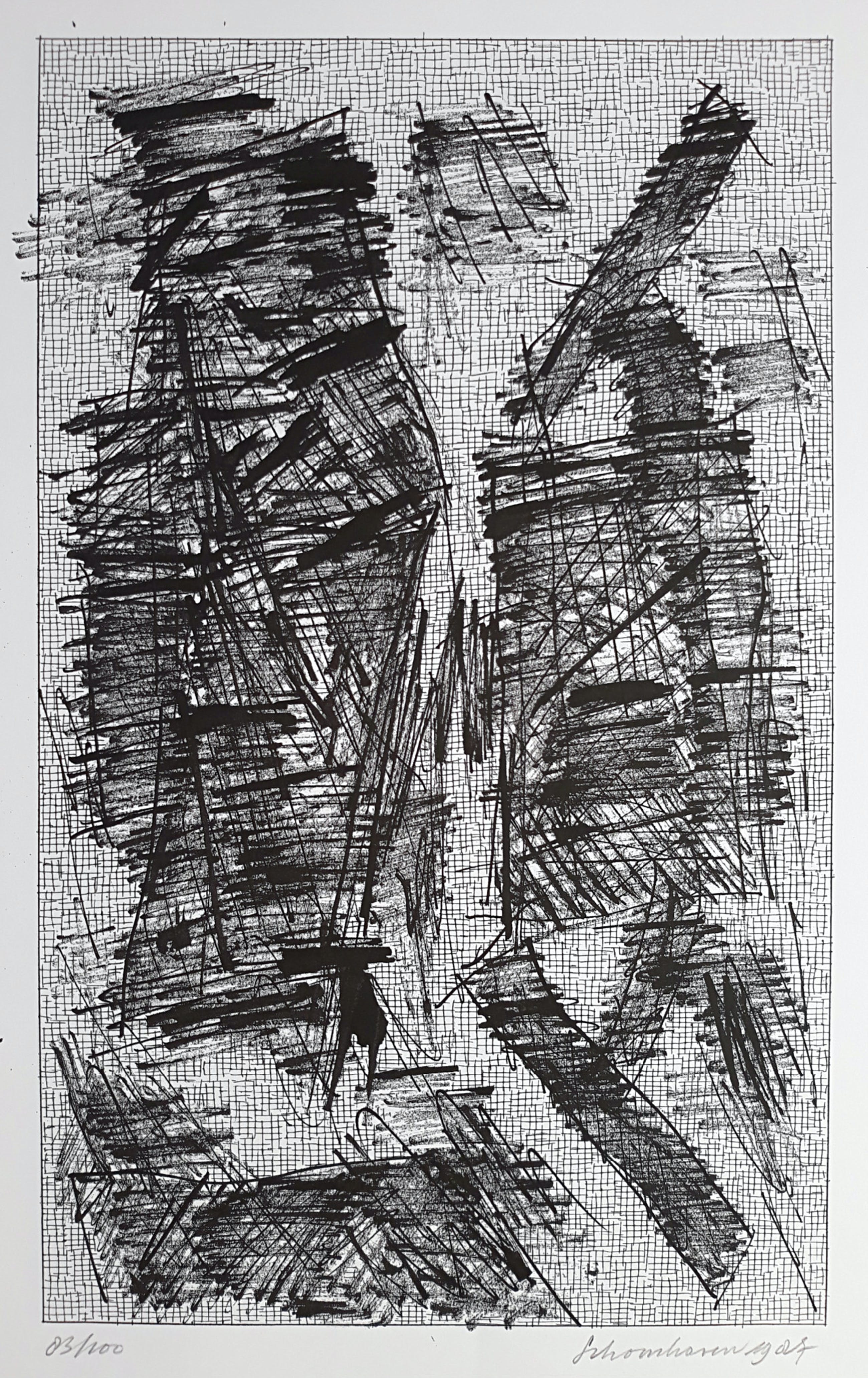 Mooie, karakteristieke compositie uit de portfolio Formatie van Jan Schoonhoven. Zeefdruk op Terlio papier, met potlood gesigneerd, gedateerd (1987) en genummerd (83/100). Gedrukt door Ger Stahlhöfer, uitgegeven door Bébert. In mint conditie.