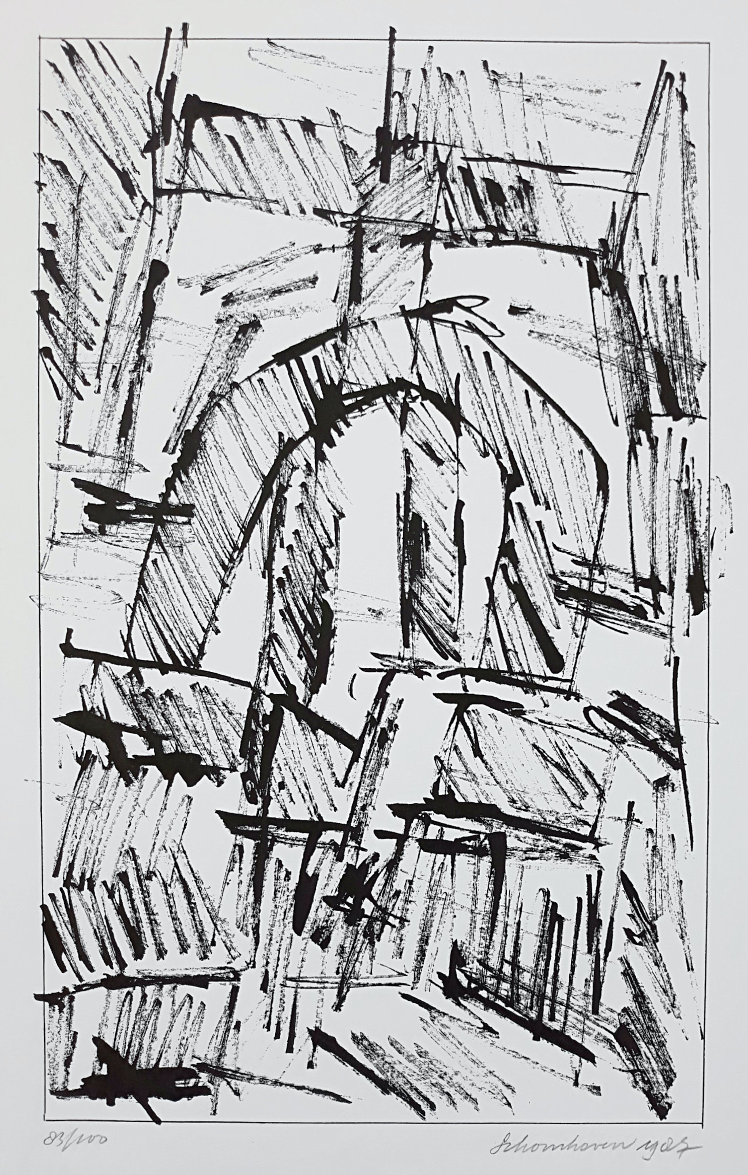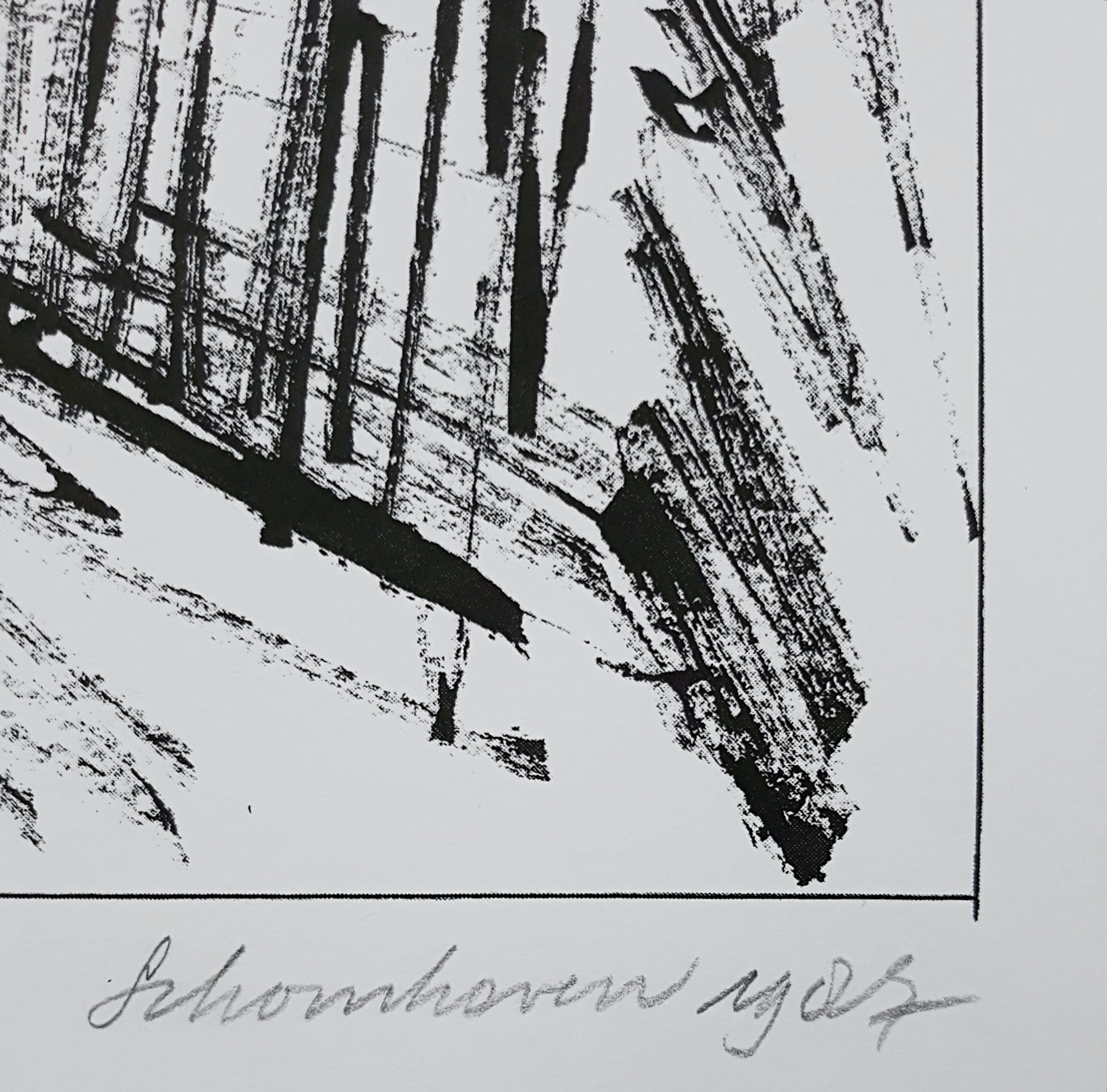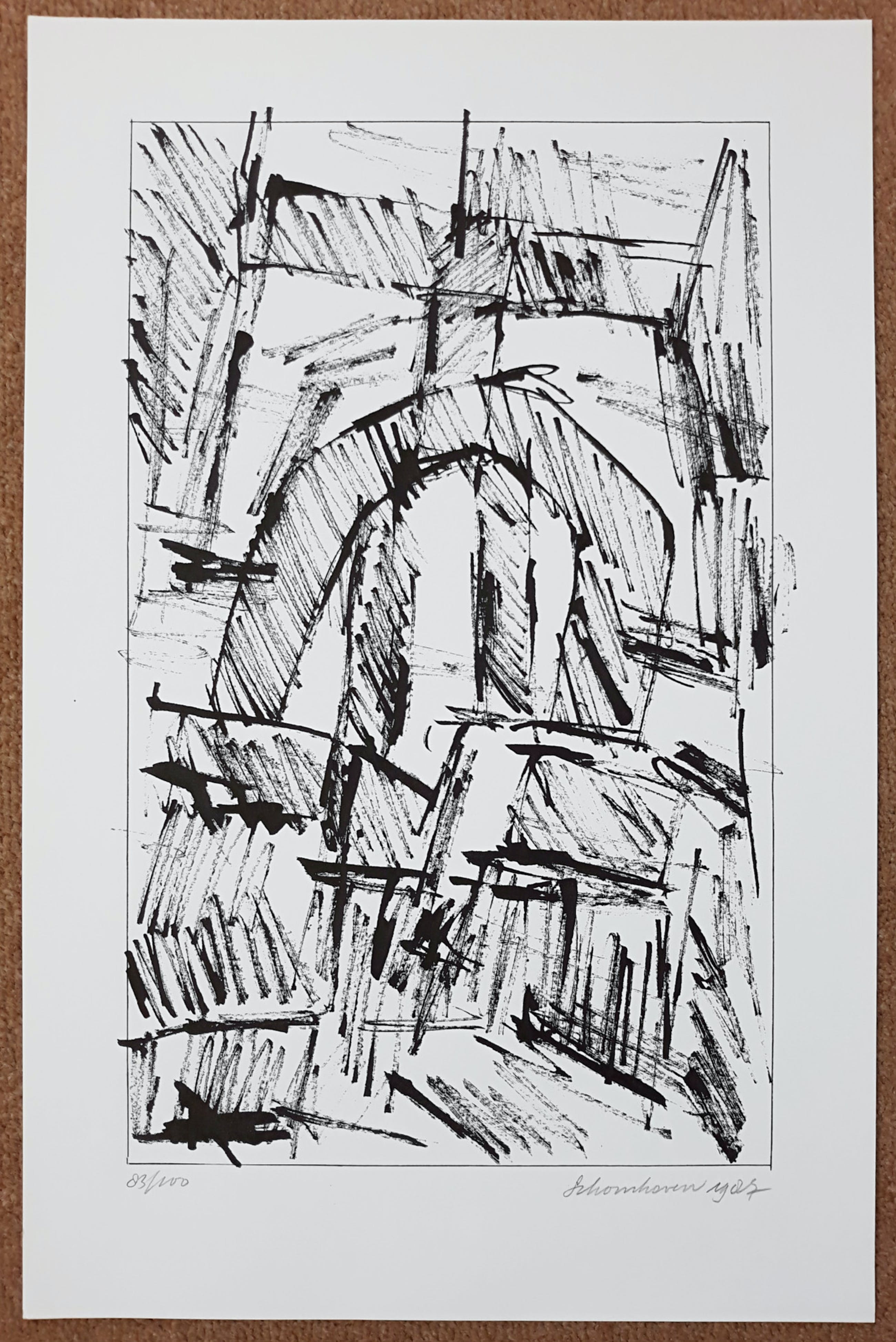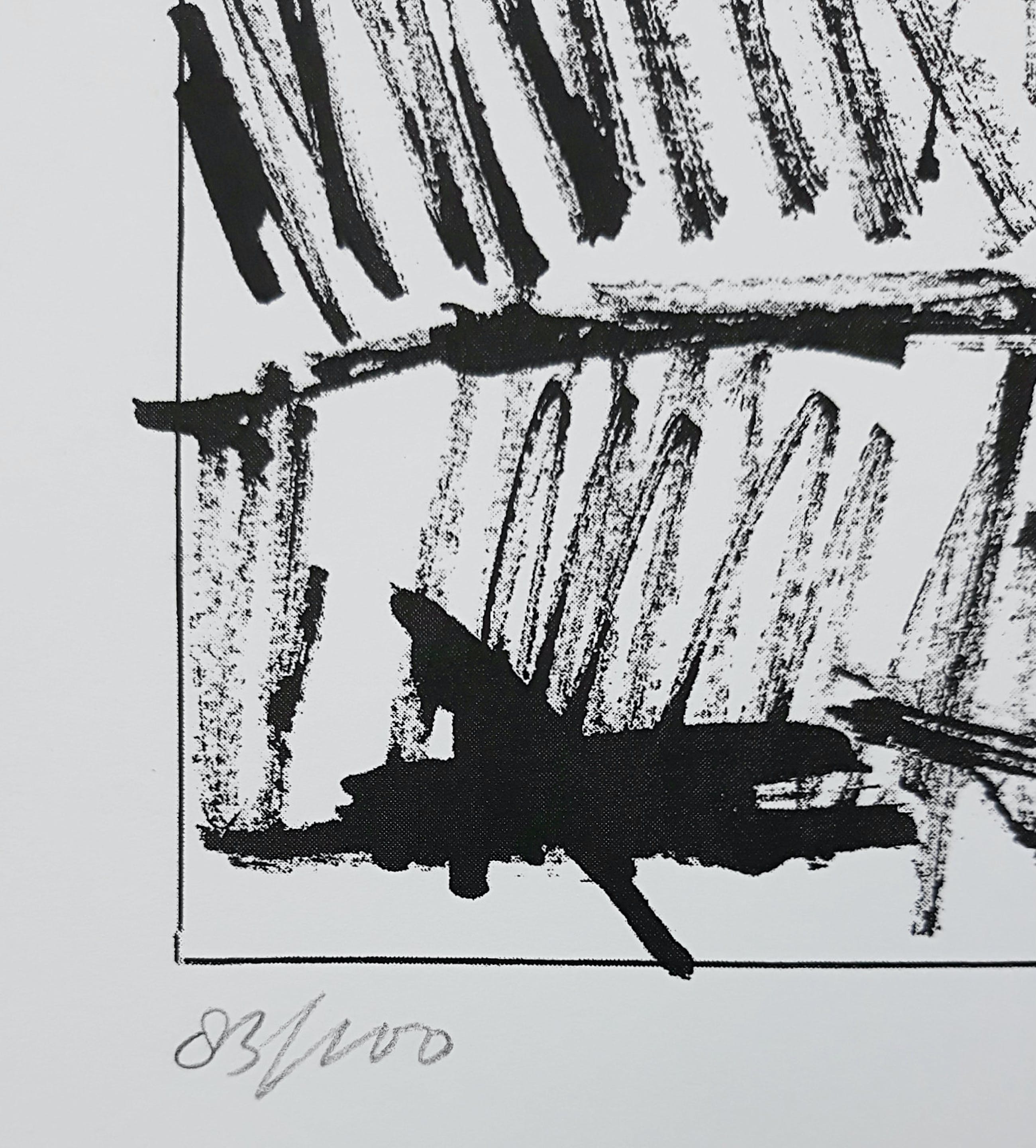 Mooie, karakteristieke compositie uit de portfolio Formatie van Jan Schoonhoven. Zeefdruk op Terlio papier, met potlood gesigneerd, gedateerd (1987) en genummerd (83/100). Gedrukt door Ger Stahlhöfer, uitgegeven door Bébert. In zeer goede conditie; nooit ingelijst geweest want altijd in map opgeborgen gebleven. Slechts miniem vouwtje in uiterste hoek linksonder (ver van het beeld) en lichte aantasting van het oppervlak van het blad in de uiterste hoek linksboven (weer ver van het beeld). Ingelijst met passe-partout is het werk perfect.
