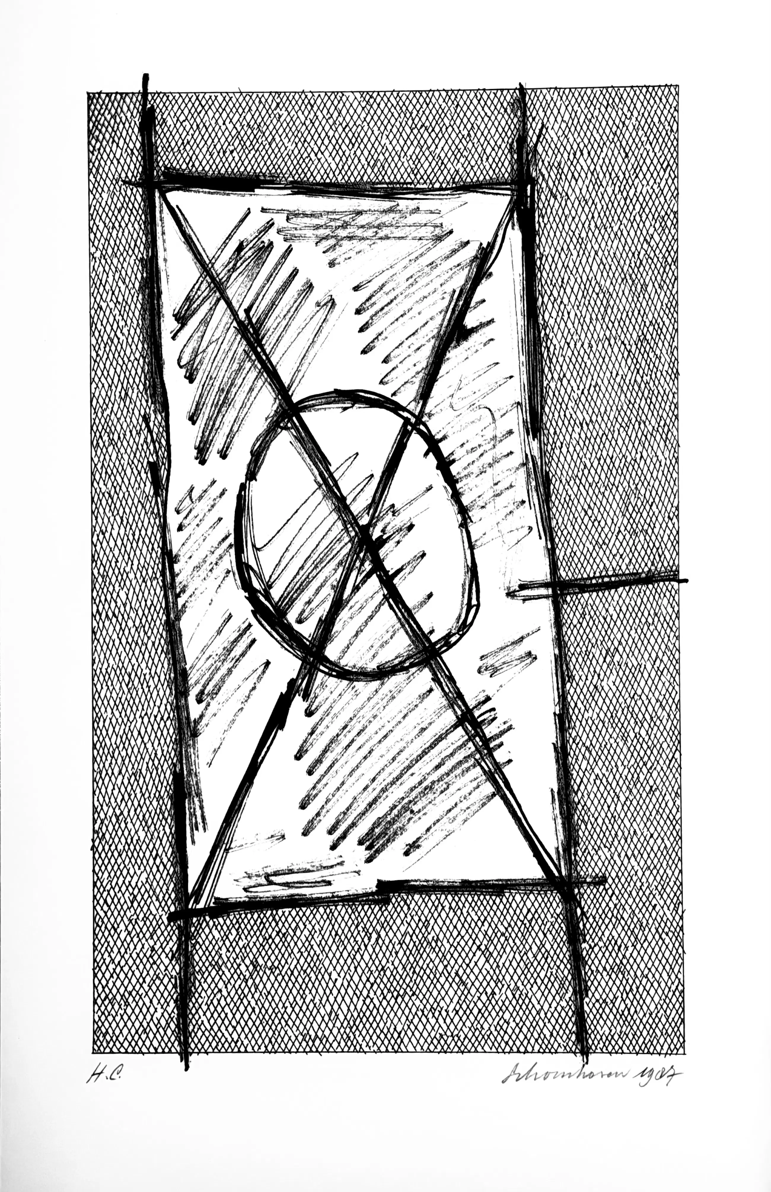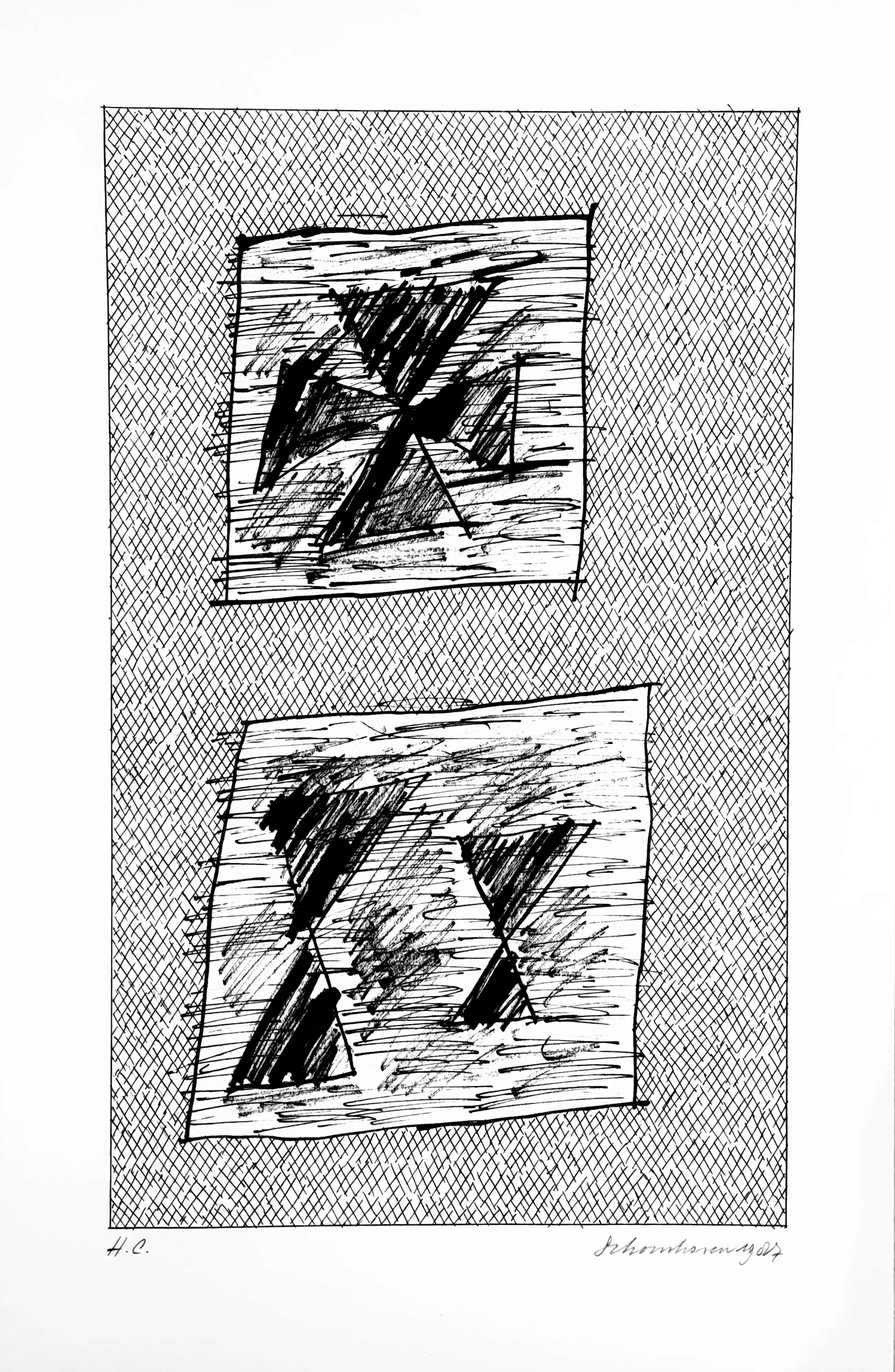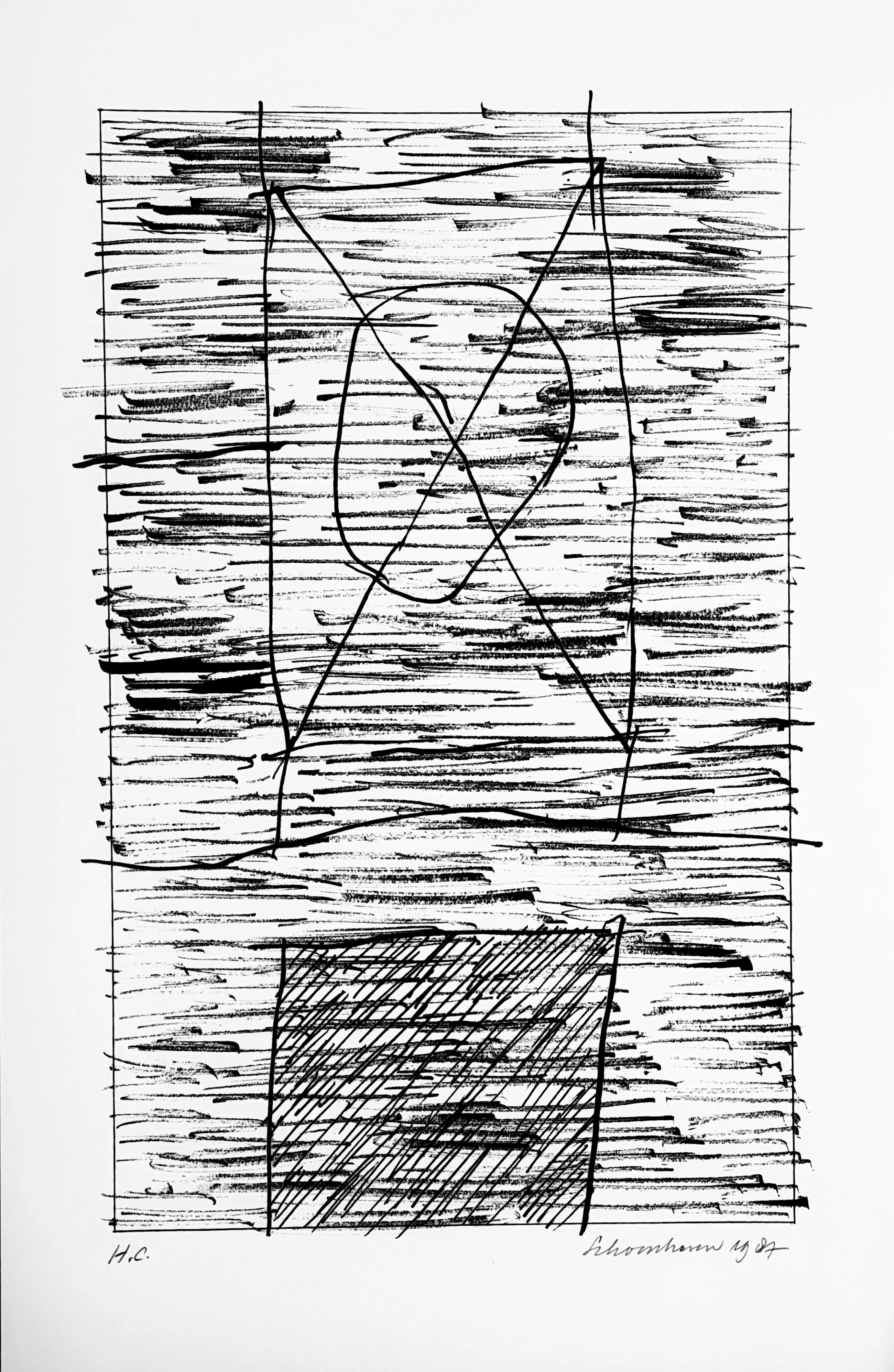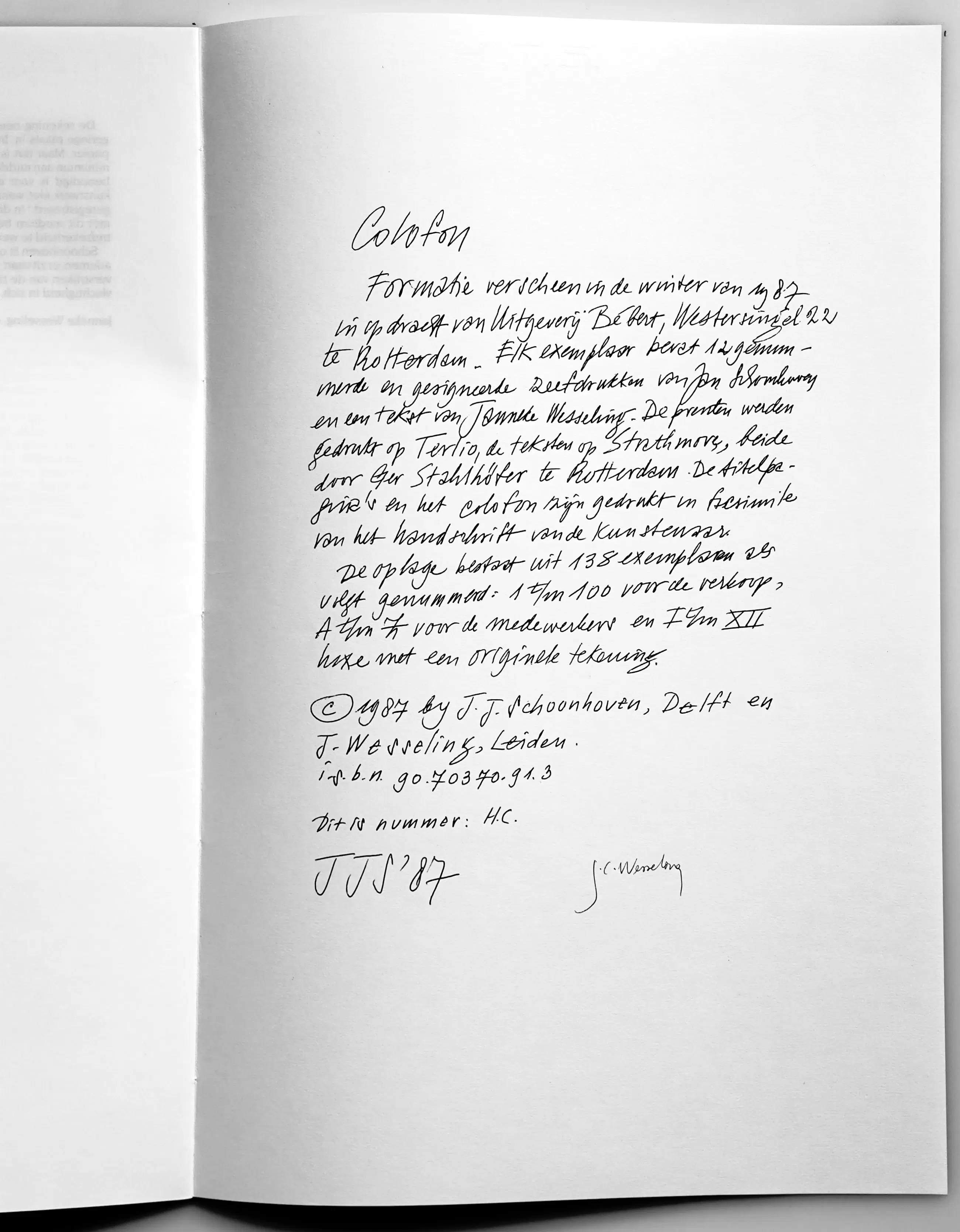 Ik heb deze serie zeefdrukken in 1987 in opdracht van Bebért te Rotterdam gemaakt. De plastic map vertoont een vouw maar heeft geen invloed op de binnenzijde. De zeefdrukken zijn altijd in mijn bezit geweest en verkeren in een uitstekende staat. Ze zijn linksonder gesigneerd en rechtsonder H.C.