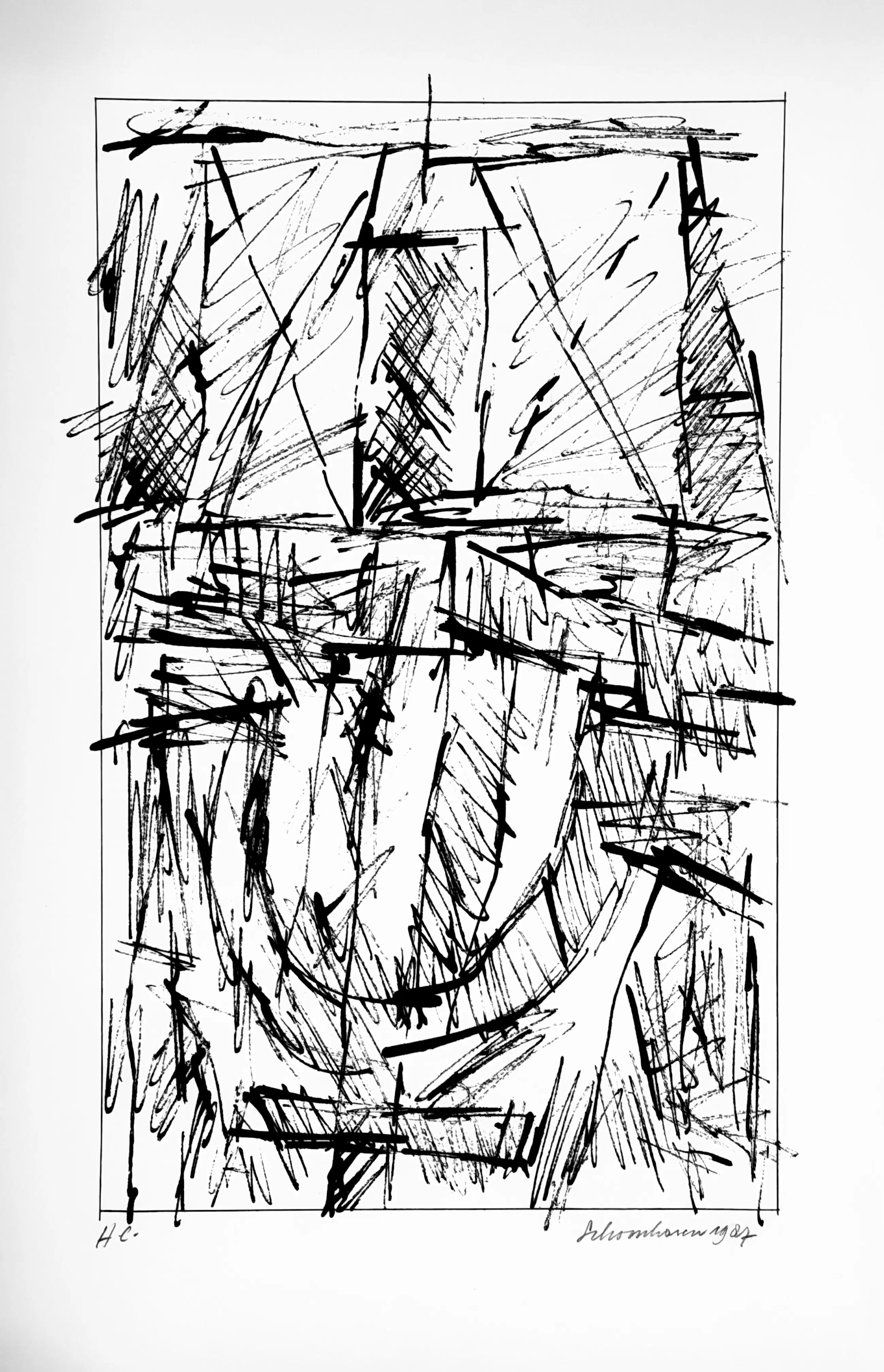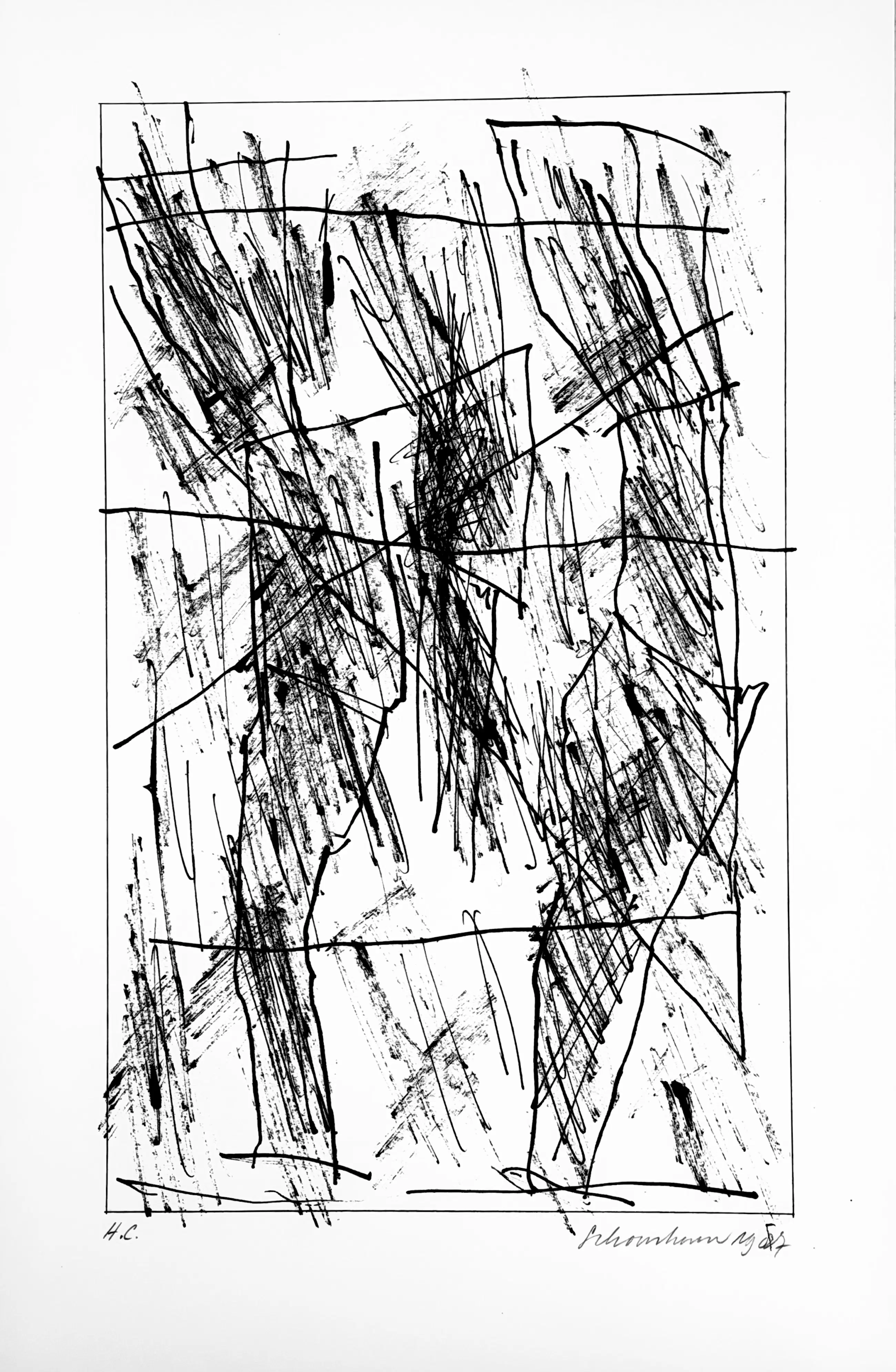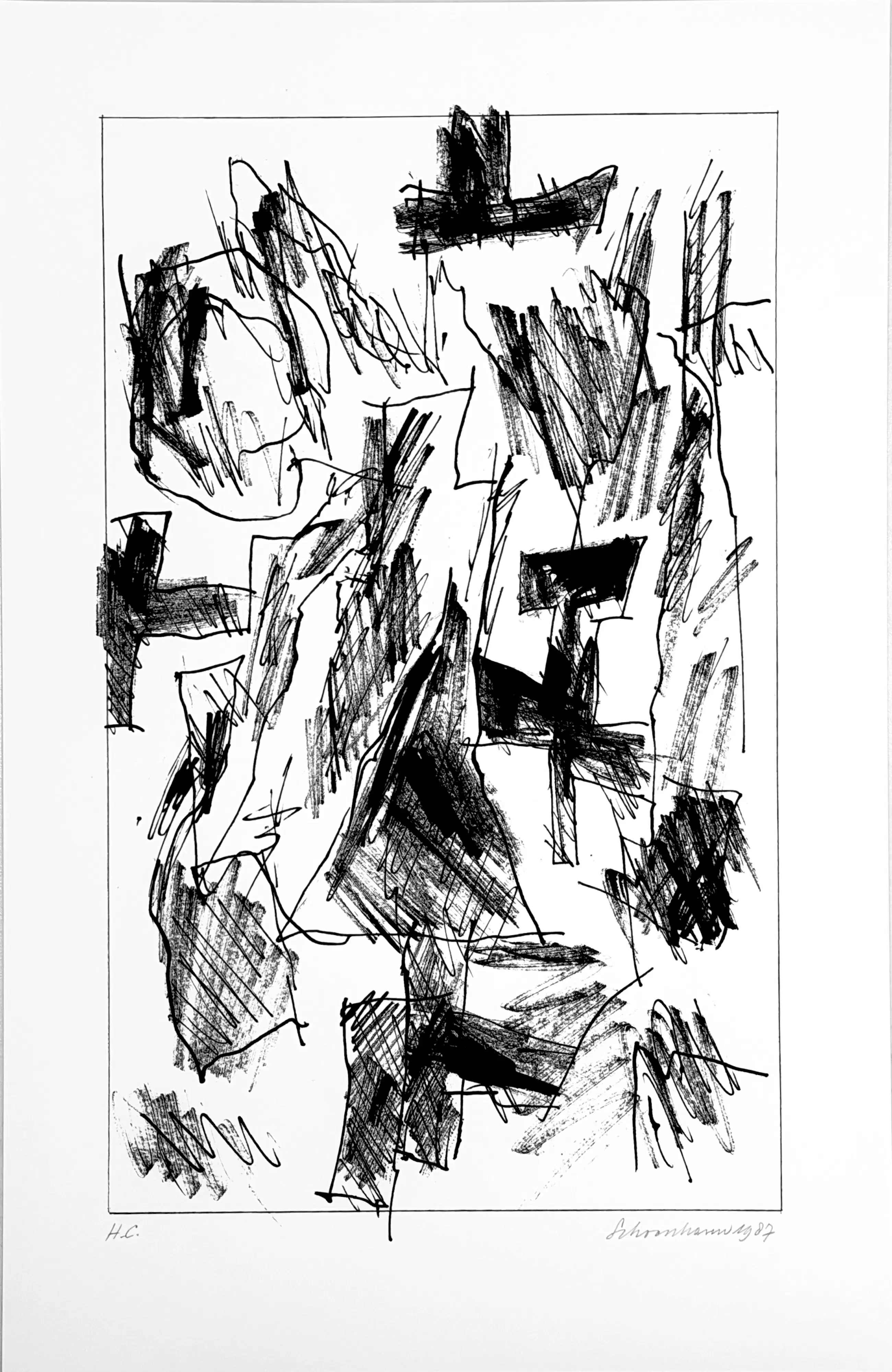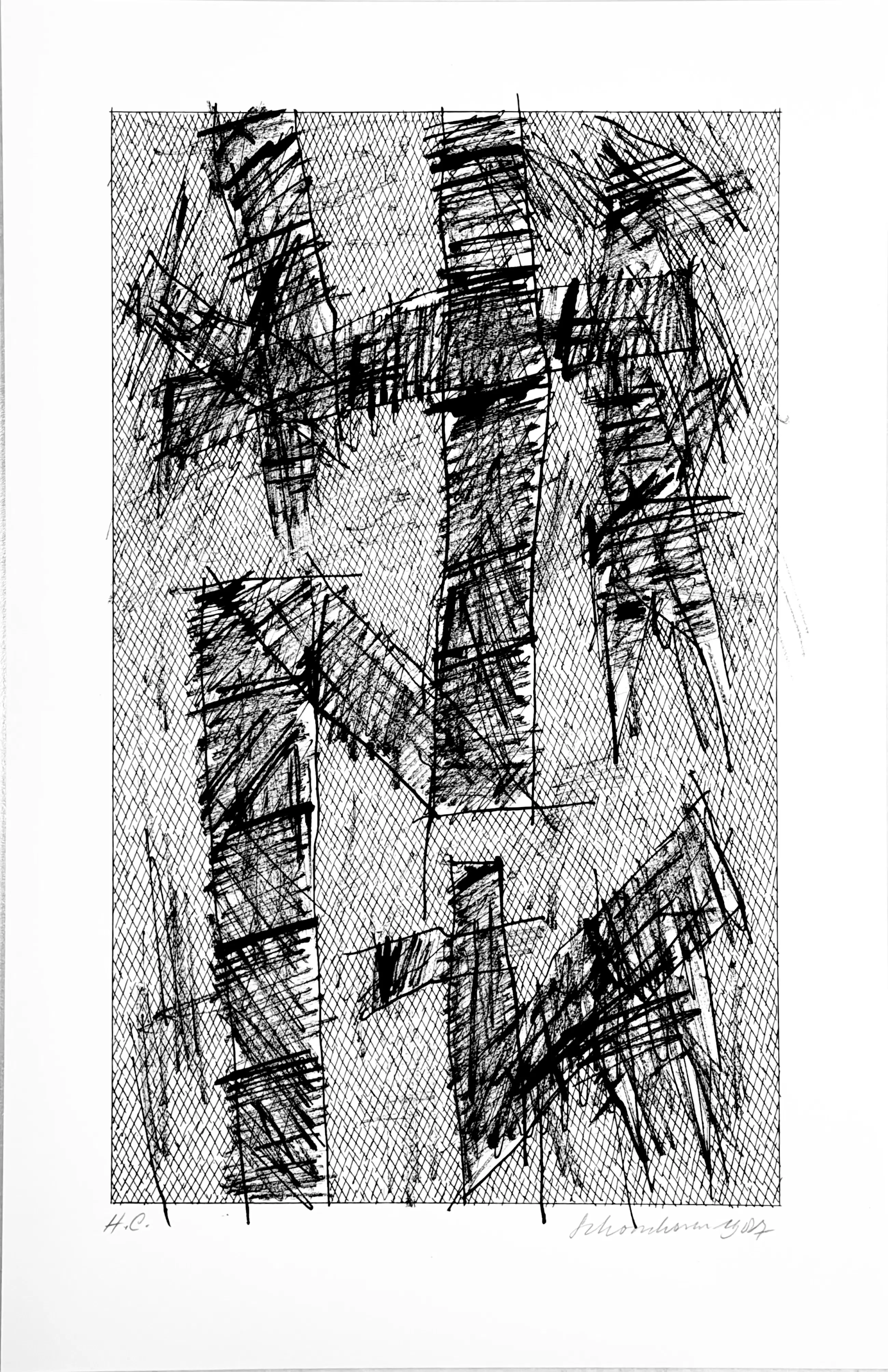 Ik heb deze serie zeefdrukken in 1987 in opdracht van Bebért te Rotterdam gemaakt. De plastic map vertoont een vouw maar heeft geen invloed op de binnenzijde. De zeefdrukken zijn altijd in mijn bezit geweest en verkeren in een uitstekende staat. Ze zijn linksonder gesigneerd en rechtsonder H.C.