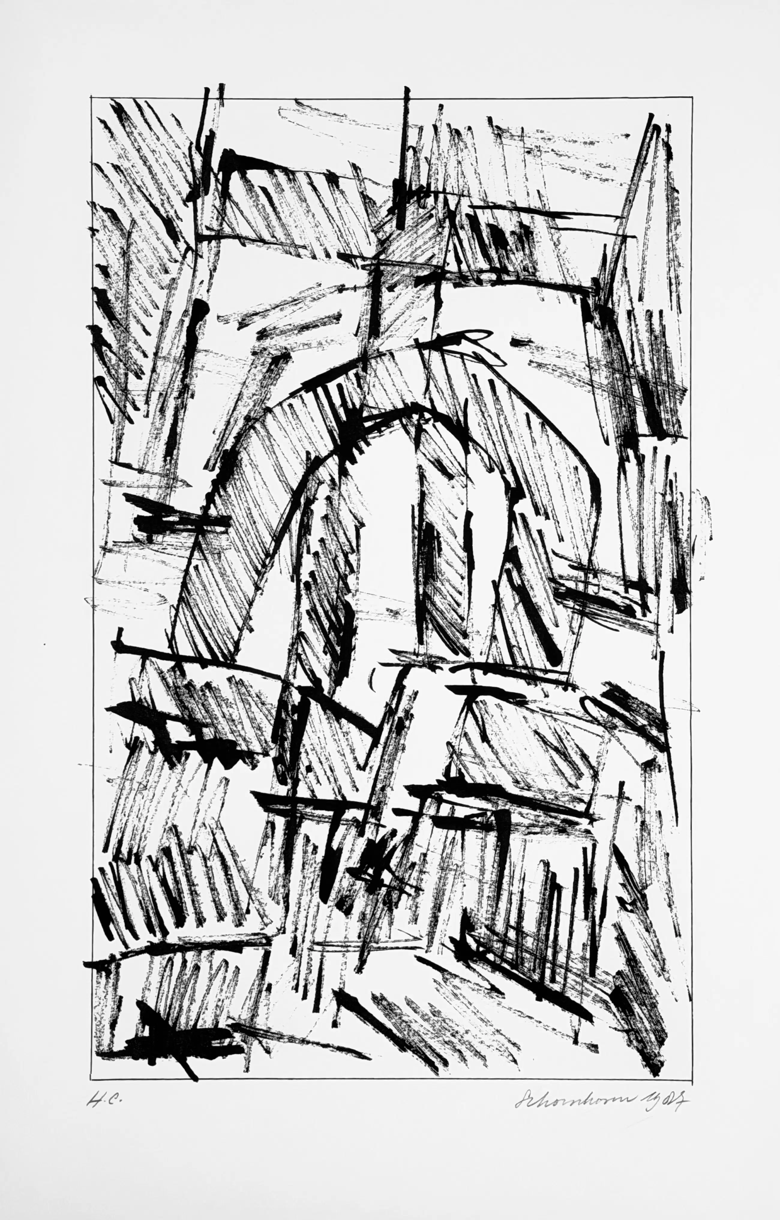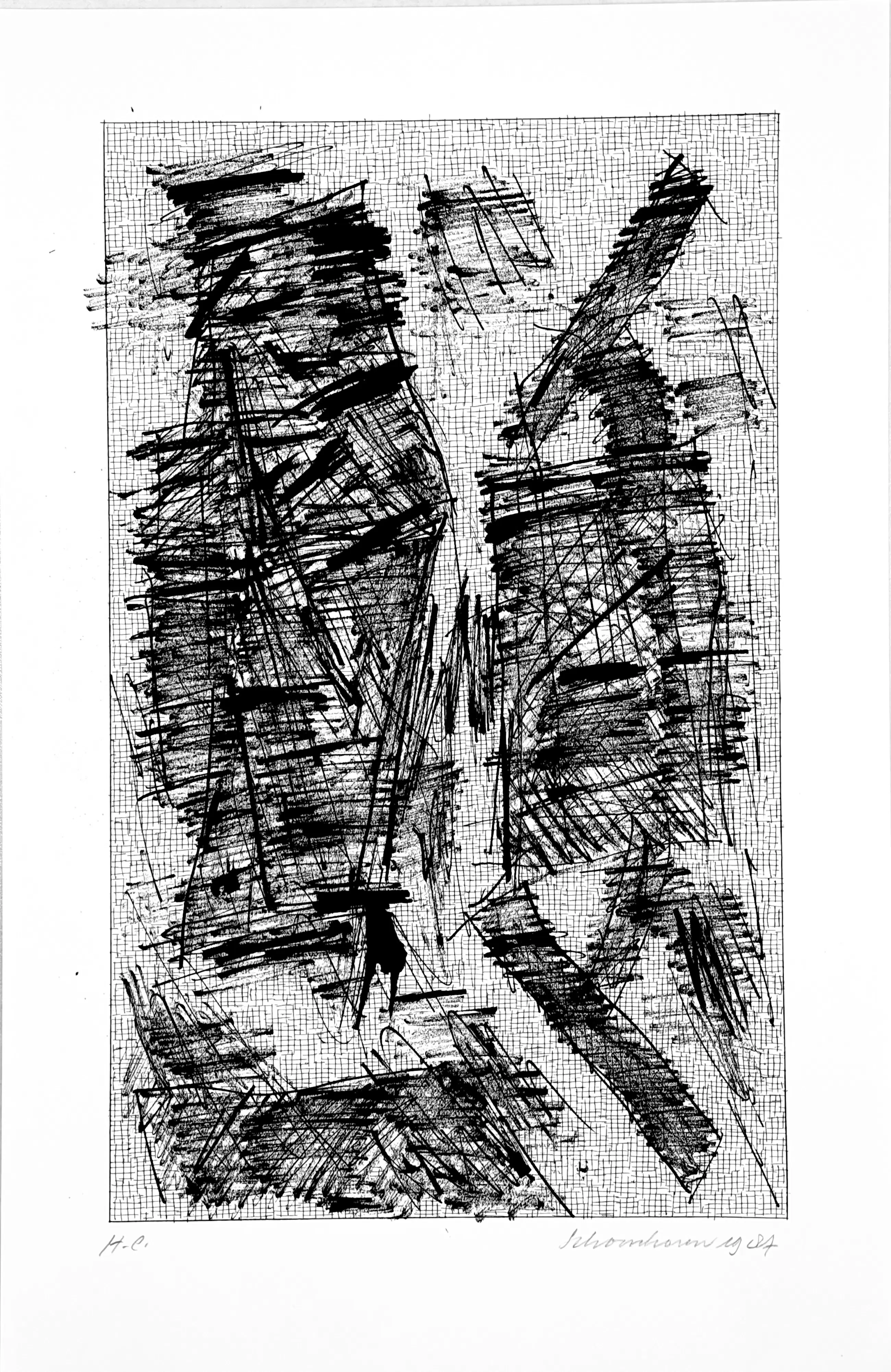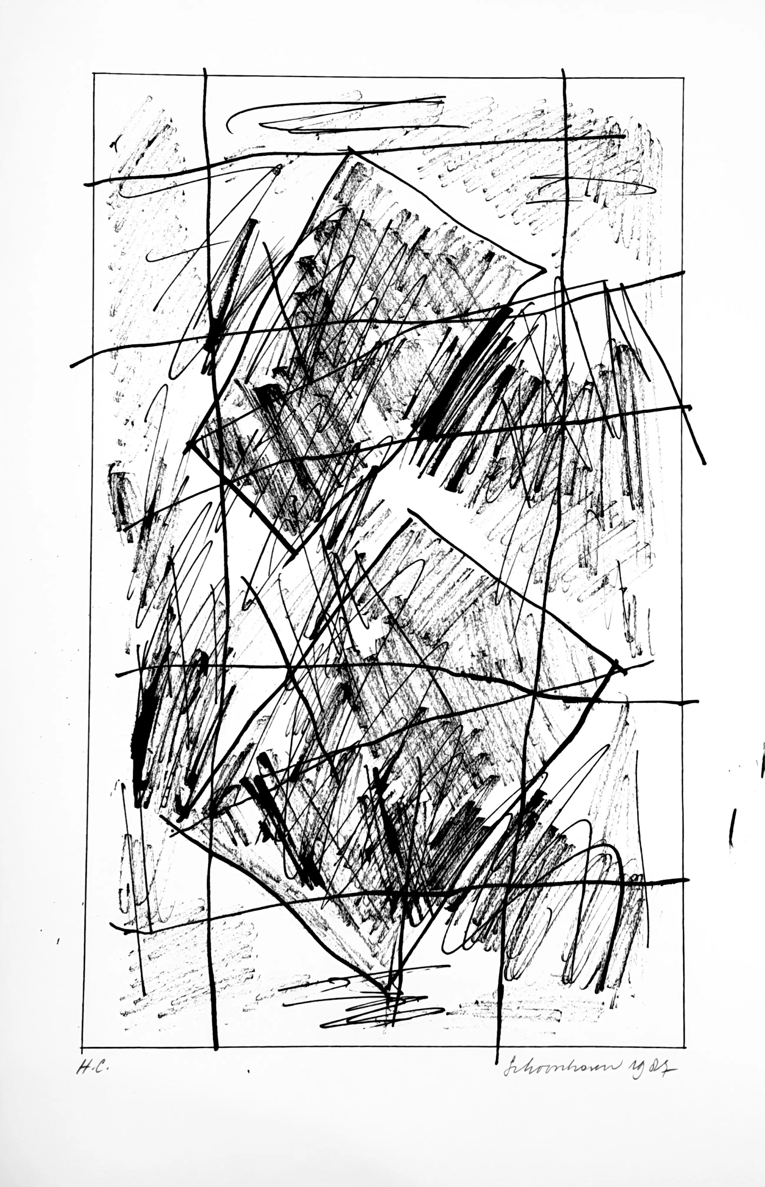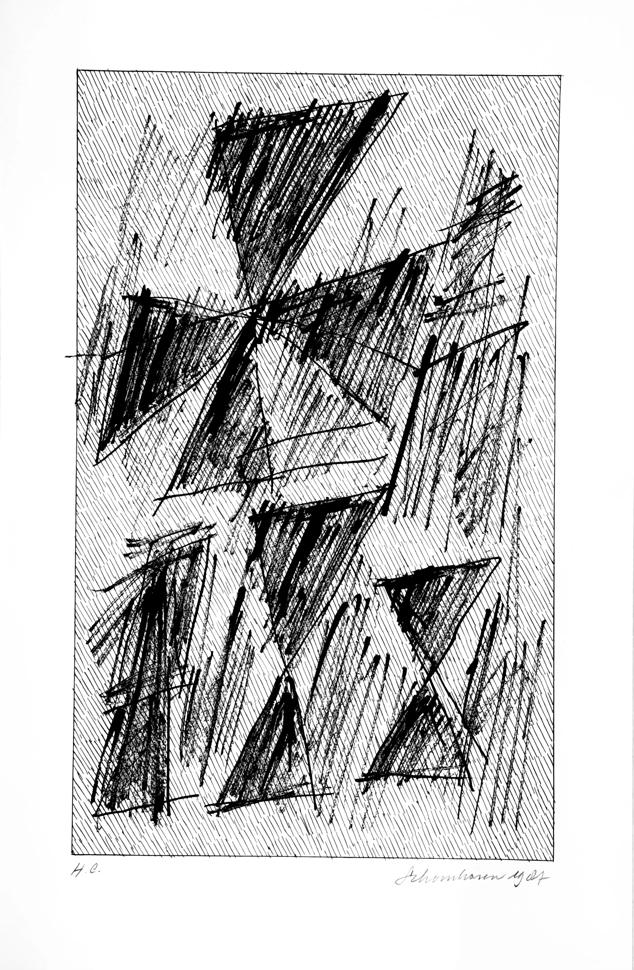 Ik heb deze serie zeefdrukken in 1987 in opdracht van Bebért te Rotterdam gemaakt. De plastic map vertoont een vouw maar heeft geen invloed op de binnenzijde. De zeefdrukken zijn altijd in mijn bezit geweest en verkeren in een uitstekende staat. Ze zijn linksonder gesigneerd en rechtsonder H.C.
