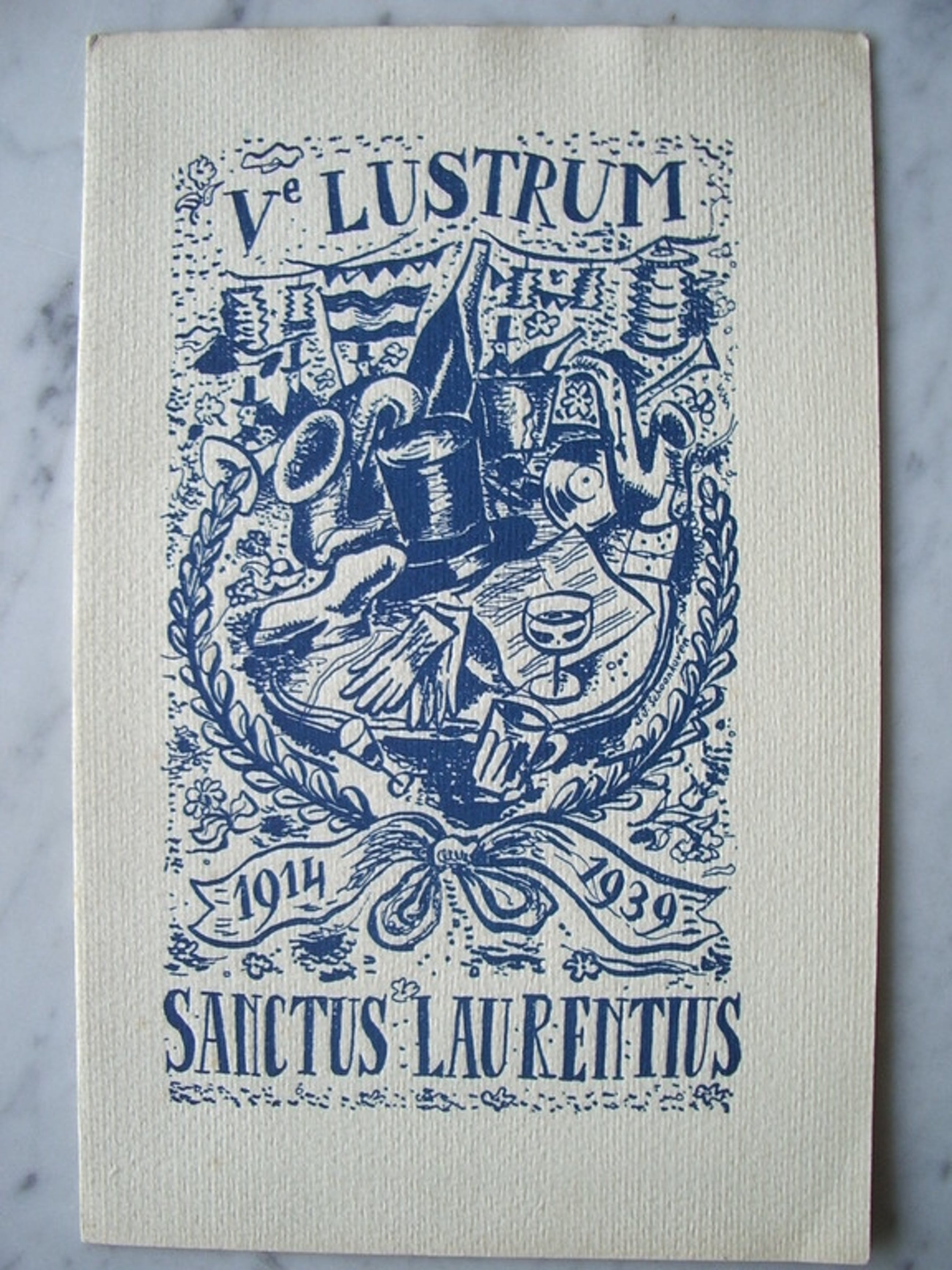 Door Schoonhoven gemaakte menukaart voor het vijfde Lustrum van de Rotterdamse studentenvereniging Sanctus laurentius.