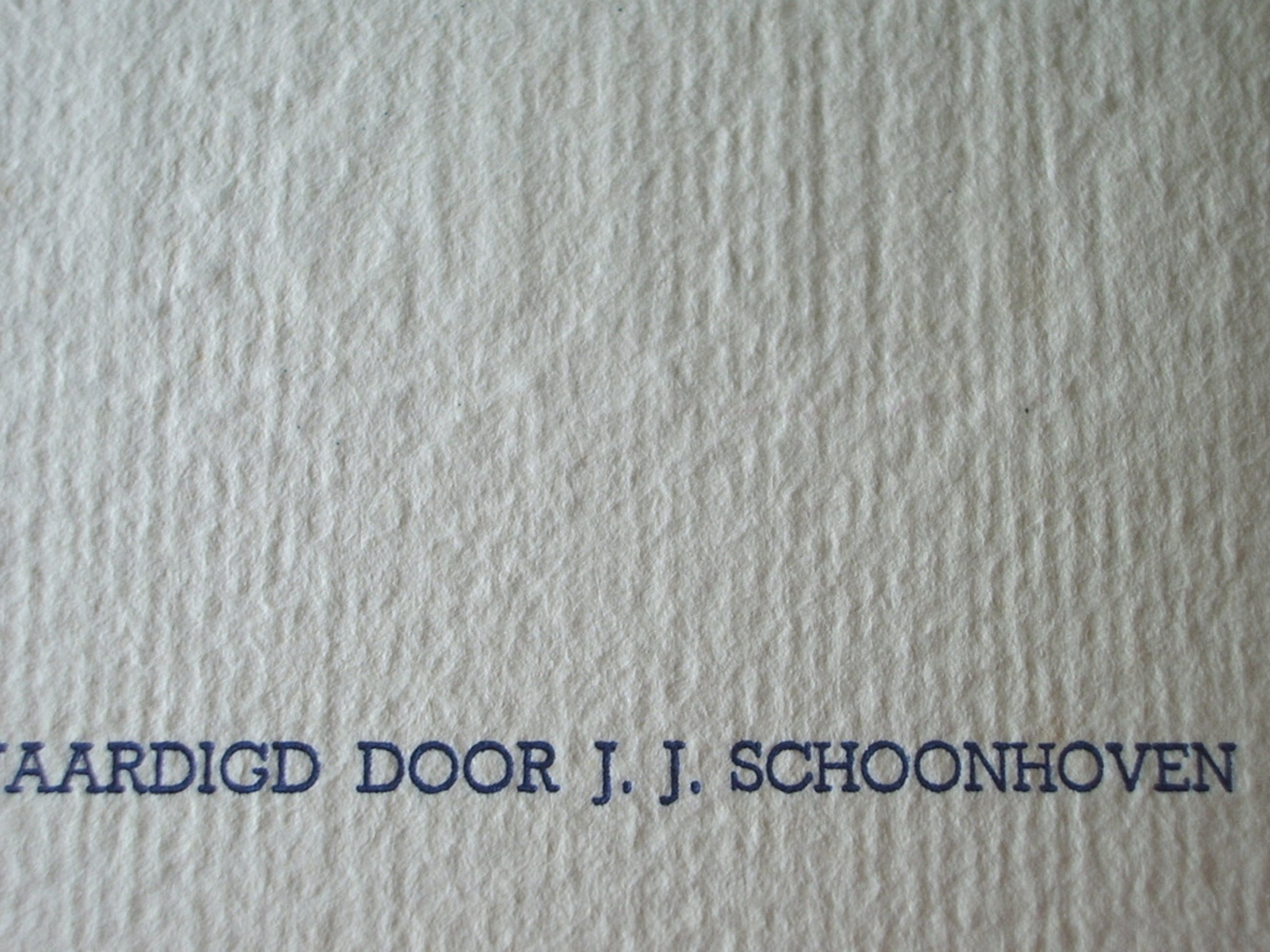 De litho is in de plaat voluit gesigneerd en aan de binnenzijde is in druk vermeld dat de kaart is vervaardigd door J.J. Schoonhoven.