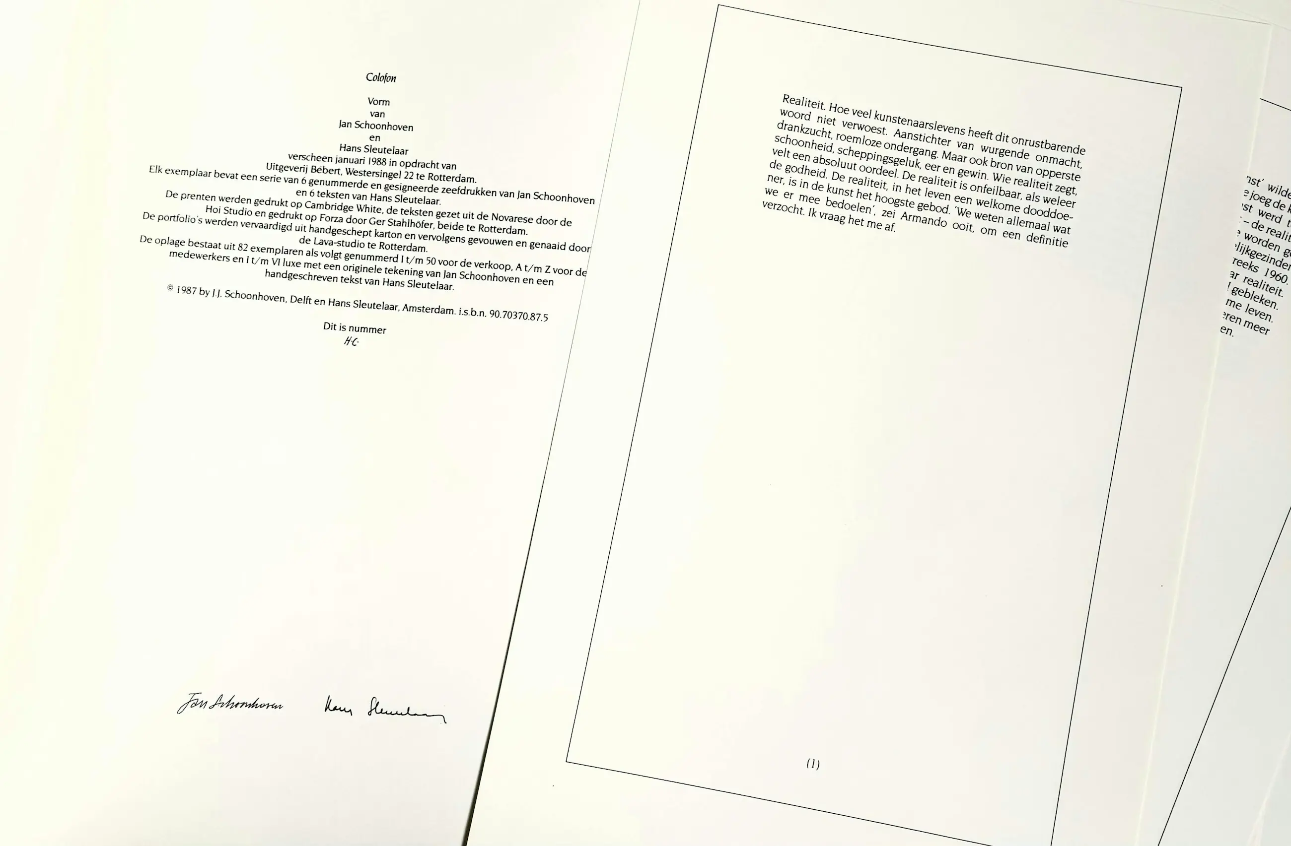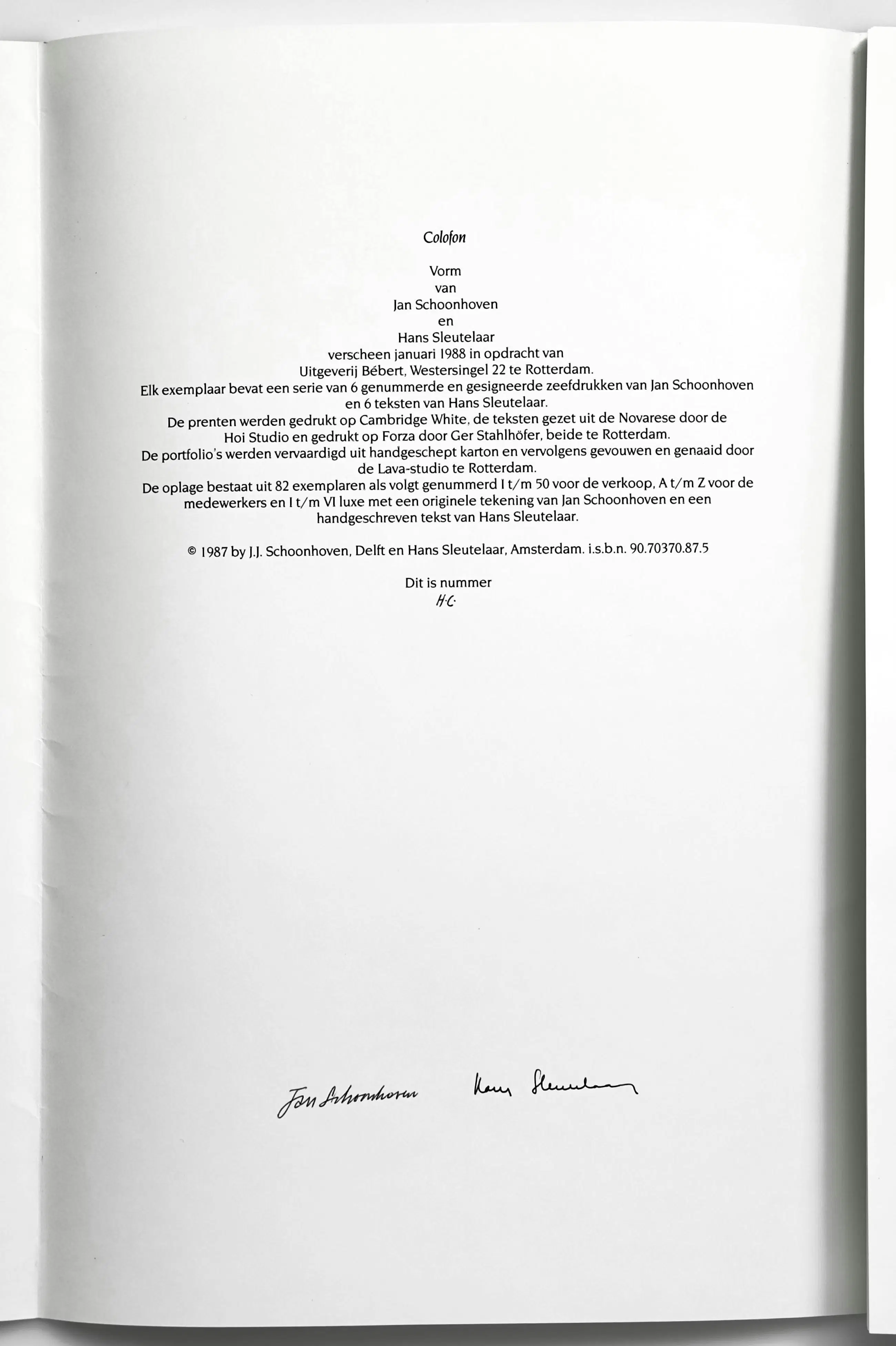 Ik heb deze zeefdrukken in 1988, in opdracht van Galerie Bébert, gemaakt in een oplage van 82 exemplaren. Elk exemplaar bevat een serie van 6 genummerde en gesigneerde zeefdrukken van Jan Schoonhoven en 6 teksten van Hans Sleutelaar. Deze set heb ik al jaren in mijn bezit en verkeren in uitstekende staat.