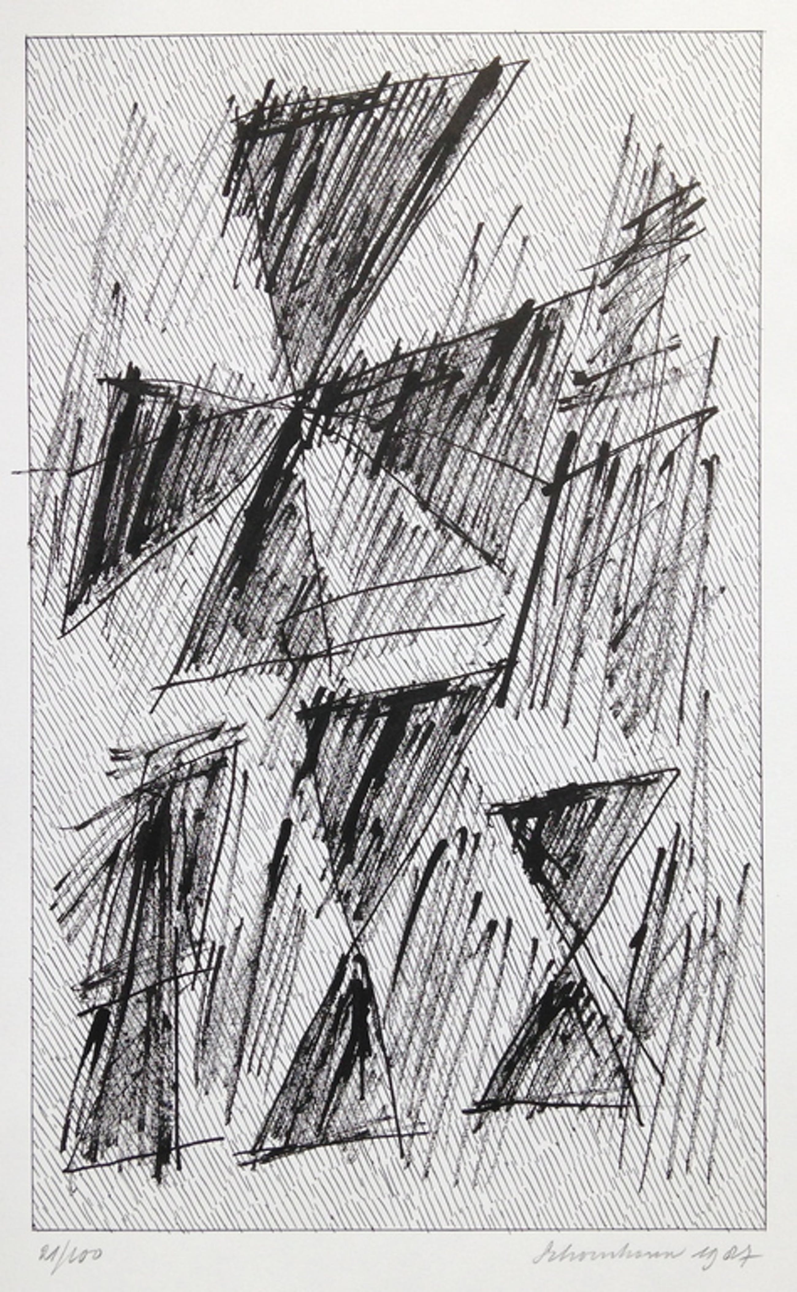 Grote zeefdruk op Terlio papier uit 1987 van Jan Schoonhoven (1914-1994). Rechtsonder handgesigneerd met potlood en gedaateerd. Linksonder genummerd 21/100 (kleine oplage dus)