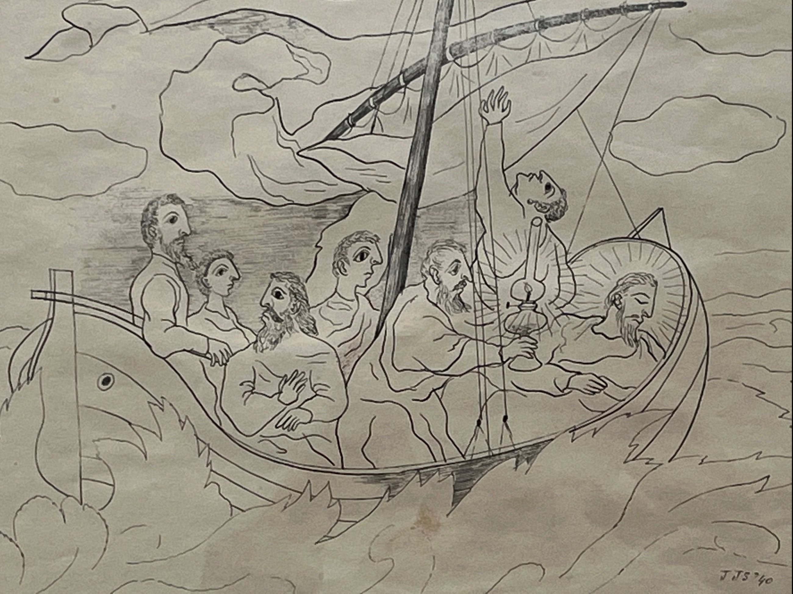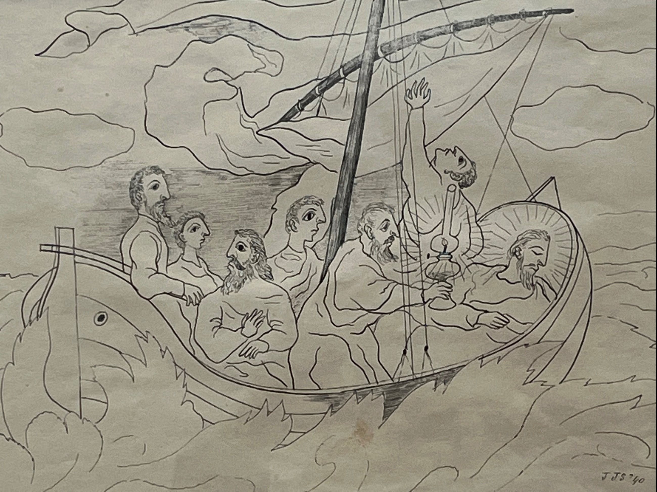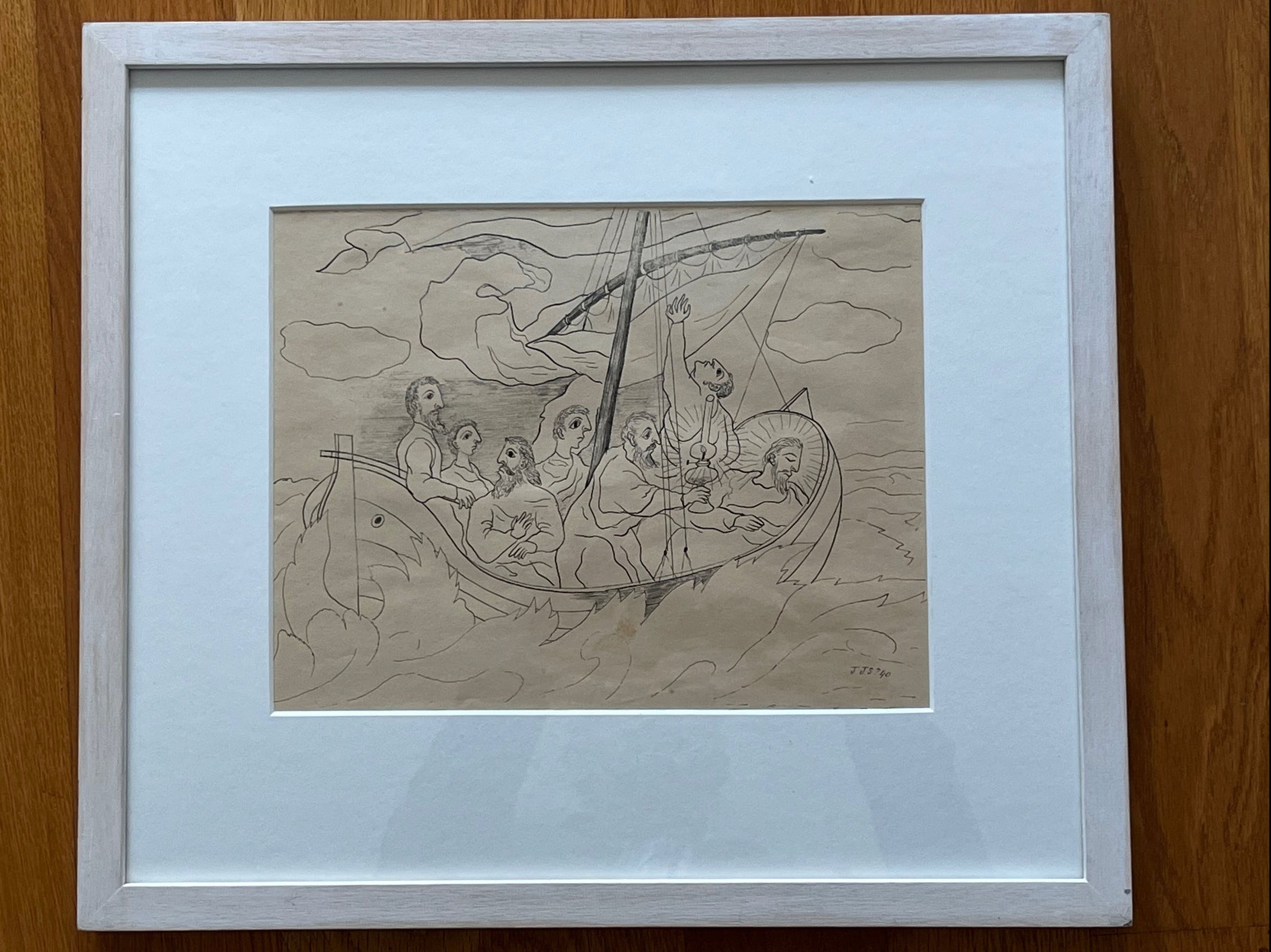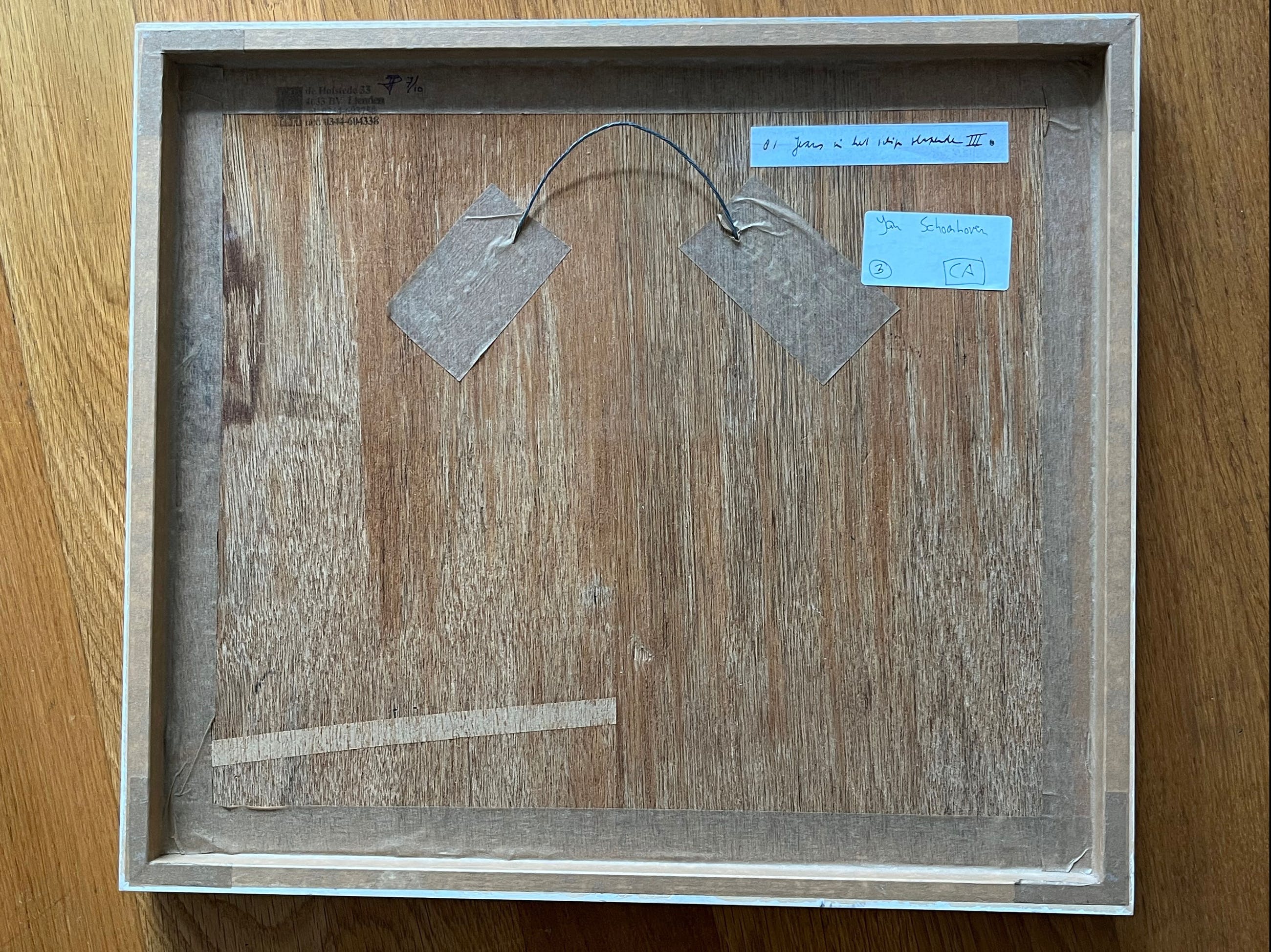 Tekening is in goede staat. Houten, witgewassen lijst ook in goede staat. Kan zo aan de muur.