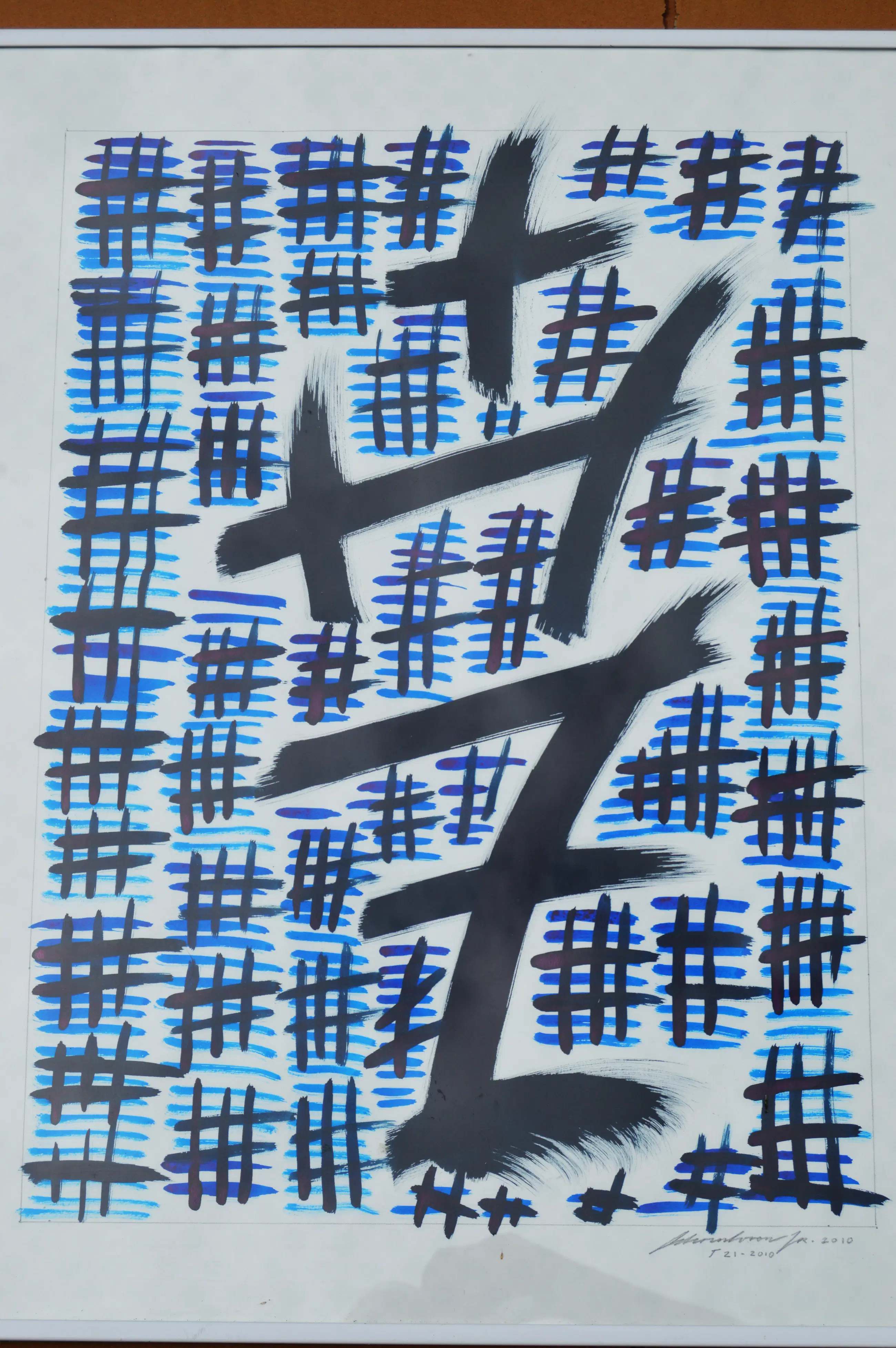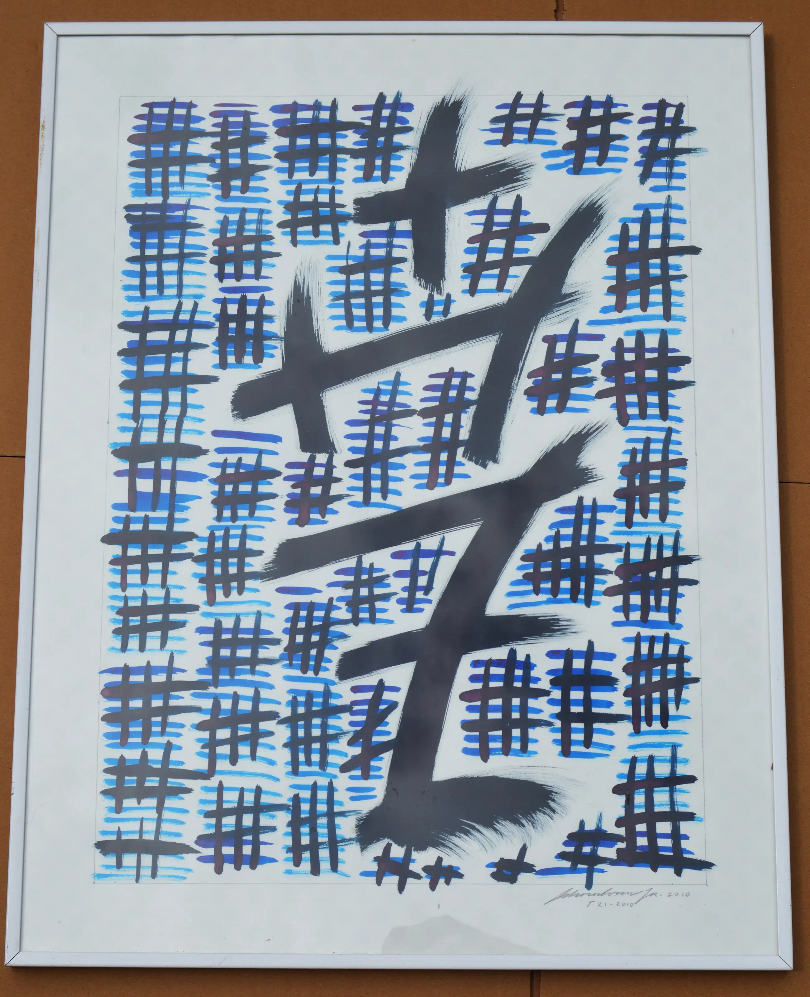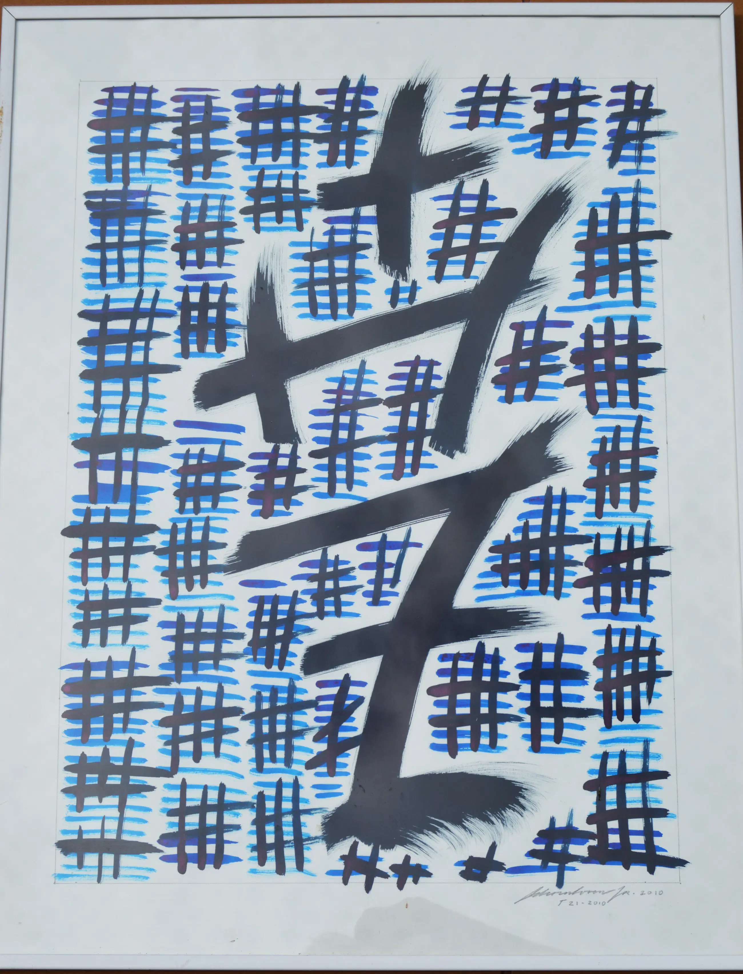 Abstracte voorstelling, rechtsonder gesigneerd, gedateerd 2010, T-21-010, penseel, inkt op papier, beeldmaat: 64 x 49 cm, lijstmaat: 66 x 51 cm.