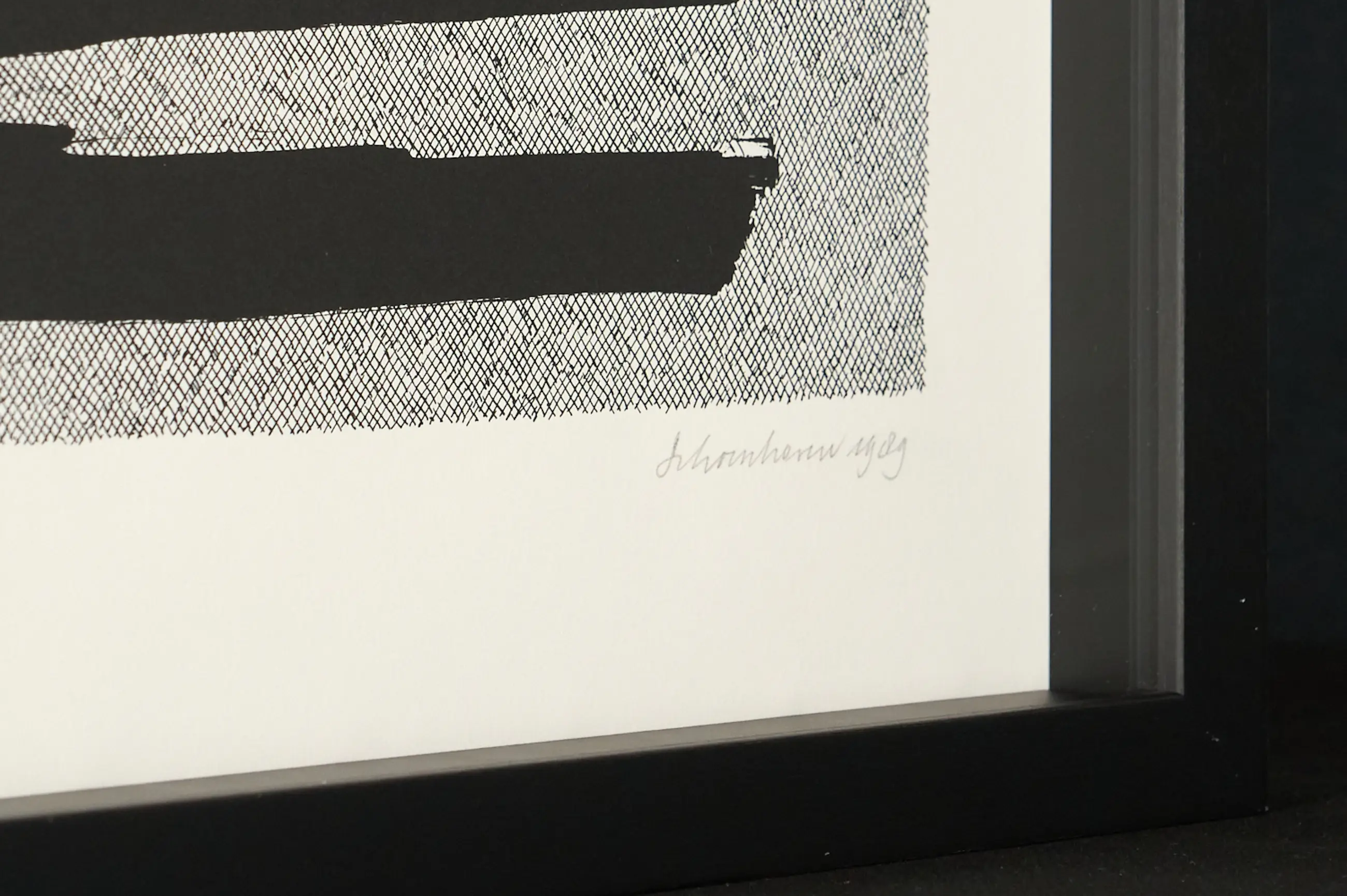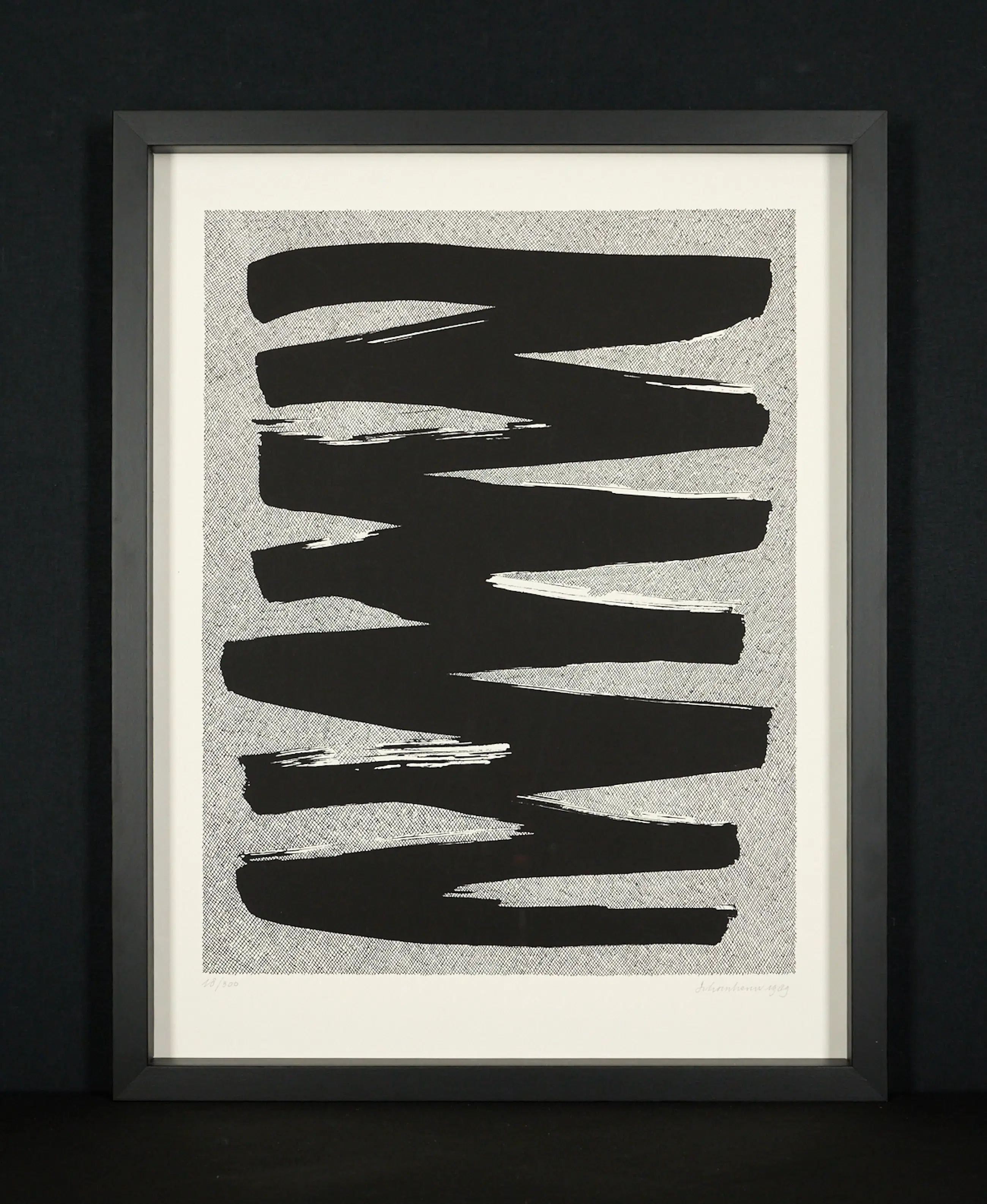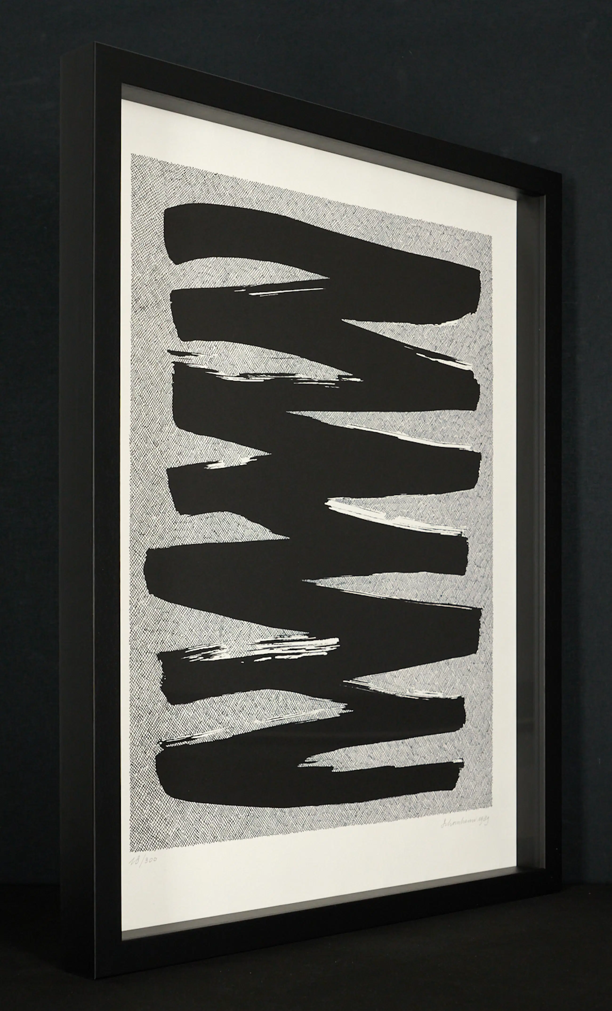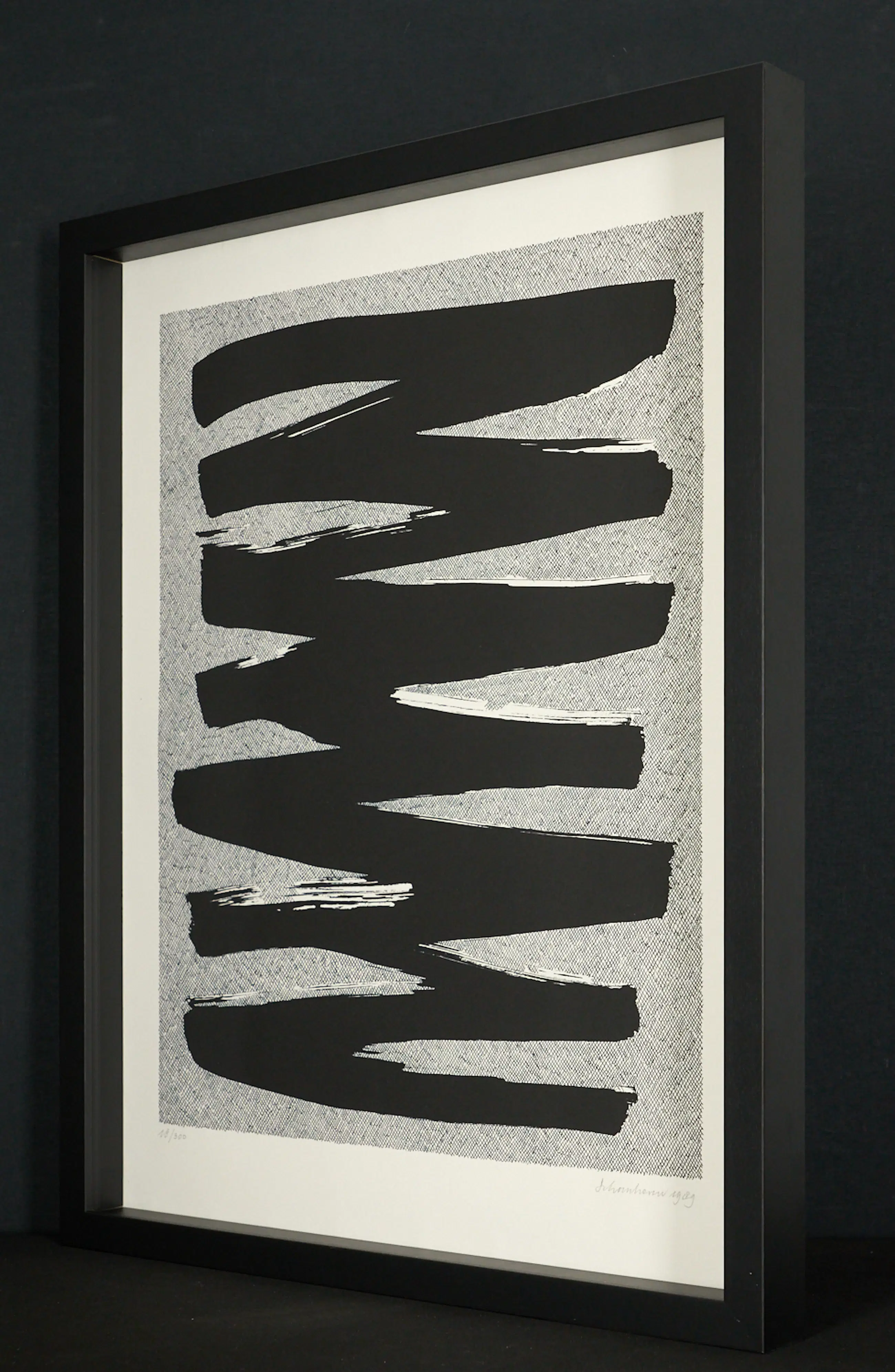 De compositie toont een reeks ritmische, zwarte penseelvormen tegen een fijn gerasterde, textuurachtige achtergrond. Deze zeefdruk benadrukt de spanning tussen structuur en spontaniteit, een kenmerkend aspect van Schoonhovens werk. De grote zwarte vormen ogen krachtig en resoluut, terwijl de achterliggende grijstoon diepte en subtiliteit toevoegt.