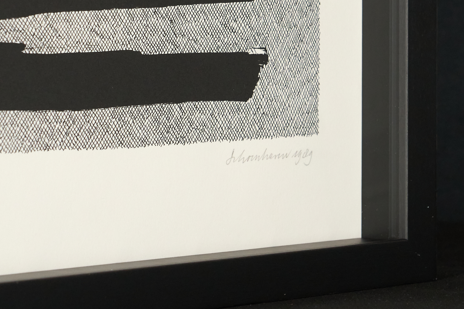 De compositie toont een reeks ritmische, zwarte penseelvormen tegen een fijn gerasterde, textuurachtige achtergrond. Deze zeefdruk benadrukt de spanning tussen structuur en spontaniteit, een kenmerkend aspect van Schoonhovens werk. De grote zwarte vormen ogen krachtig en resoluut, terwijl de achterliggende grijstoon diepte en subtiliteit toevoegt.