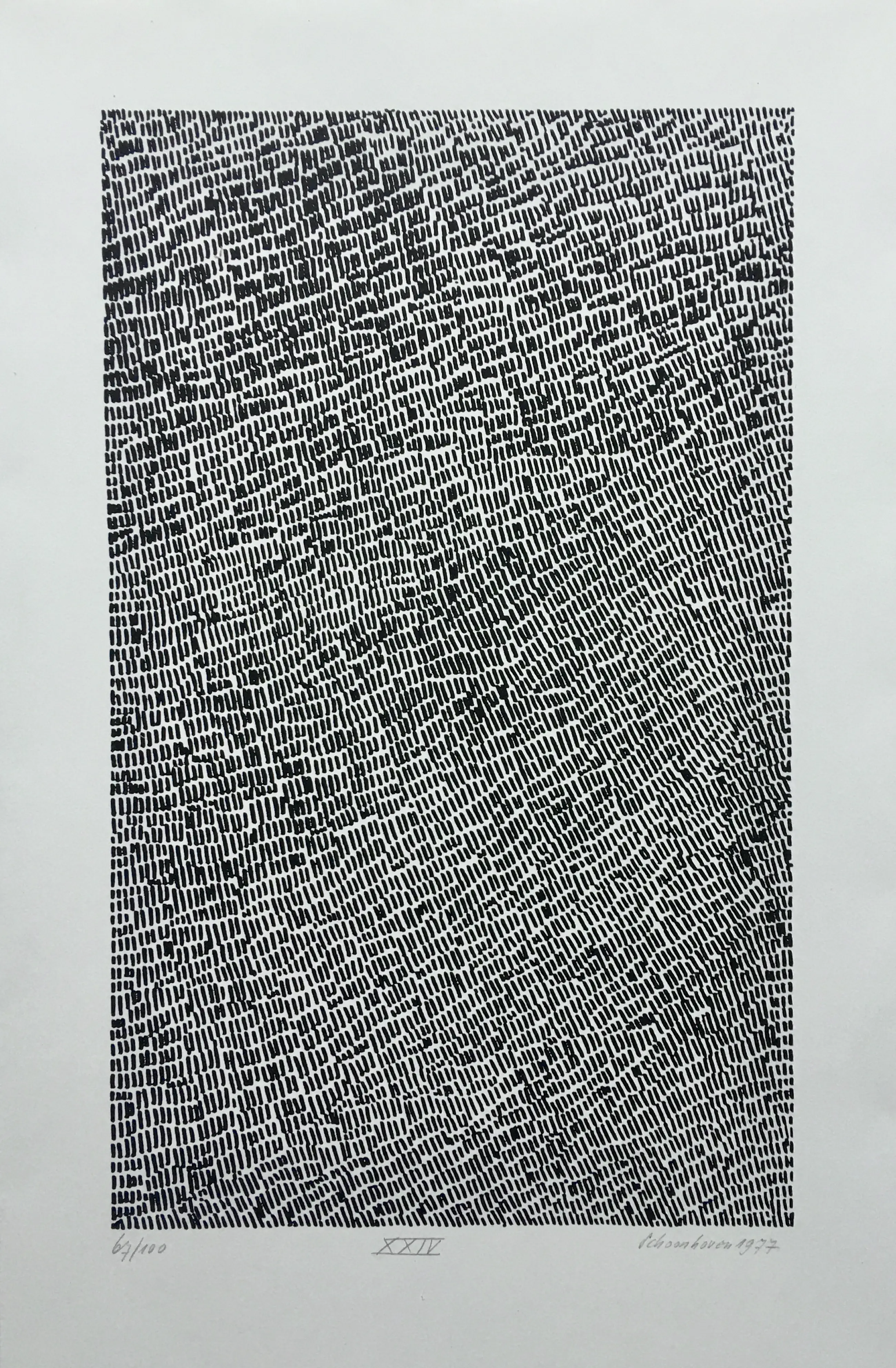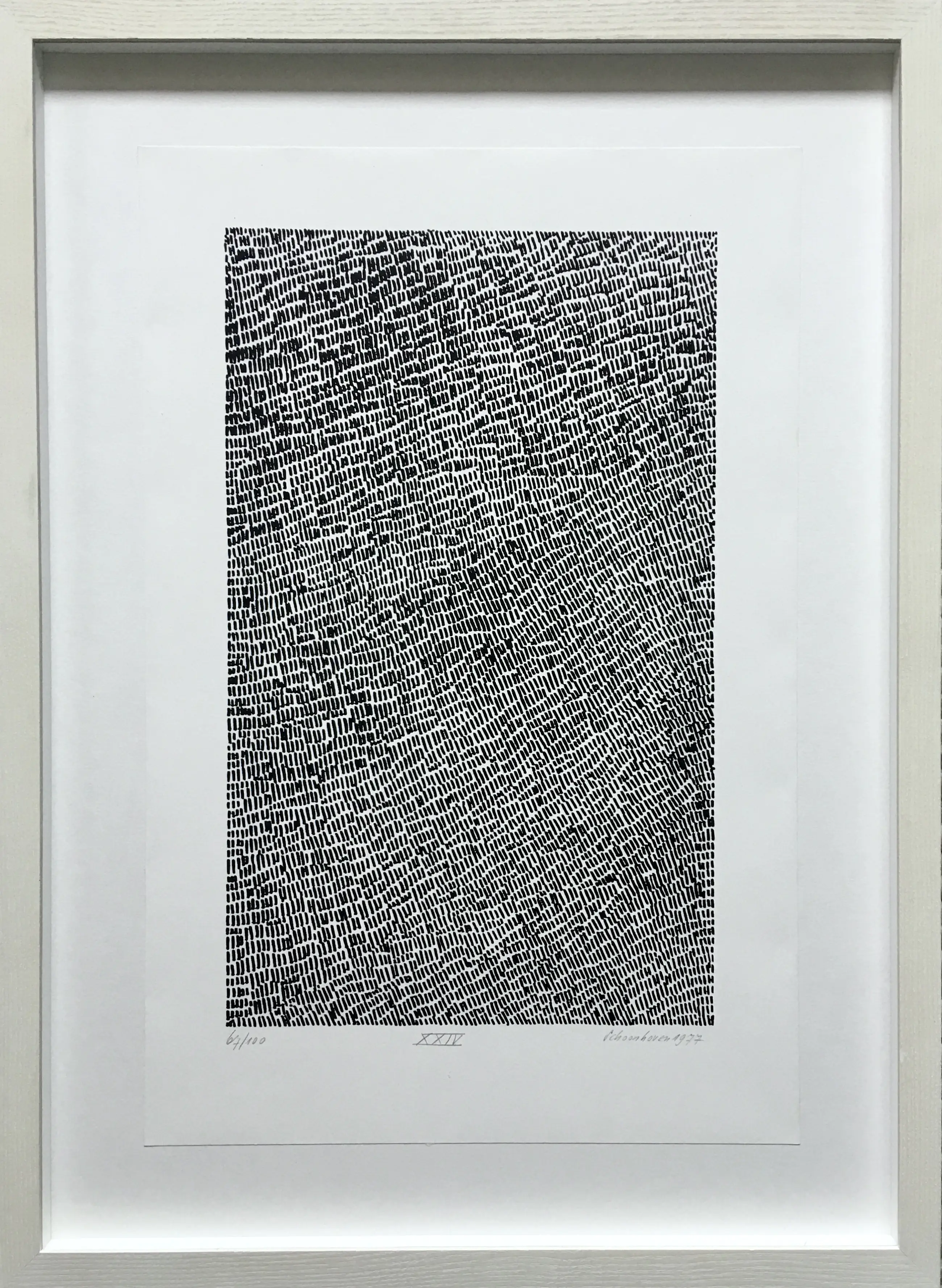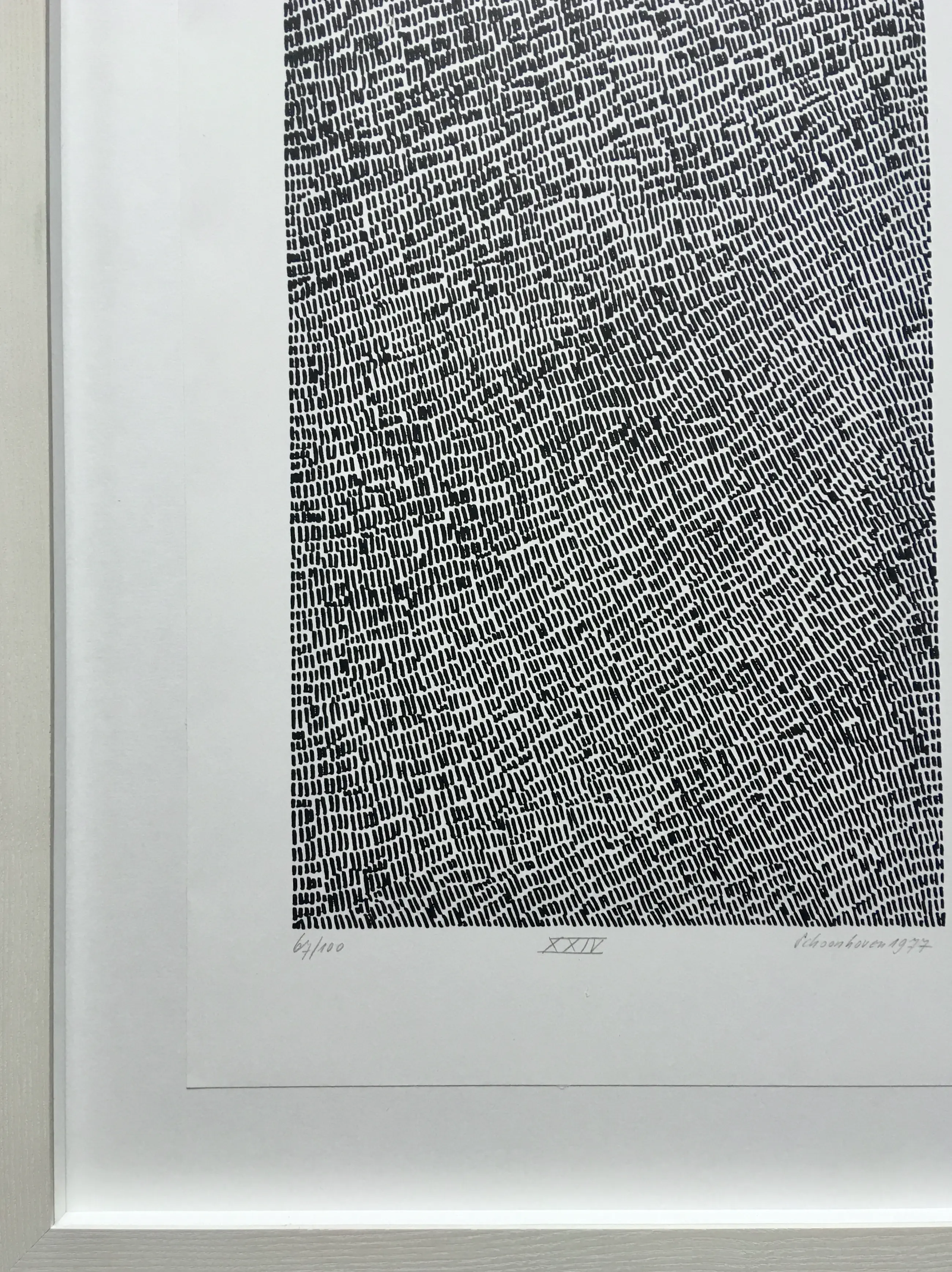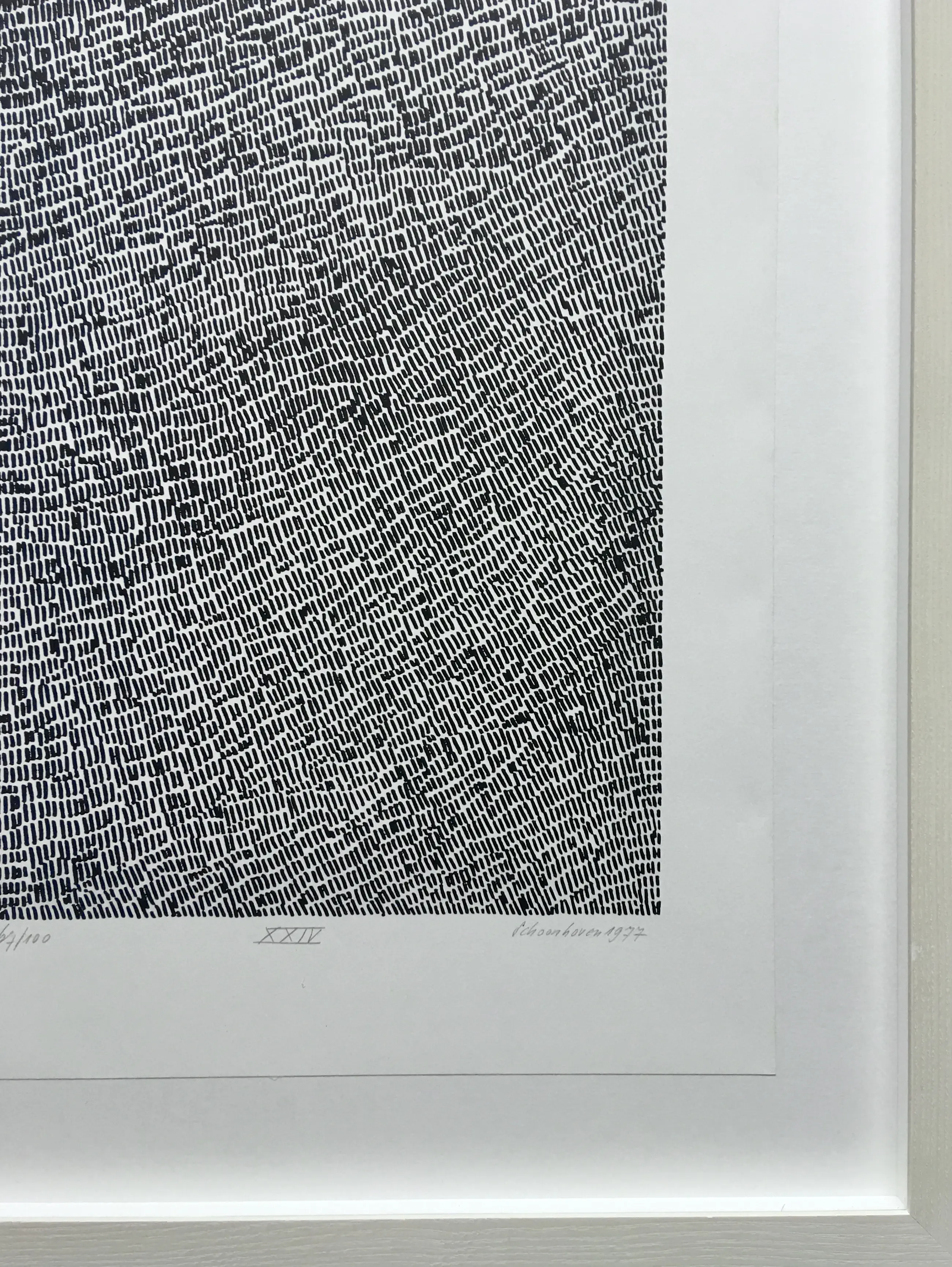 Een zeer fraaie zeefdruk van Jan Schoonhoven uit 1977. Het werk is gesigneerd en genummerd 67/100. Mooi verdiept ingelijst in wit houten lijst met museumglas.