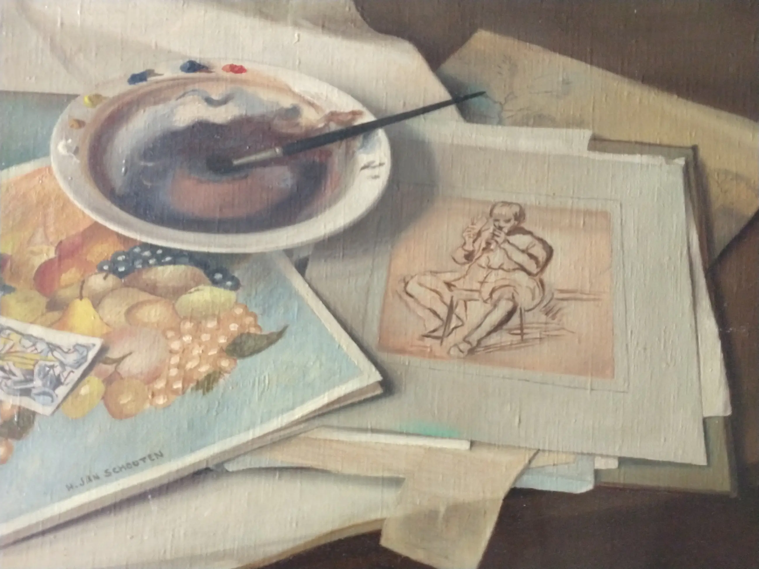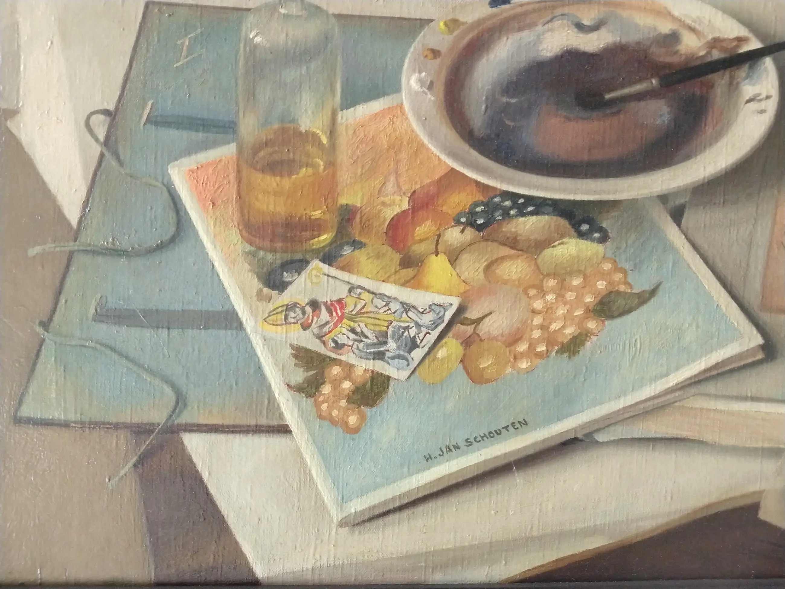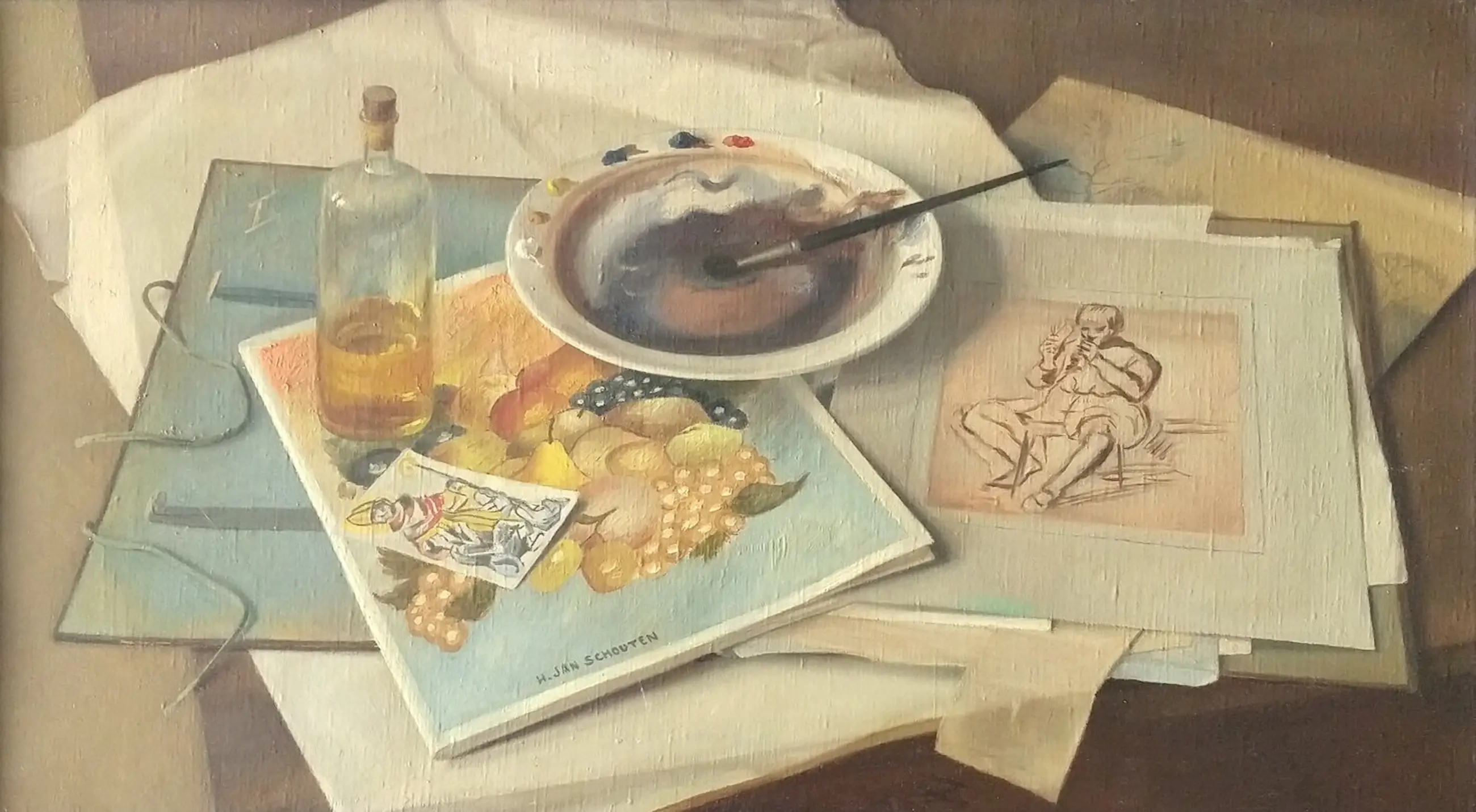 Jan Schouten (1906-1987). Realistisch stilleven met kunstenaarsattributen. Olieverf op doek.
